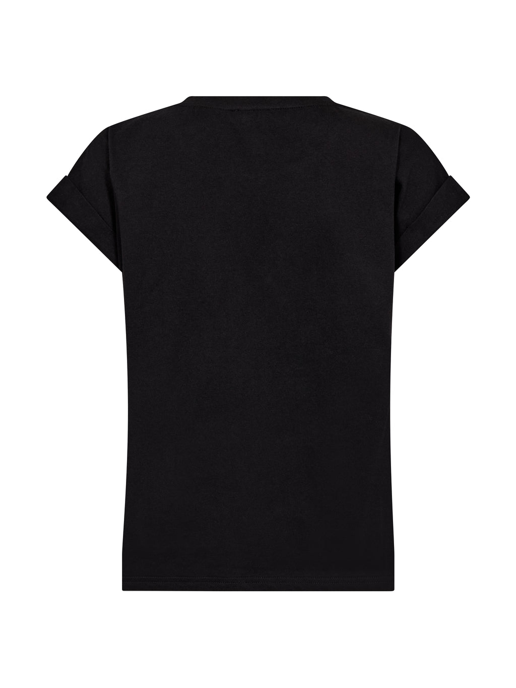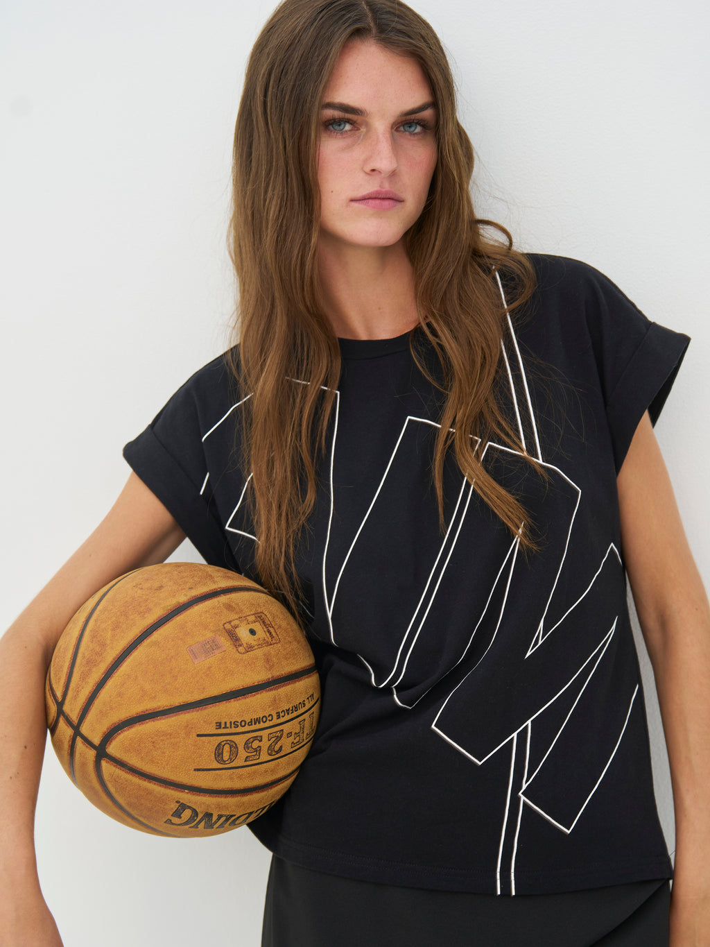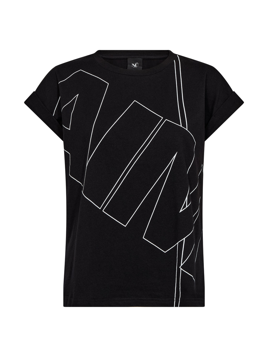 Denne T-skjorten har et enkelt og røft utseende med rund hals og korte ermer med lett opprulling. Det hvite trykket på forsiden gir en tydelig visuell uttrykk, mens baksiden er helt enkel og rolig. Passformen er rett og behagelig, noe som gjør T-skjorten enkel å bruke til hverdags. Bruk den med bukser eller skjørt for et avslappet utseende, eller style den under en blazer for et mer sammensatt uttrykk.
