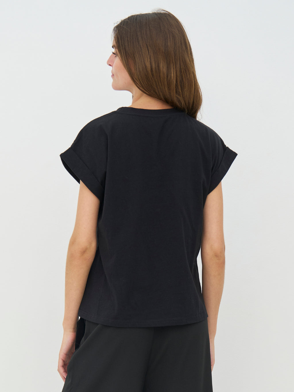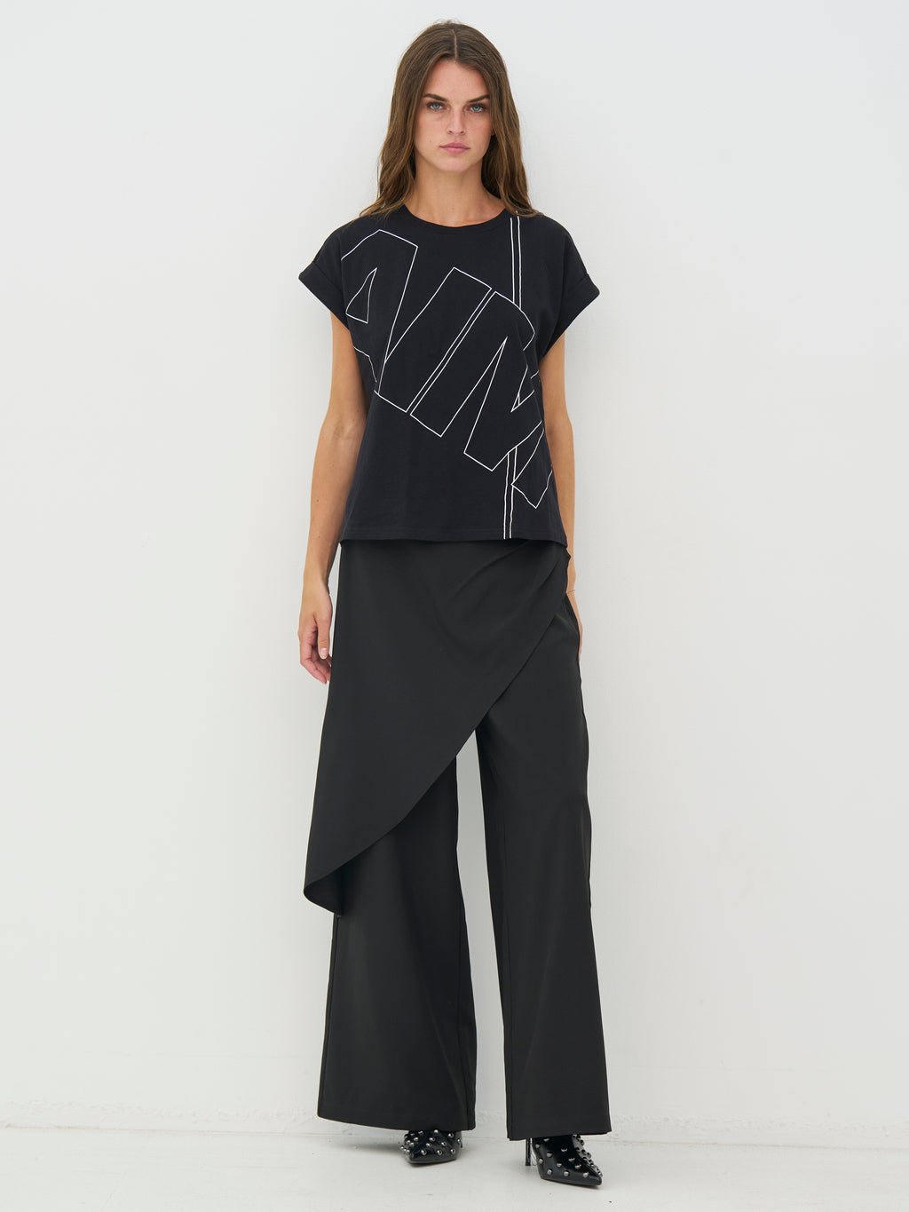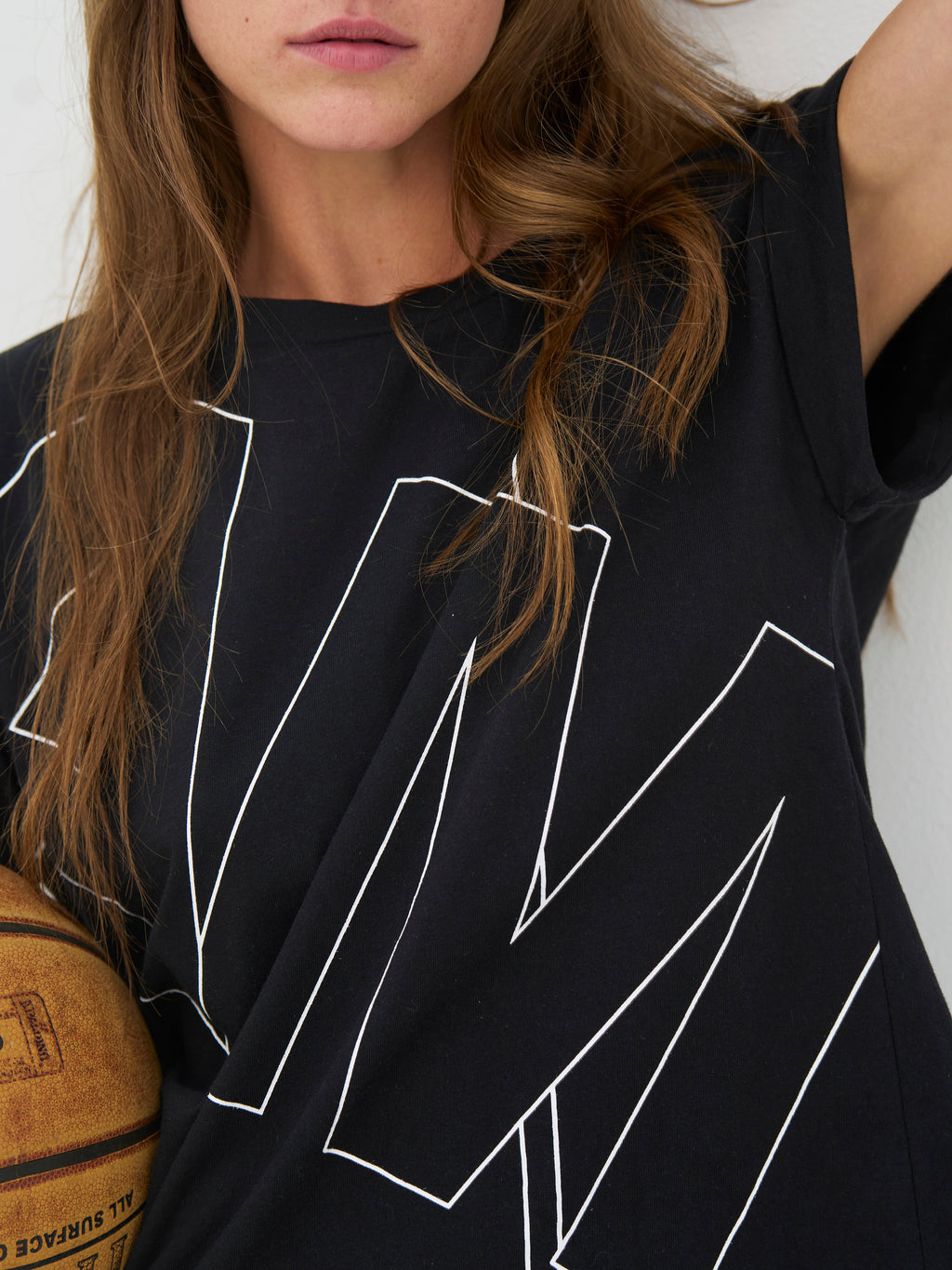 Denne T-skjorten har et enkelt og røft utseende med rund hals og korte ermer med lett opprulling. Det hvite trykket på forsiden gir en tydelig visuell uttrykk, mens baksiden er helt enkel og rolig. Passformen er rett og behagelig, noe som gjør T-skjorten enkel å bruke til hverdags. Bruk den med bukser eller skjørt for et avslappet utseende, eller style den under en blazer for et mer sammensatt uttrykk.