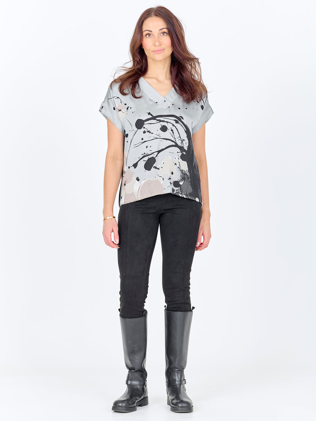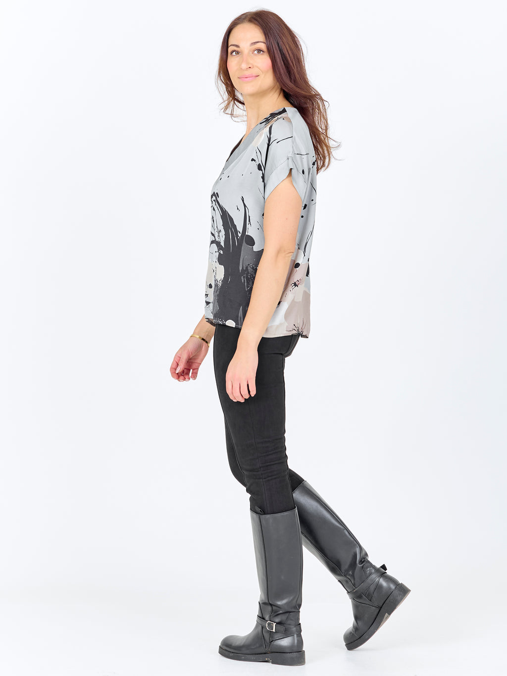 Denne blusen har en enkel fasong med V-utringning og korte ermer, noe som gir et avslappet og anvendelig uttrykk. Mønsteret er både foran og bak, og tilfører karakter og kant. Passformen er rett, så blusen faller pent på kroppen og er lett å style både med bukser og shorts. Bruk den alene til hverdags eller sammen med en lett jakke for en gjennomført look.