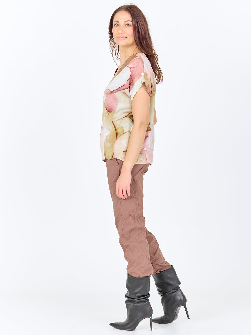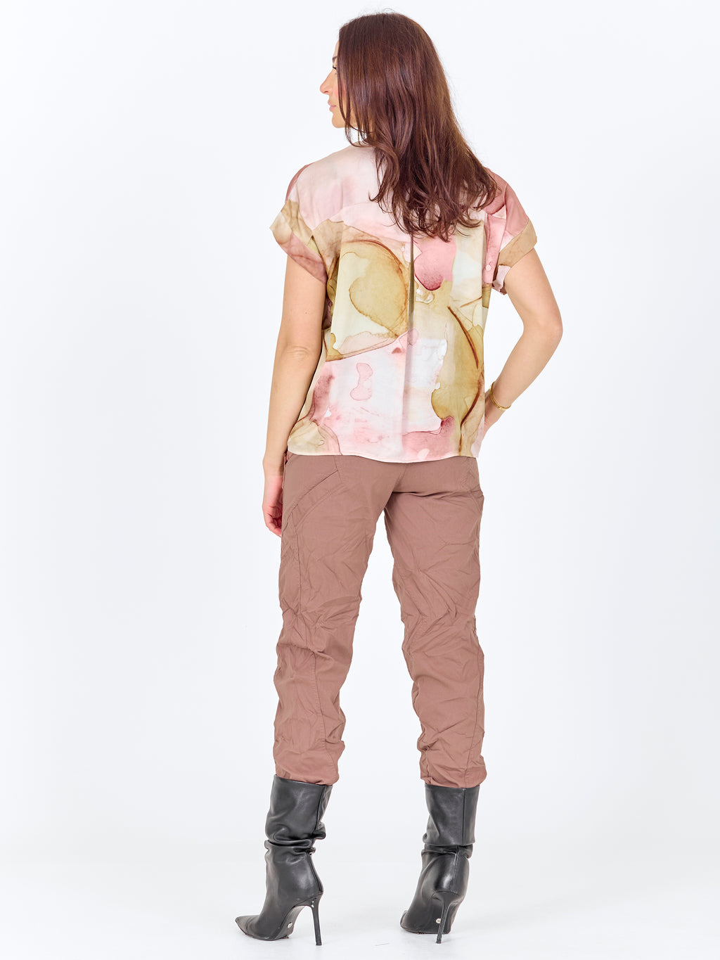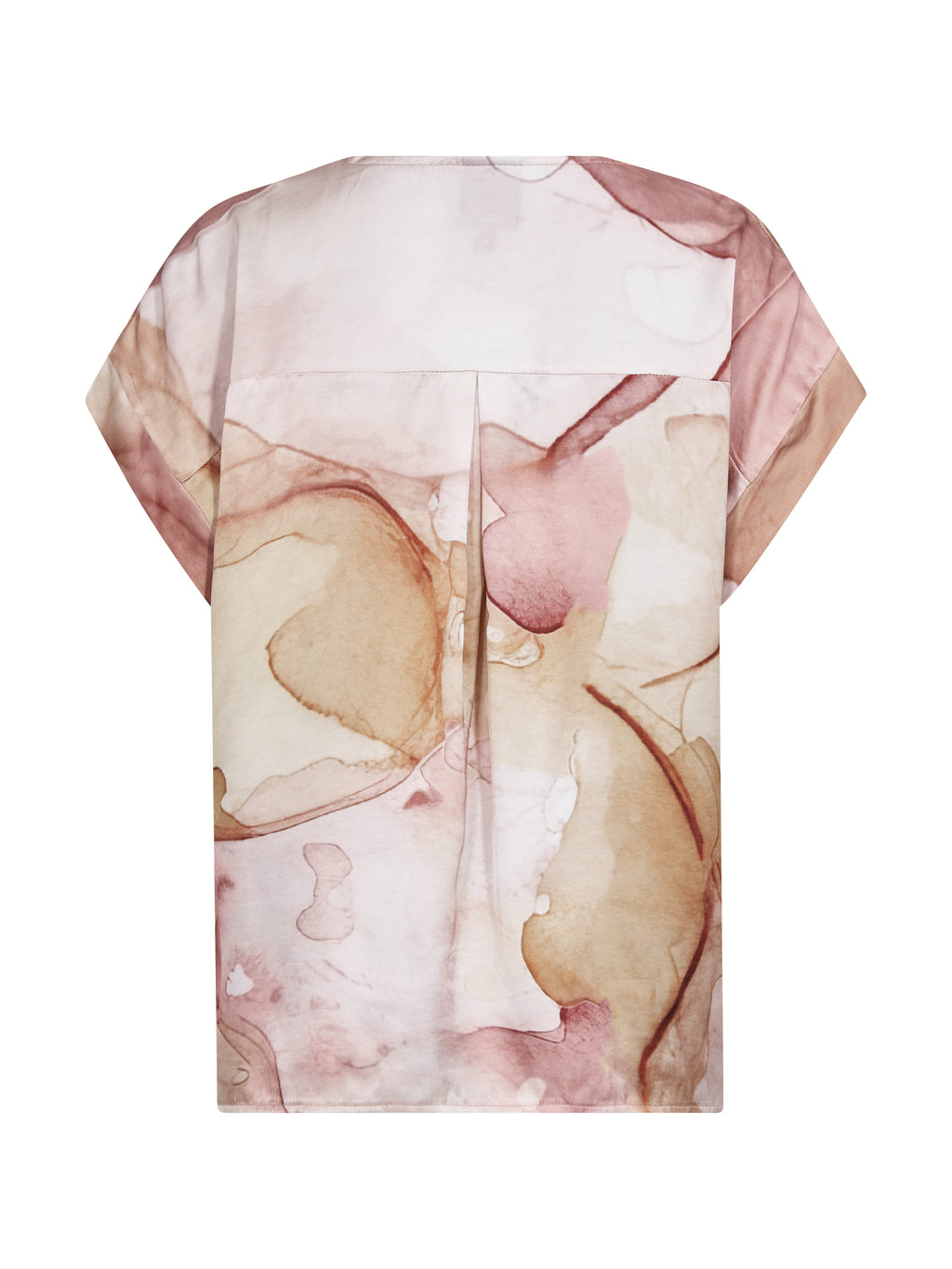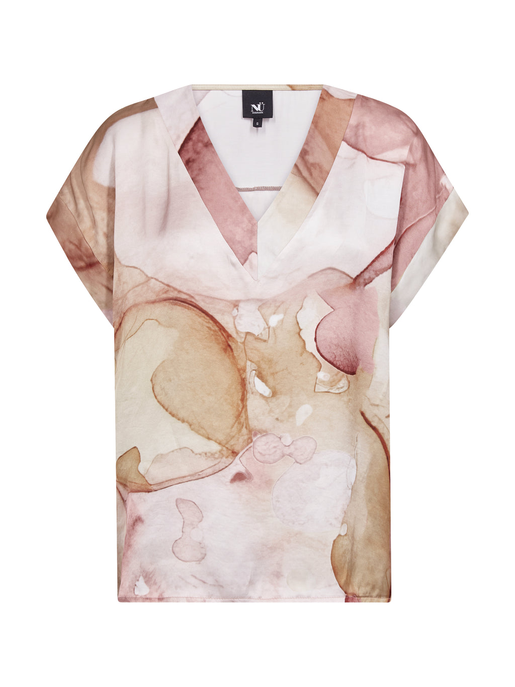 Denne blusen har en enkel fasong med V-utringning og korte ermer, noe som gir et avslappet og anvendelig uttrykk. Mønsteret er både foran og bak, og tilfører karakter og kant. Passformen er rett, så blusen faller pent på kroppen og er lett å style både med bukser og shorts. Bruk den alene til hverdags eller sammen med en lett jakke for en gjennomført look.