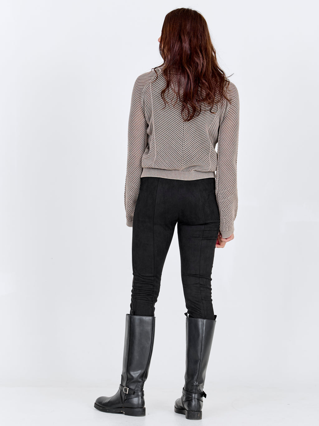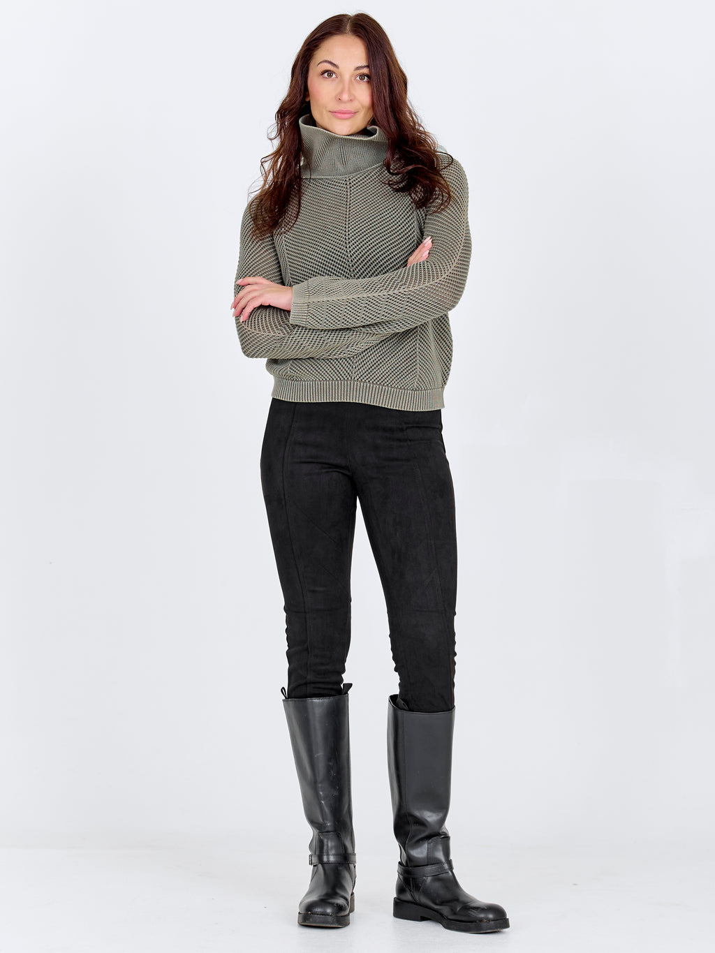 Denne strikkegenseren har et klassisk og avslappet utseende med lange ermer og en myk, rullet krage som gir en behagelig passform. Strikken har et subtilt mønster som tilfører struktur til designet, mens både fronten og baksiden forblir enkle og ensartede. Passformen gjør den lett å bruke til hverdags. Style genseren med en skjørt for et mer feminint utseende, eller med bukser for en rolig og velkoordinert stil som passer både til jobb og fritid.