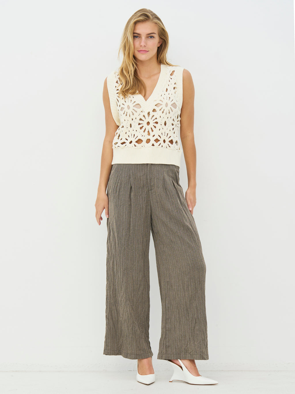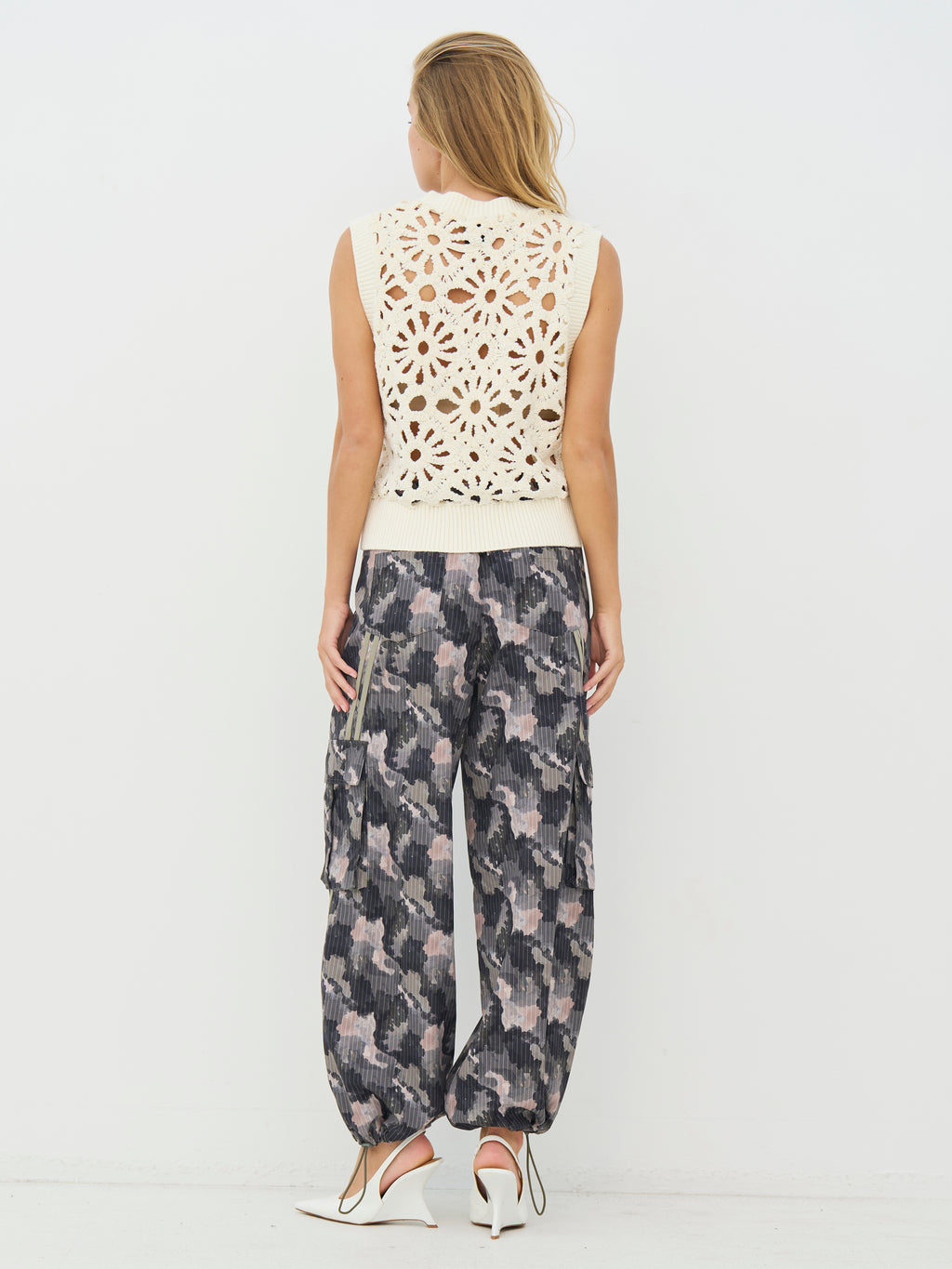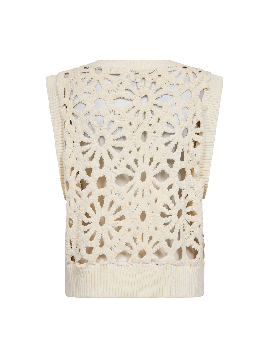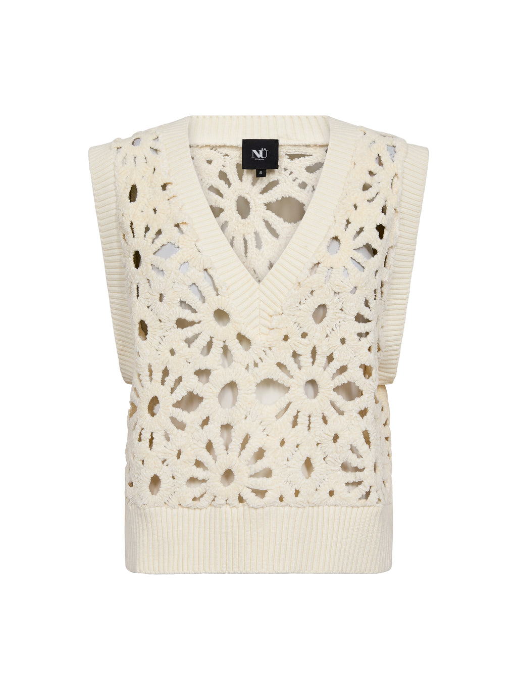 Denne heklet vest har et dekorativt hullmønster som gir et lett og detaljert uttrykk. Foran har den en dyp V-hals og brede ribbekanter som skaper en pen avslutning, mens baksiden følger samme mønster for en ensartet look. Den ermeløse passformen gjør vesten enkel å bruke som et ekstra lag. Style den over en skjorte eller en enkel topp for en avslappet hverdagslook, eller bruk den med en lett kjole for en mer feminin uttrykk.