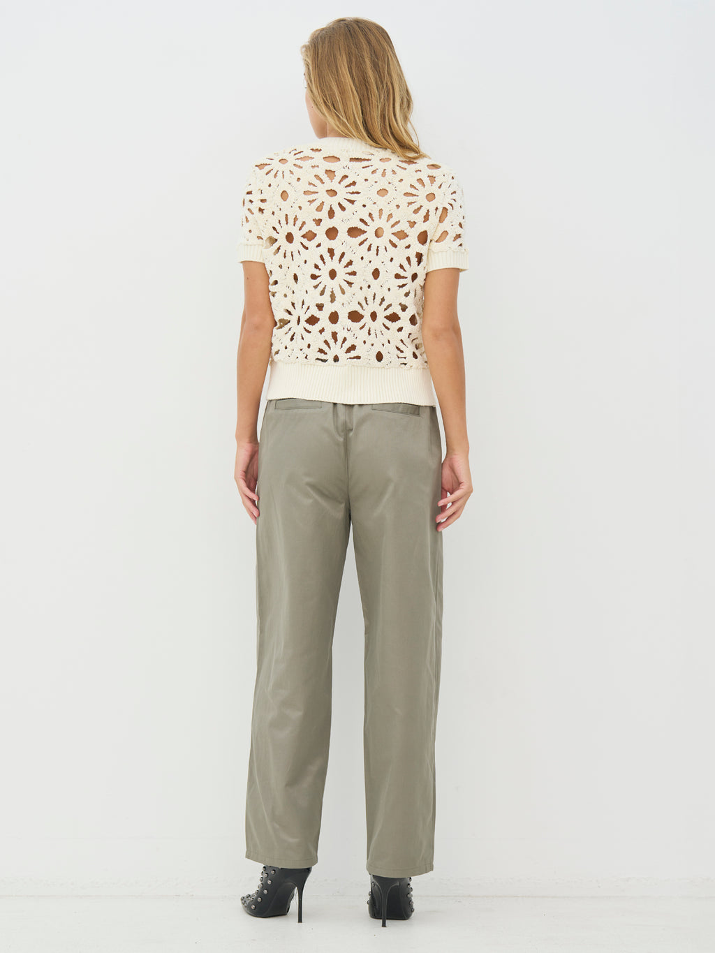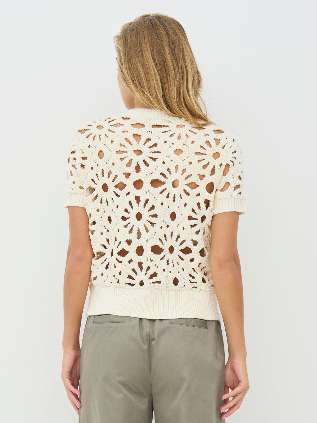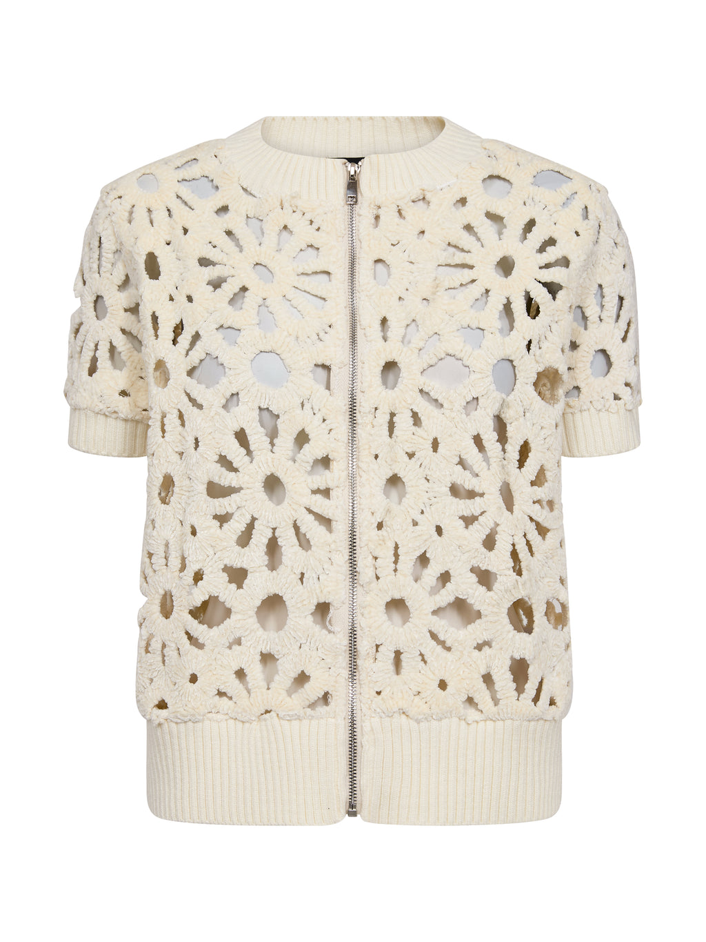 Denne korte jakken/cardiganen har et blomstret hullmønster som gir et lett og dekorativt uttrykk. Den lukkes med en gjennomgående glidelås foran og har korte ermer samt en enkel avslutning ved hals og nederkant. Baksiden følger det samme mønsteret og gir et rolig helhetsinntrykk. Styl den over en enkel topp eller kjole, eller bruk den sammen med løse bukser for et avslappet og anvendelig hverdagsantrekk.
