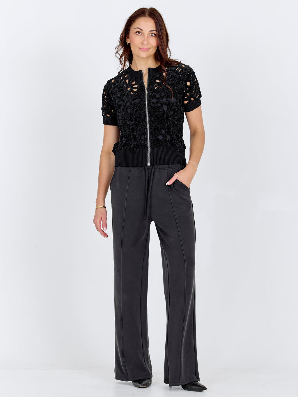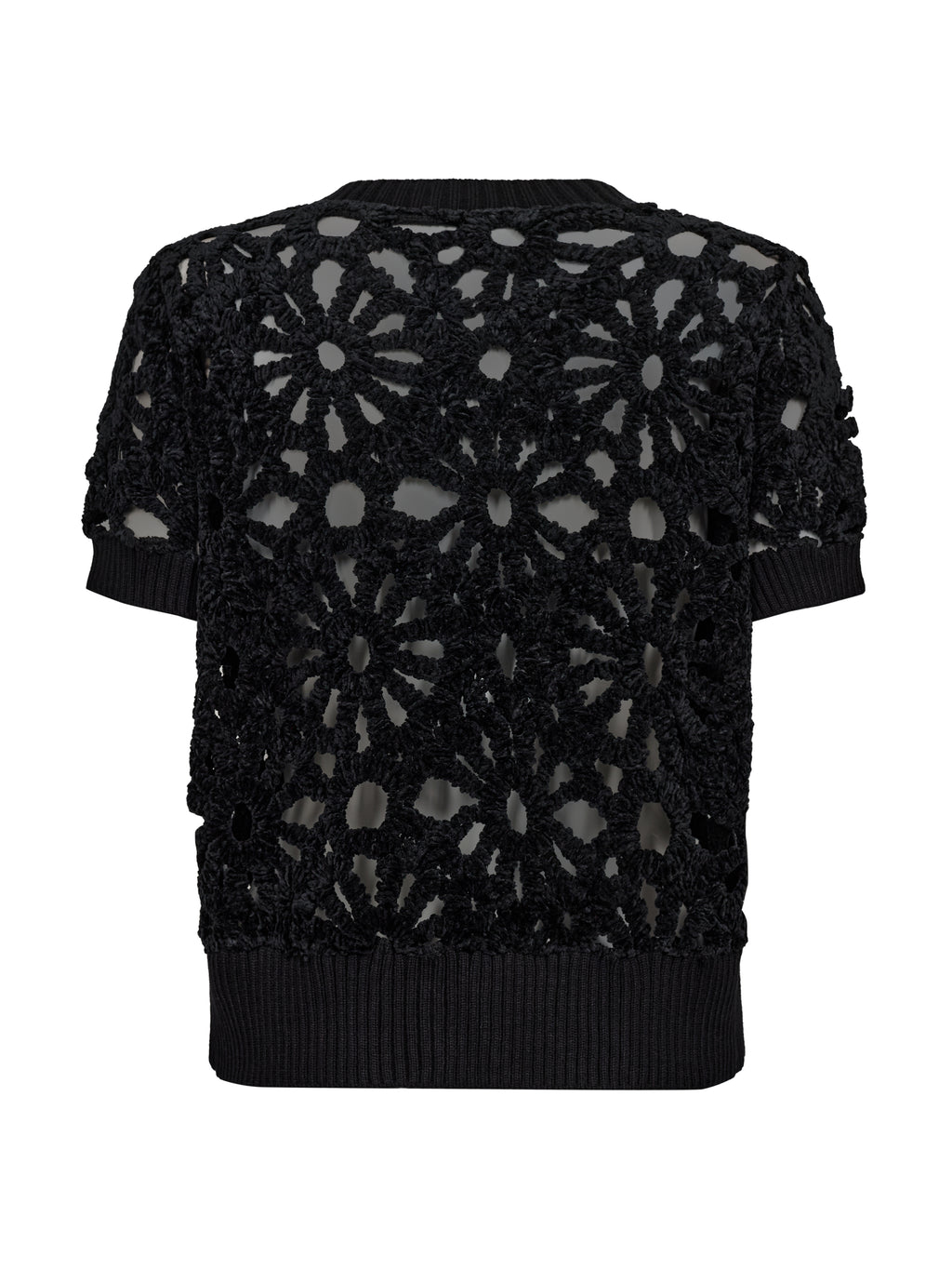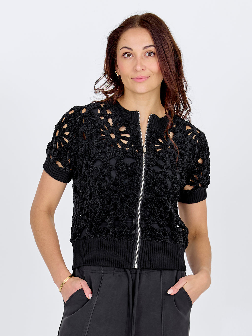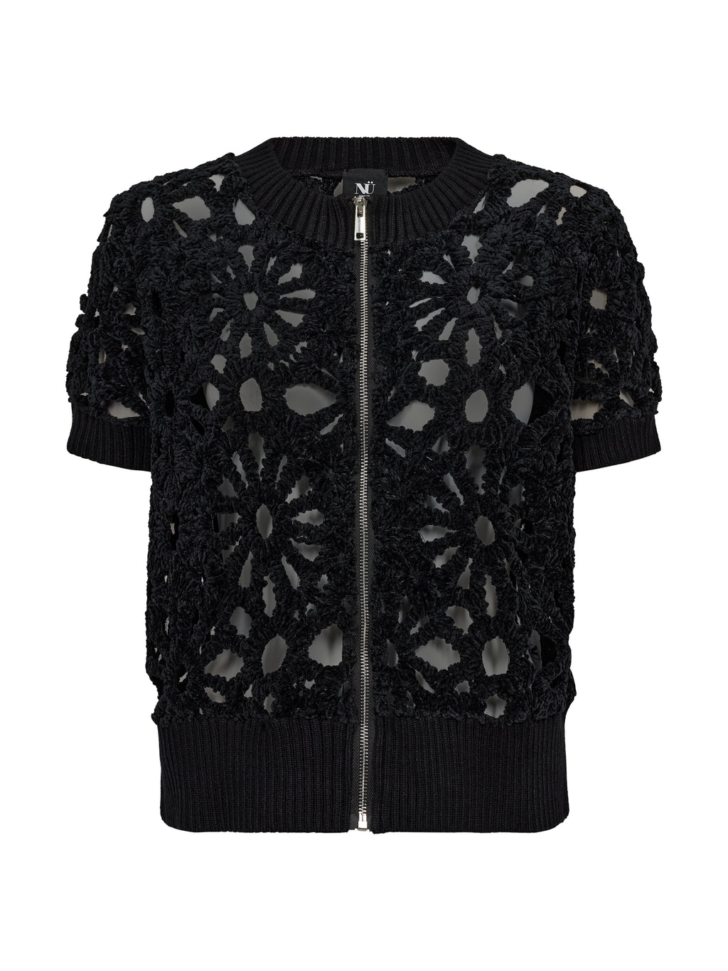 Denne korte jakken/cardiganen har et blomstret hullmønster som gir et lett og dekorativt uttrykk. Den lukkes med en gjennomgående glidelås foran og har korte ermer samt en enkel avslutning ved hals og nederkant. Baksiden følger det samme mønsteret og gir et rolig helhetsinntrykk. Styl den over en enkel topp eller kjole, eller bruk den sammen med løse bukser for et avslappet og anvendelig hverdagsantrekk.