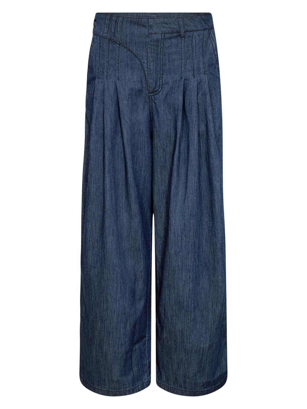 Disse vide buksene i denim har et elegant og avslappet uttrykk med brede ben som faller pent fra midjen. Foran er de designet med folder som gir ekstra vidde og en fin fall, samtidig som linjene holdes rene og enkle. Baksiden er mer klassisk i kuttet og skaper balanse i designet. Style buksene med en enkel topp eller den matchende overdelen for en gjennomført hverdagslook.