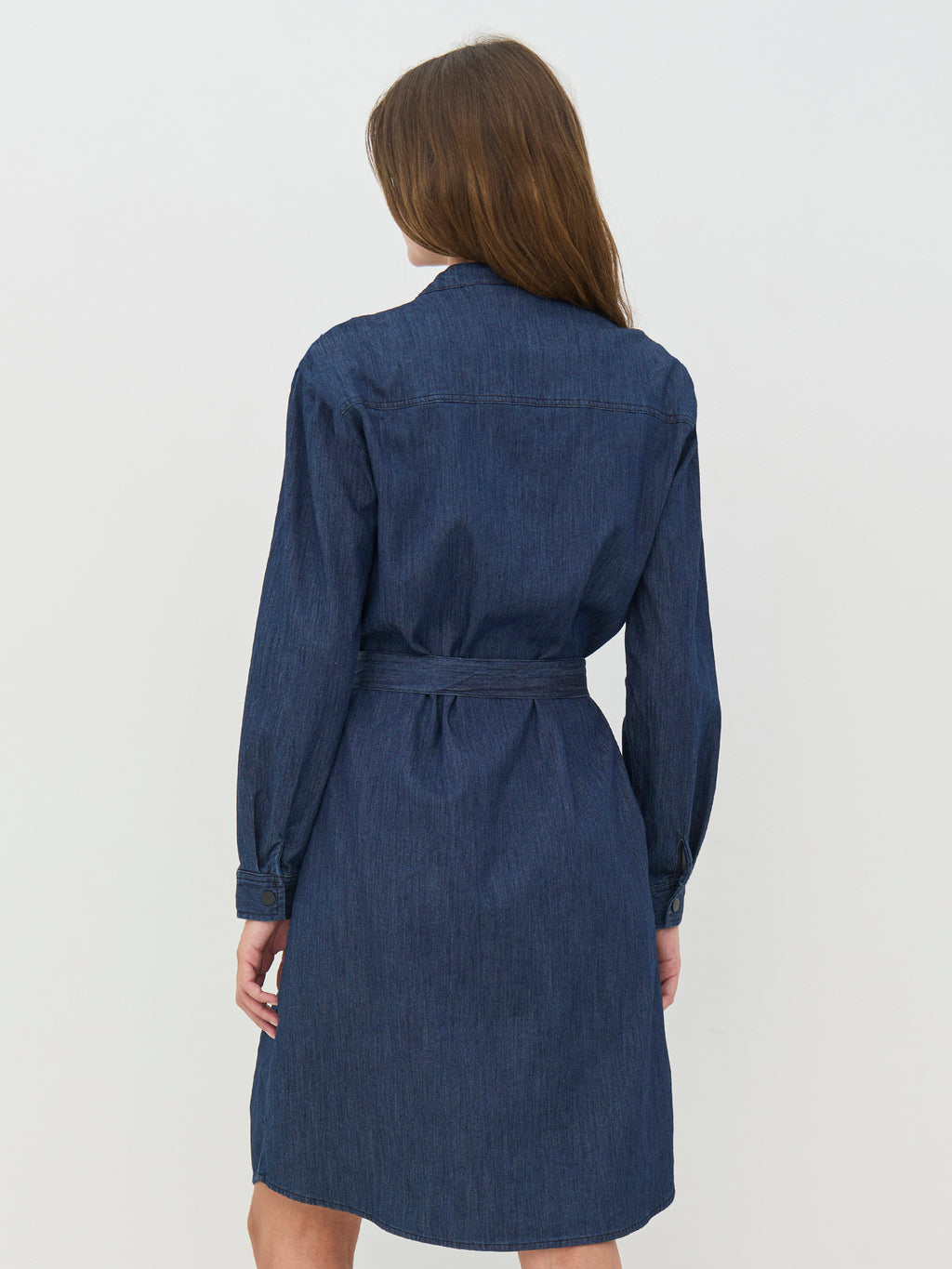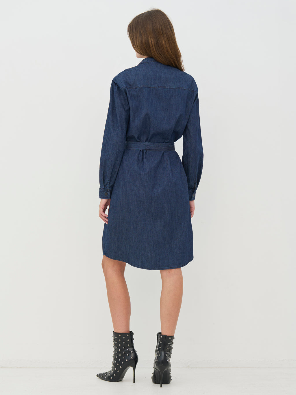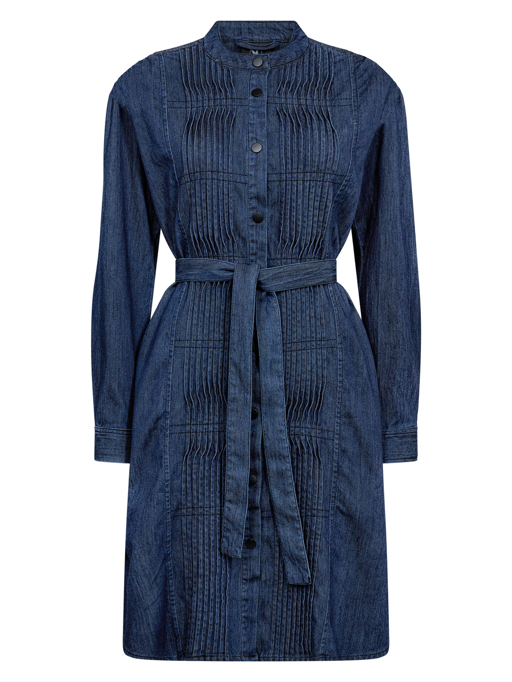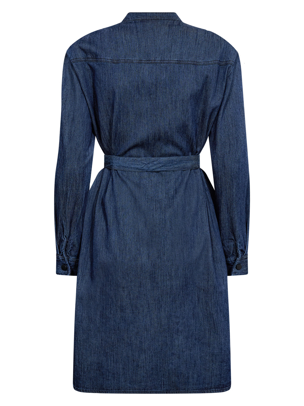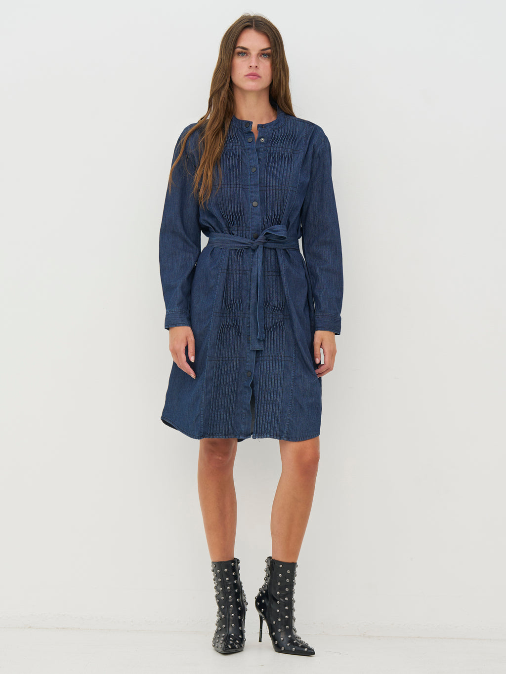 Denne denimkjolen har et feminint og godt balansert utseende med lange ermer og knappelukking foran. De fine folderne foran gir struktur, mens belte i midjen fremhever passformen på en naturlig måte. Baksiden er enkel og faller pent langs kroppen. Styl kjolen med støvler til hverdags eller med flate sko for en mer avslappet look.