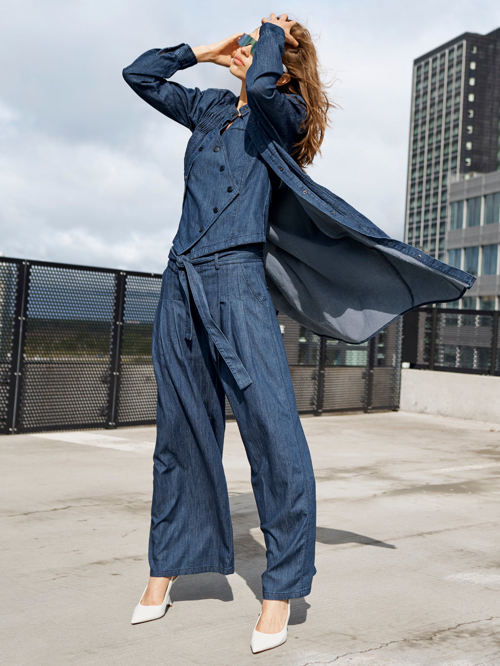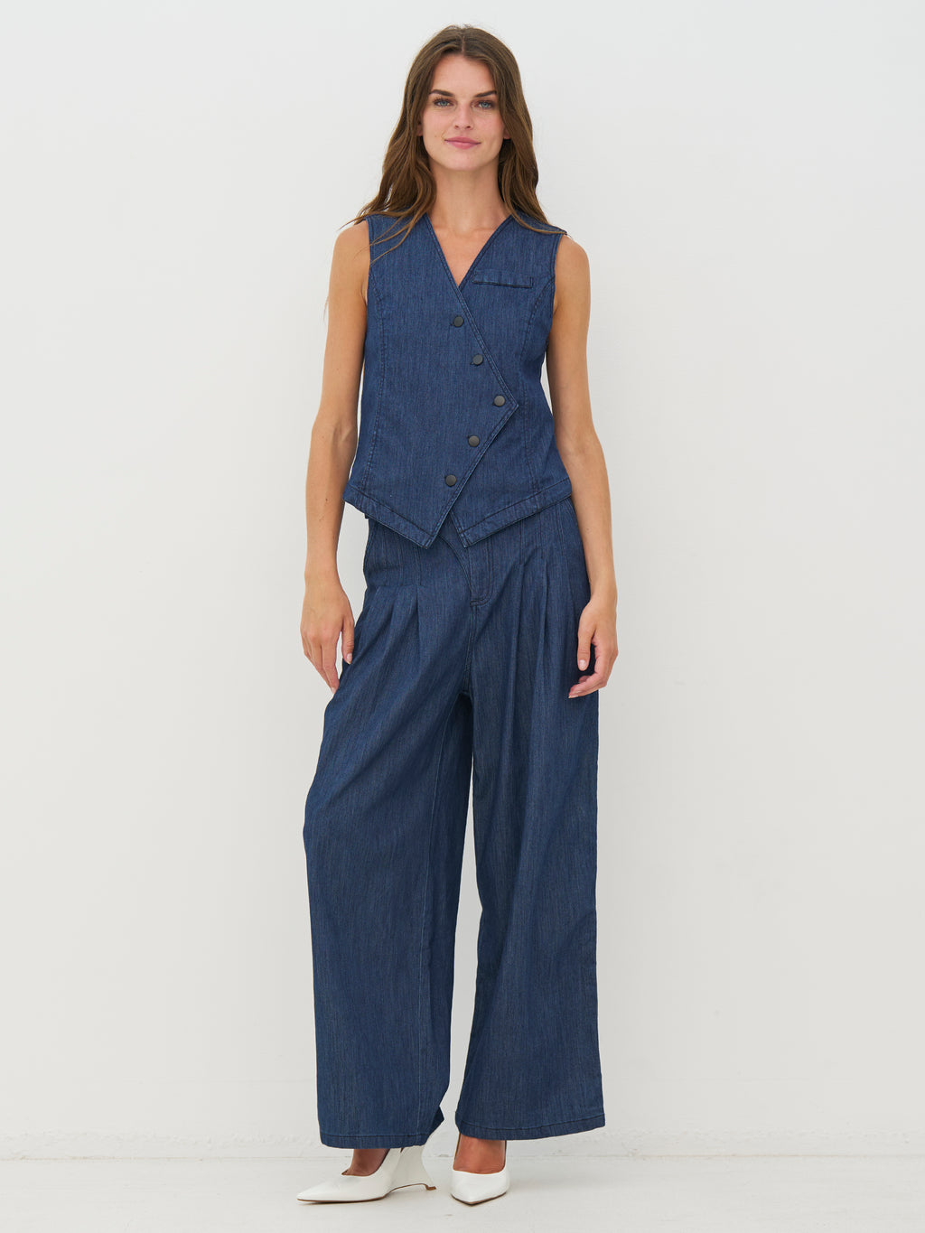 Denne denimvesten har et rent og feminint utseende med en skrå knappelukking som legger til en fin vri på den klassiske kuttet. Forsiden har en diskret brystlomme, mens baksiden er holdt enkel, slik at vesten faller pent langs kroppen. Det er enkelt å bruke som et ekstra lag og kan styles over en skjorte eller en lett topp. Bruk den sammen med matchende bukser eller jeans for et avslappet og sammenhengende utseende.