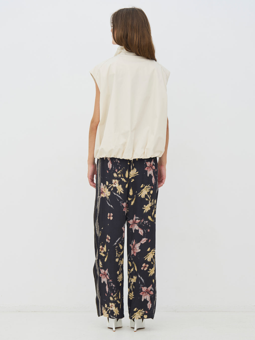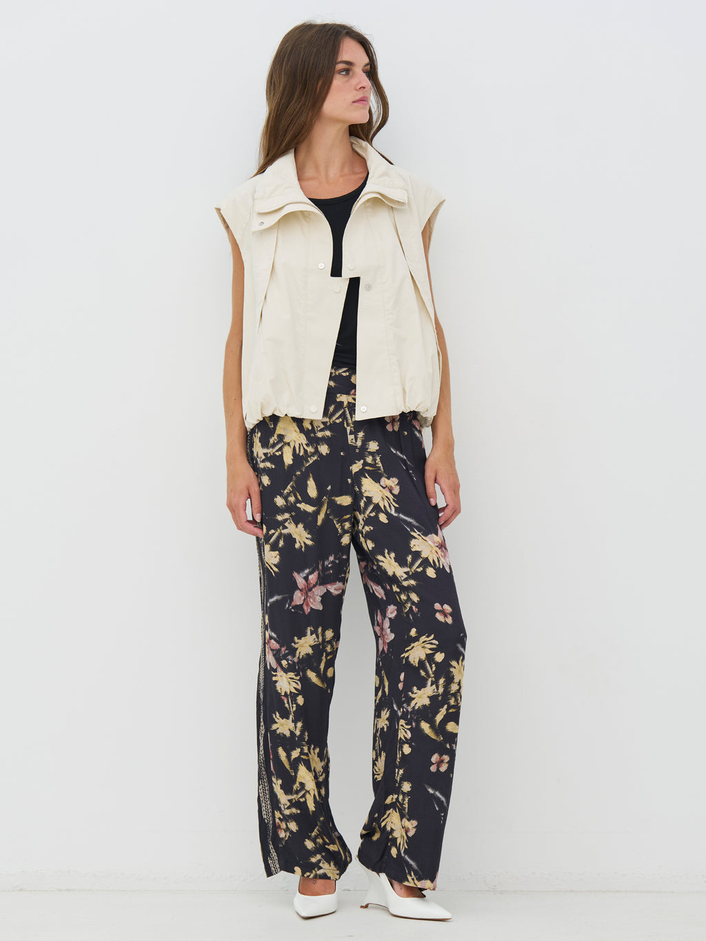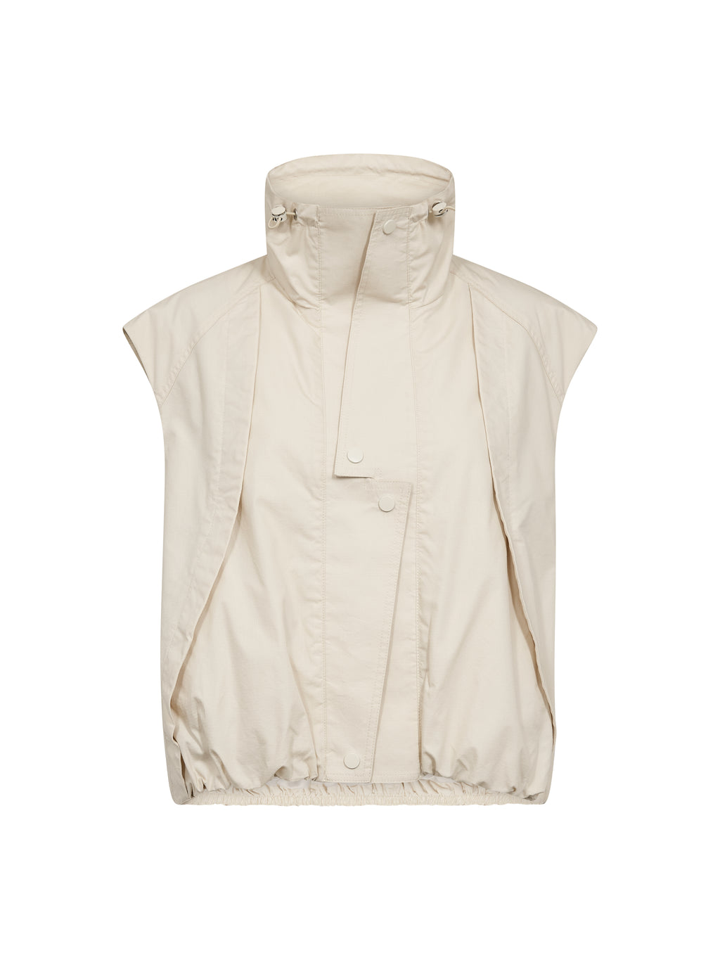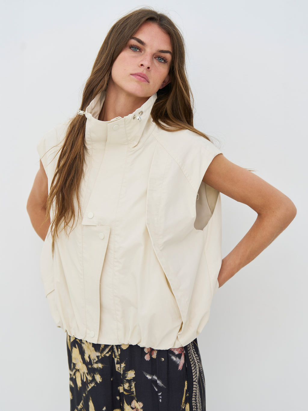 Denne vesten har et rent og funksjonelt uttrykk med høy krage og trykknapper foran. Den lette passformen og elastikken i kanten nederst gir en pen avslutning og gjør den behagelig å ha på. Designet er enkelt både foran og bak, noe som gjør vesten lett å bruke som et ekstra lag. Bruk den over en skjorte, kjole eller lett strikk - perfekt for overgangsperioder.