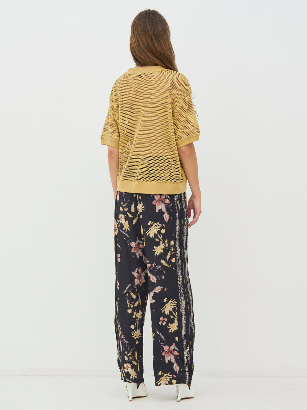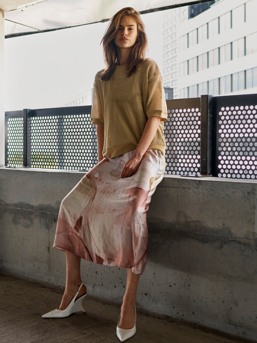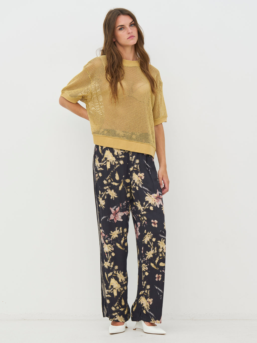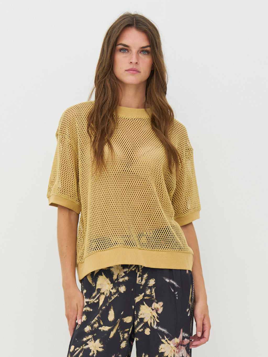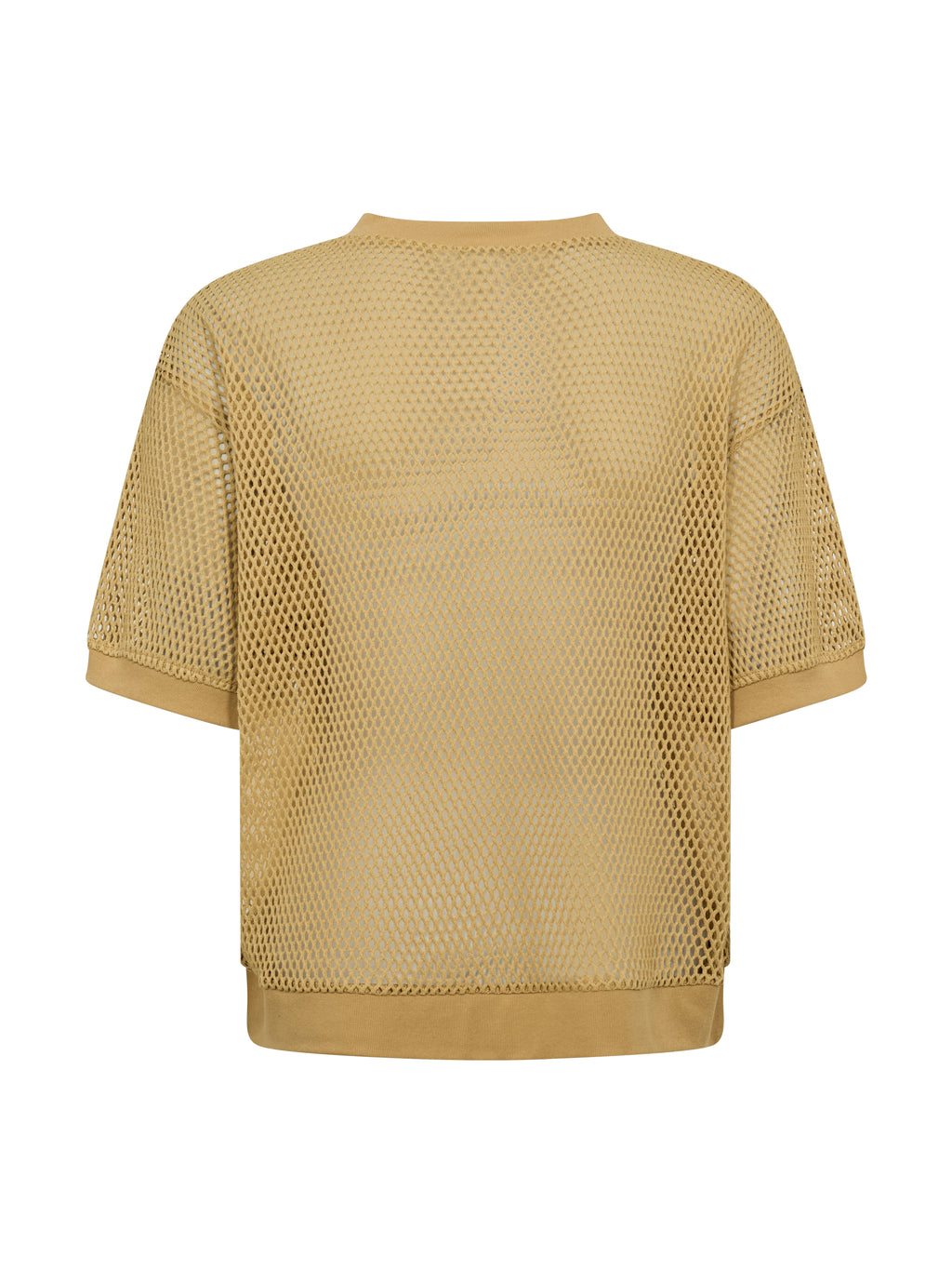 Denne toppen har en avslappet stil med korte ermer og rett passform. Det gjennomsiktige hullmønsteret gir et lett og røft utseende, mens ribbekanter ved hals, ermer og bunn skaper en tydelig avslutning. Baksiden er enkel og følger samme uttrykk som fremsiden. Styl den med en topp under, enten til bukser eller skjørt for en avslappet hverdagslook.