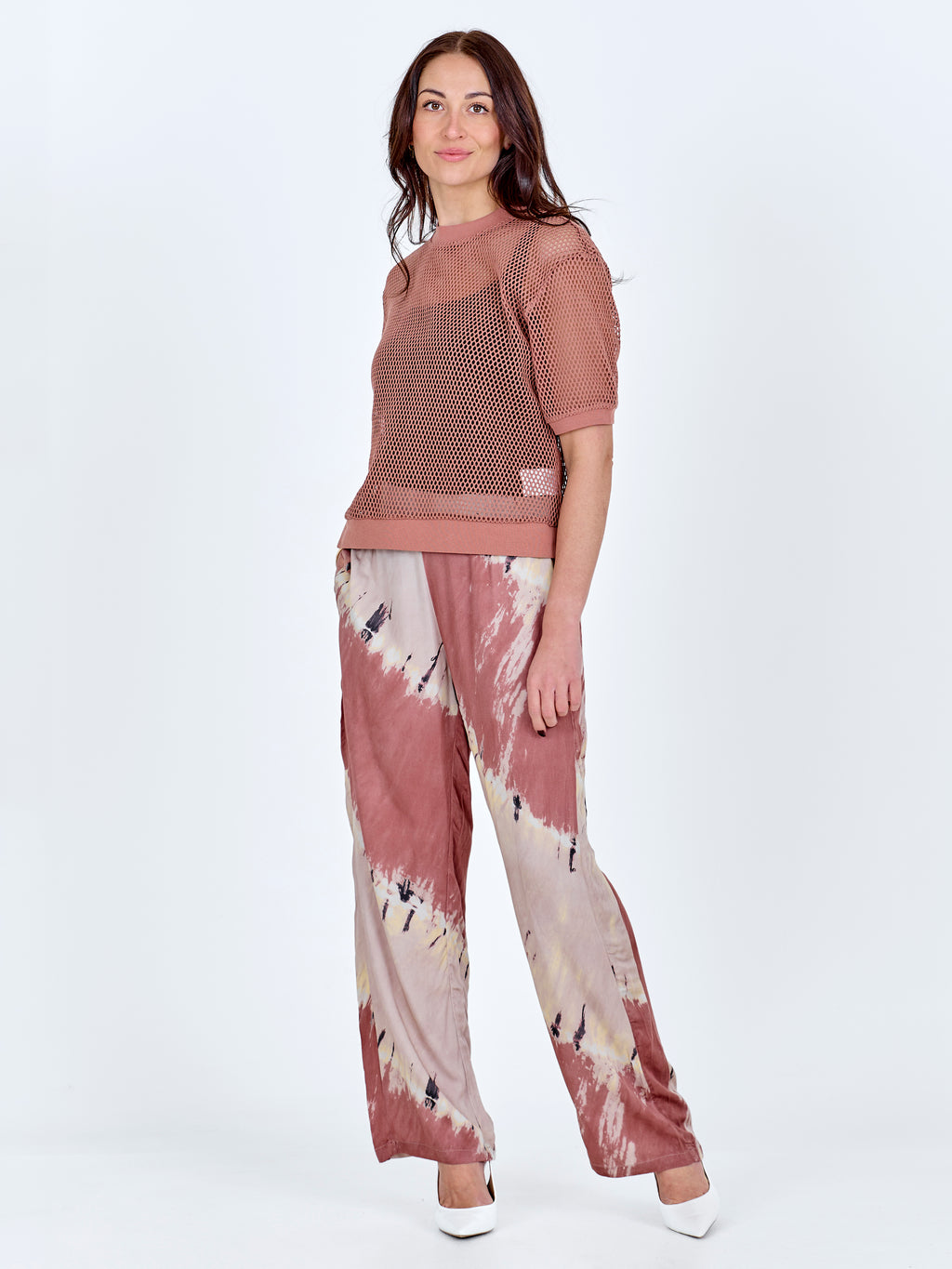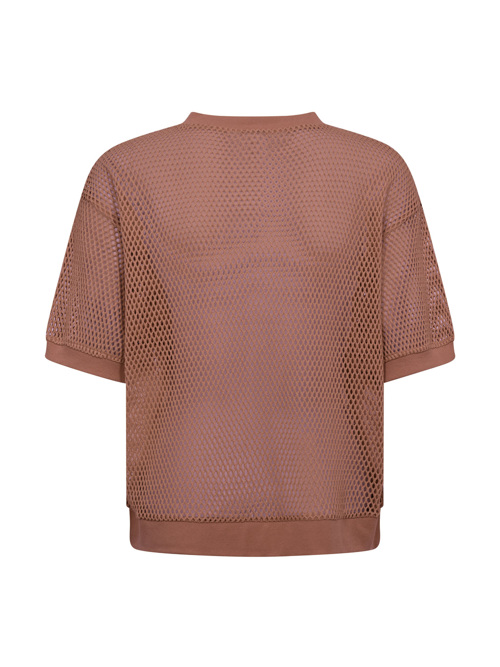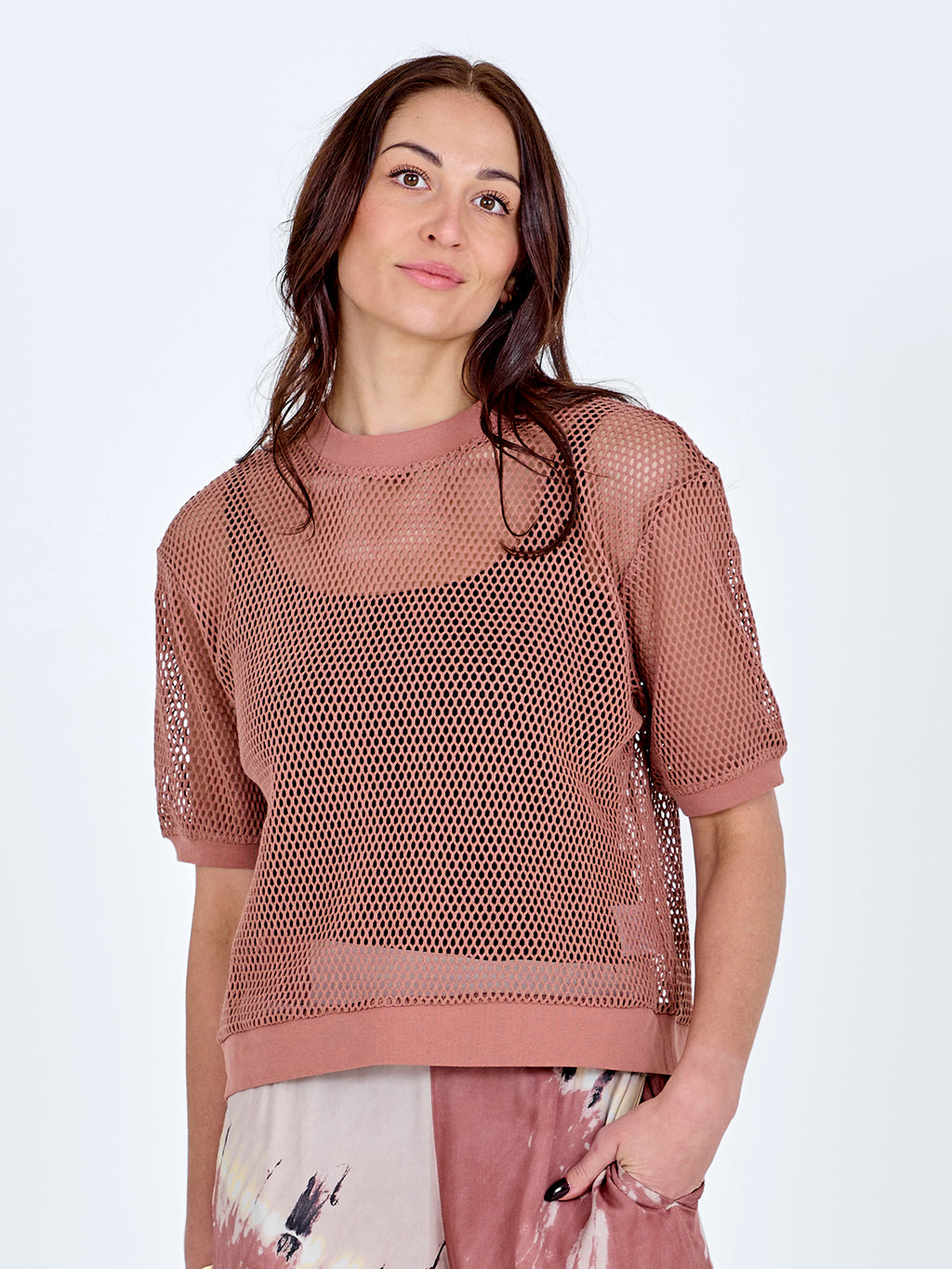 Denne toppen har en avslappet stil med korte ermer og rett passform. Det gjennomsiktige hullmønsteret gir et lett og røft utseende, mens ribbekanter ved hals, ermer og bunn skaper en tydelig avslutning. Baksiden er enkel og følger samme uttrykk som fremsiden. Styl den med en topp under, enten til bukser eller skjørt for en avslappet hverdagslook.