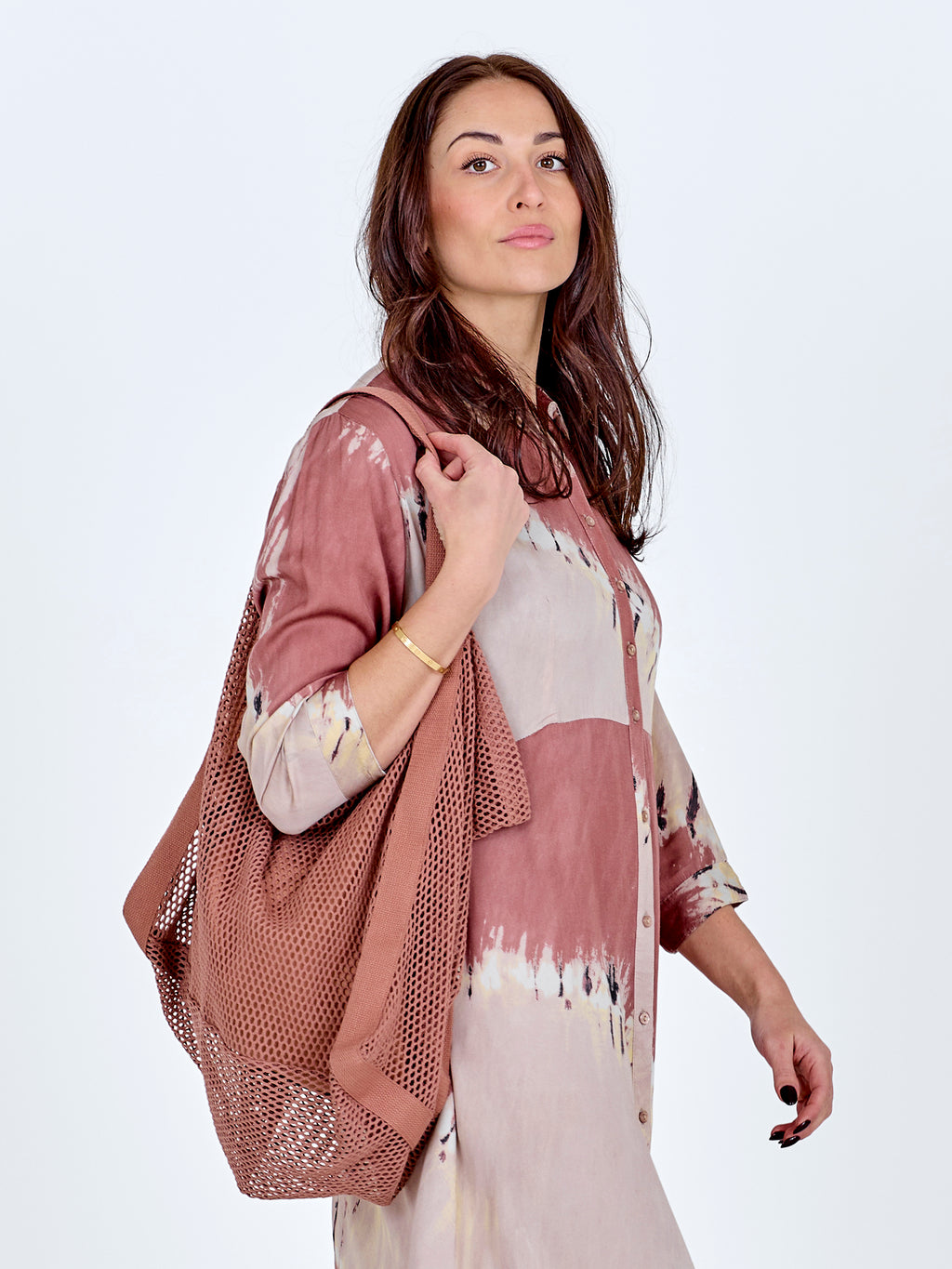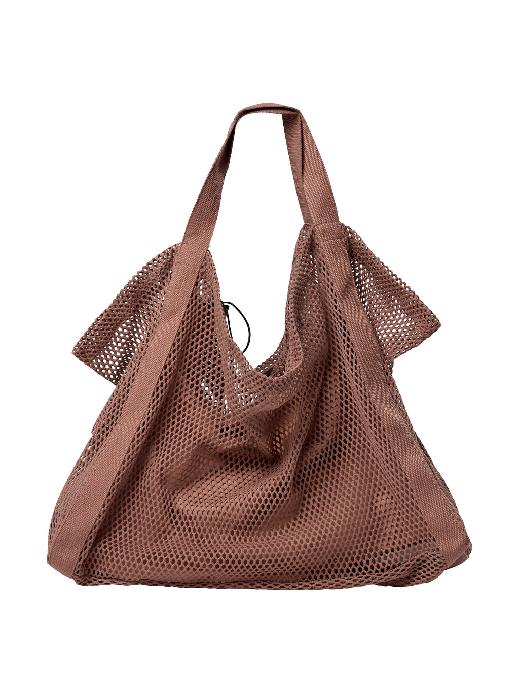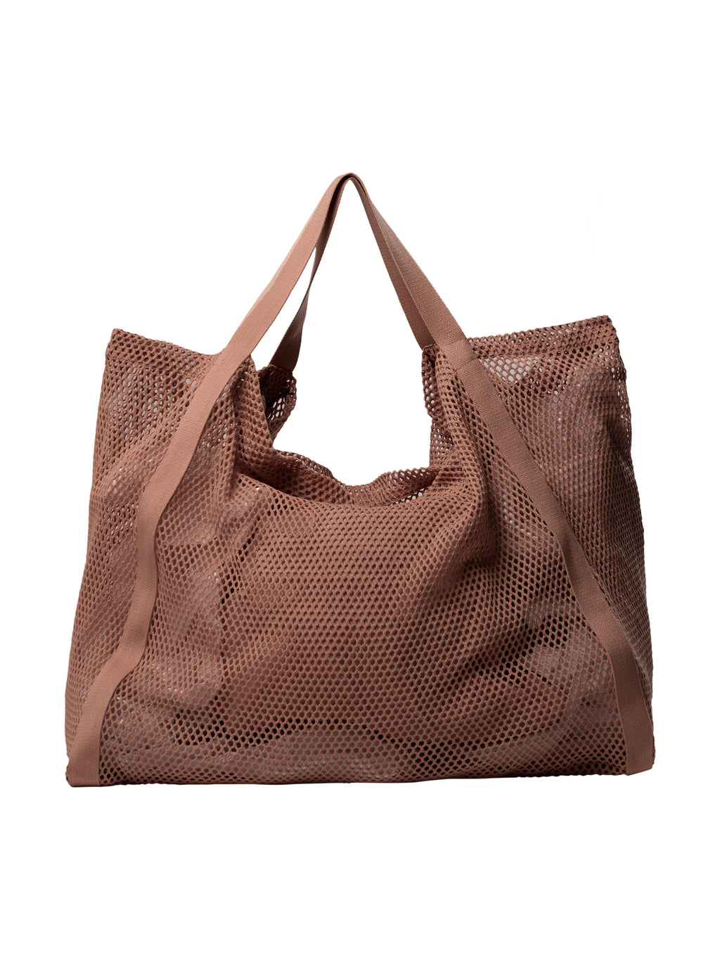 Denne vesken er laget i et åpent hullmønster, som gir den et lett og rått utseende. Den romslige formen gjør den praktisk for daglig bruk, mens de brede stroppene sørger for at den er behagelig å bære over skulderen. Vesken kan både fungere som en avslappet hverdagveske og som et ekstra preg på antrekket ditt, der strukturen får skinne.