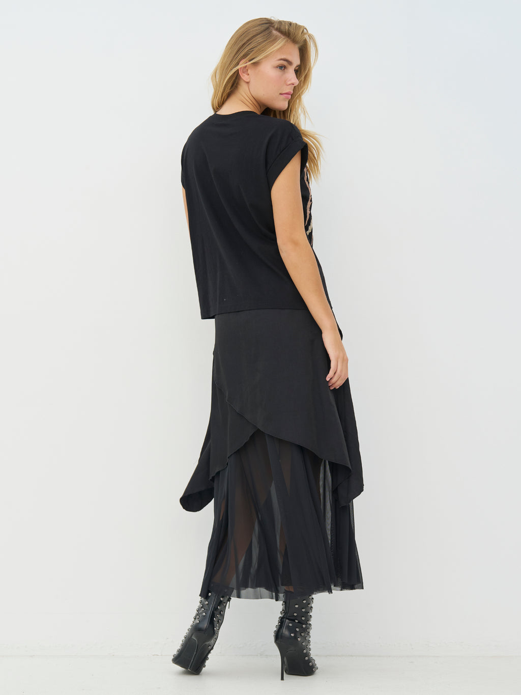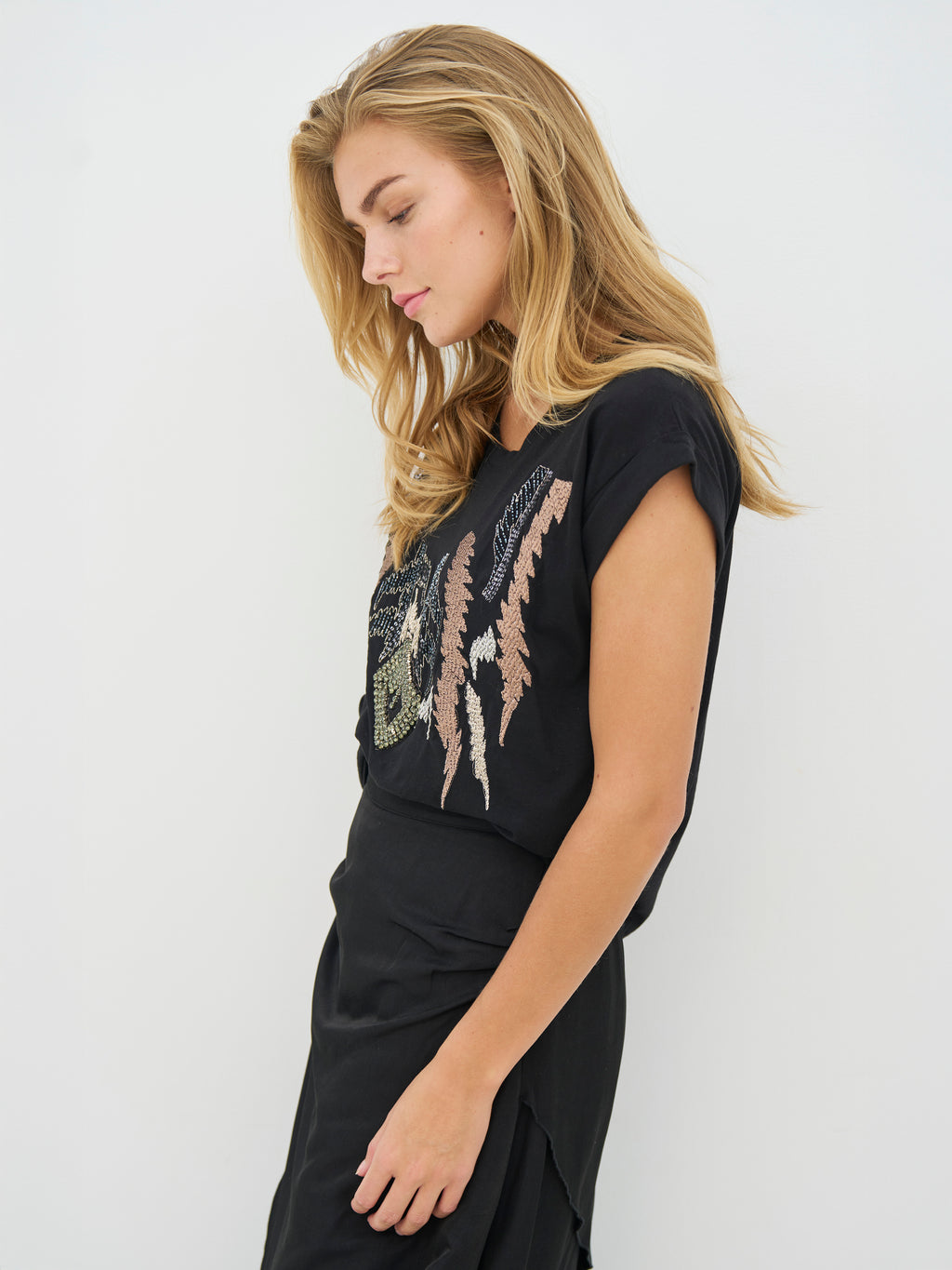 Denne T-skjorten har en enkel utforming med korte ermer og rund hals, men får sitt spesielle uttrykk fra de detaljerte broderiene og påsydde perlene på forsiden. Kombinasjonen av broderi og perler skaper dybde og gir fokus til dekorasjonen uten å bli for tung. Baksiden er helt enkel og balanserer utseendet fint. Styl T-skjorten med jeans, løse bukser eller under en åpen blazer når antrekket trenger litt ekstra karakter.