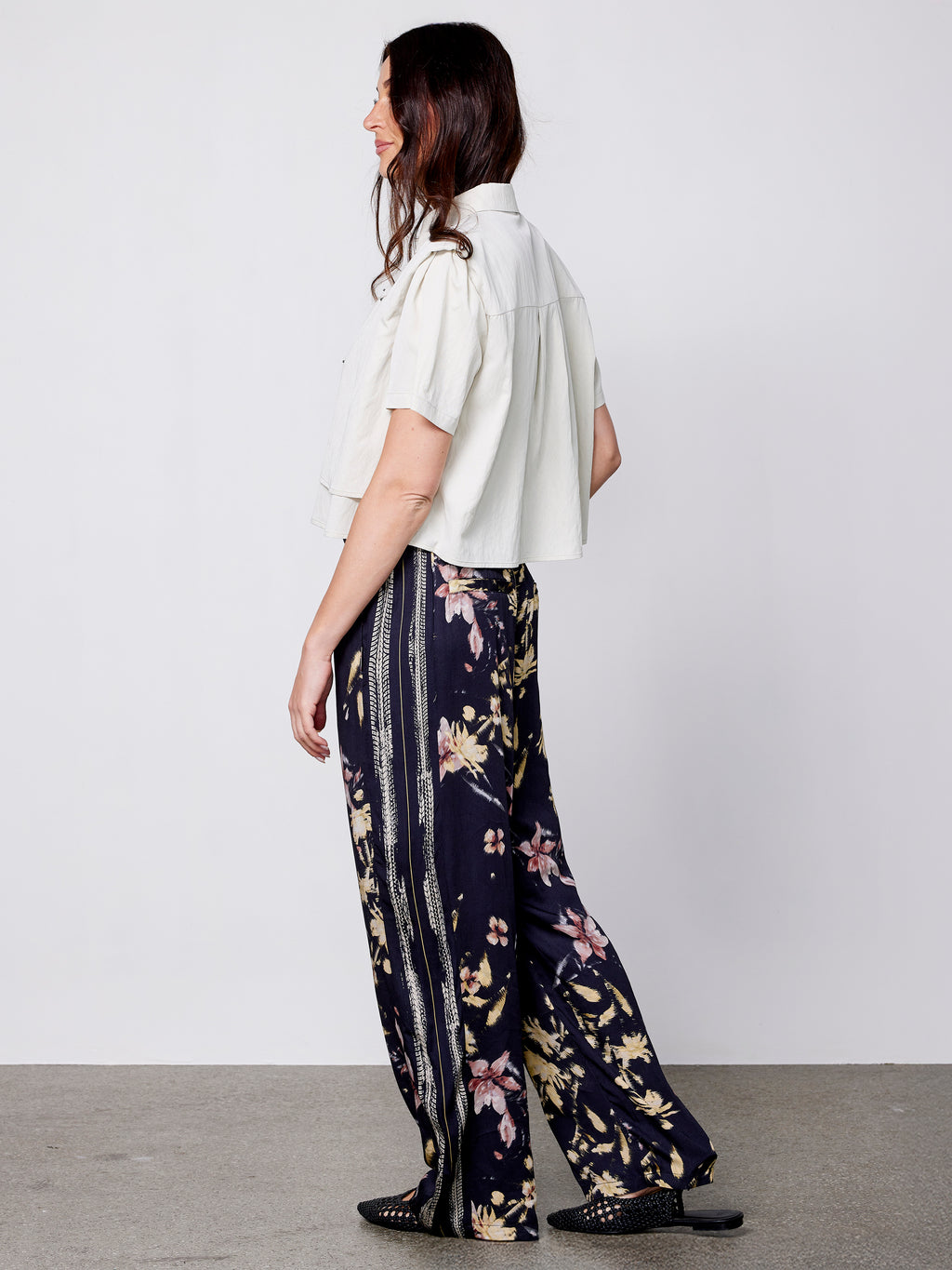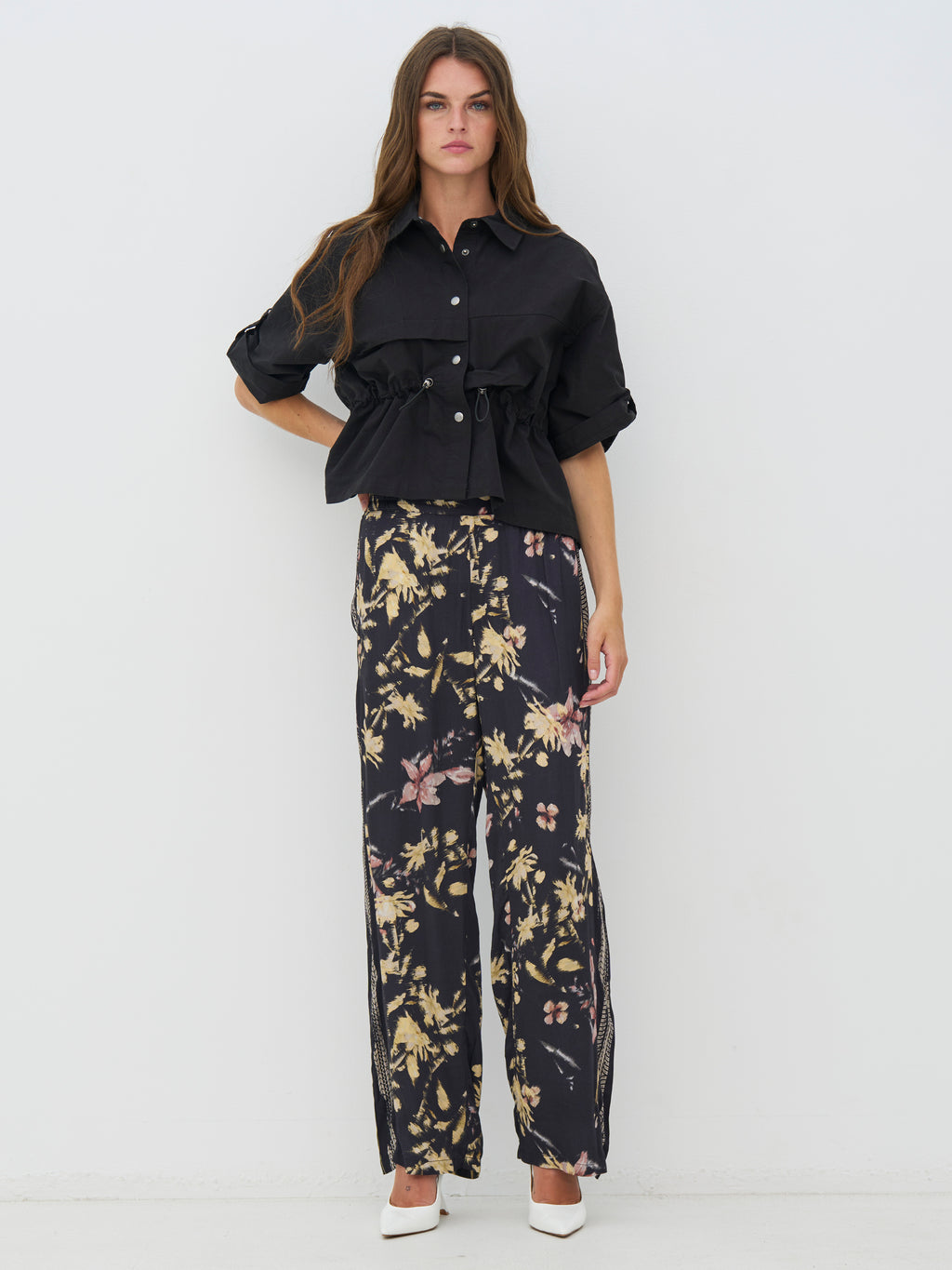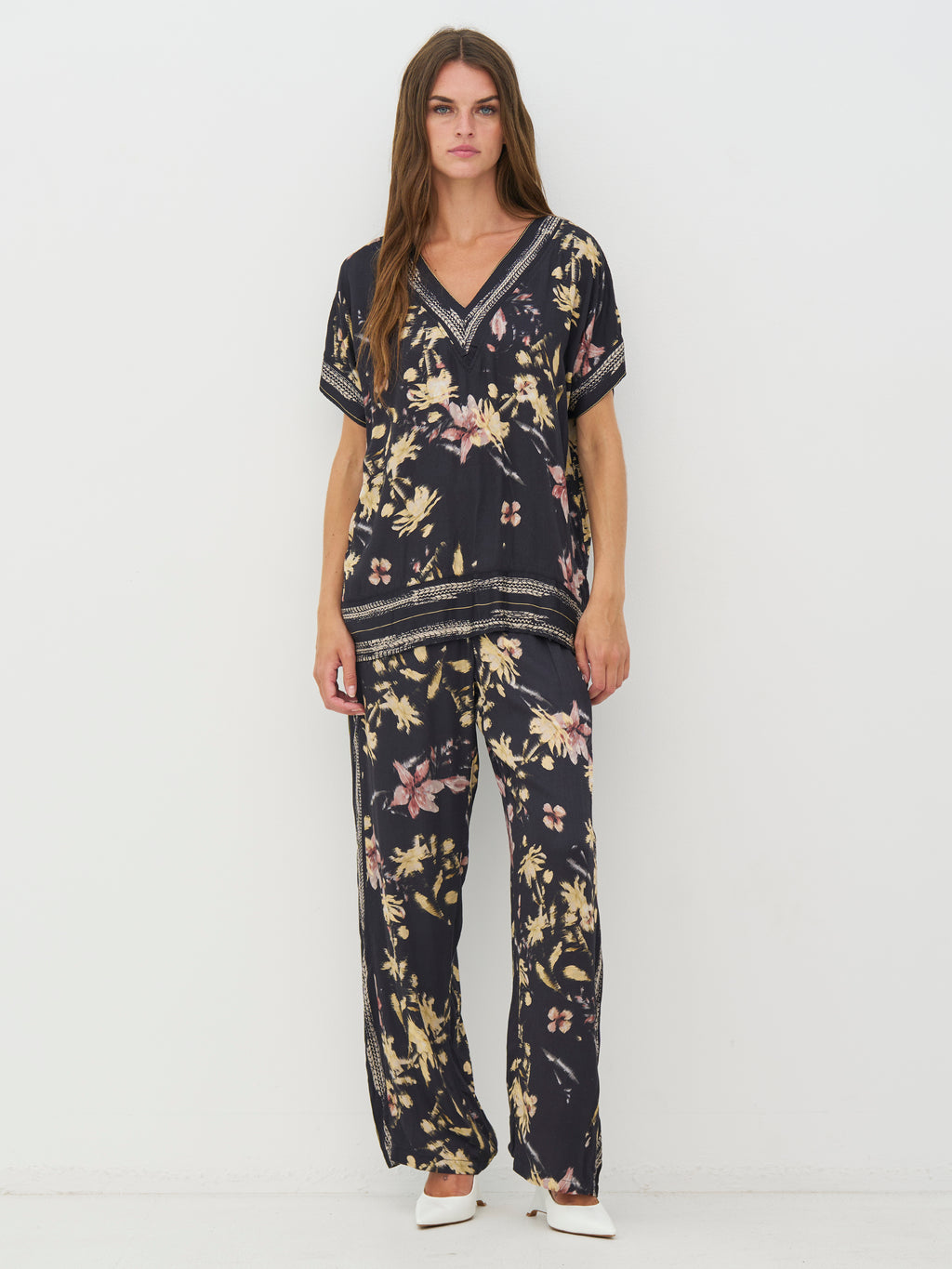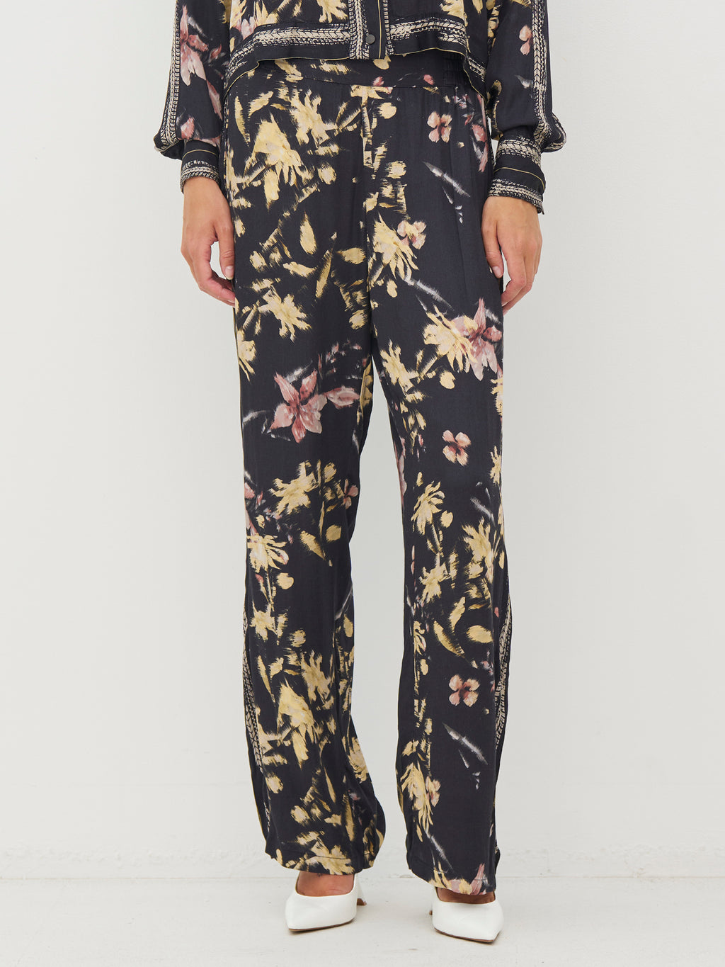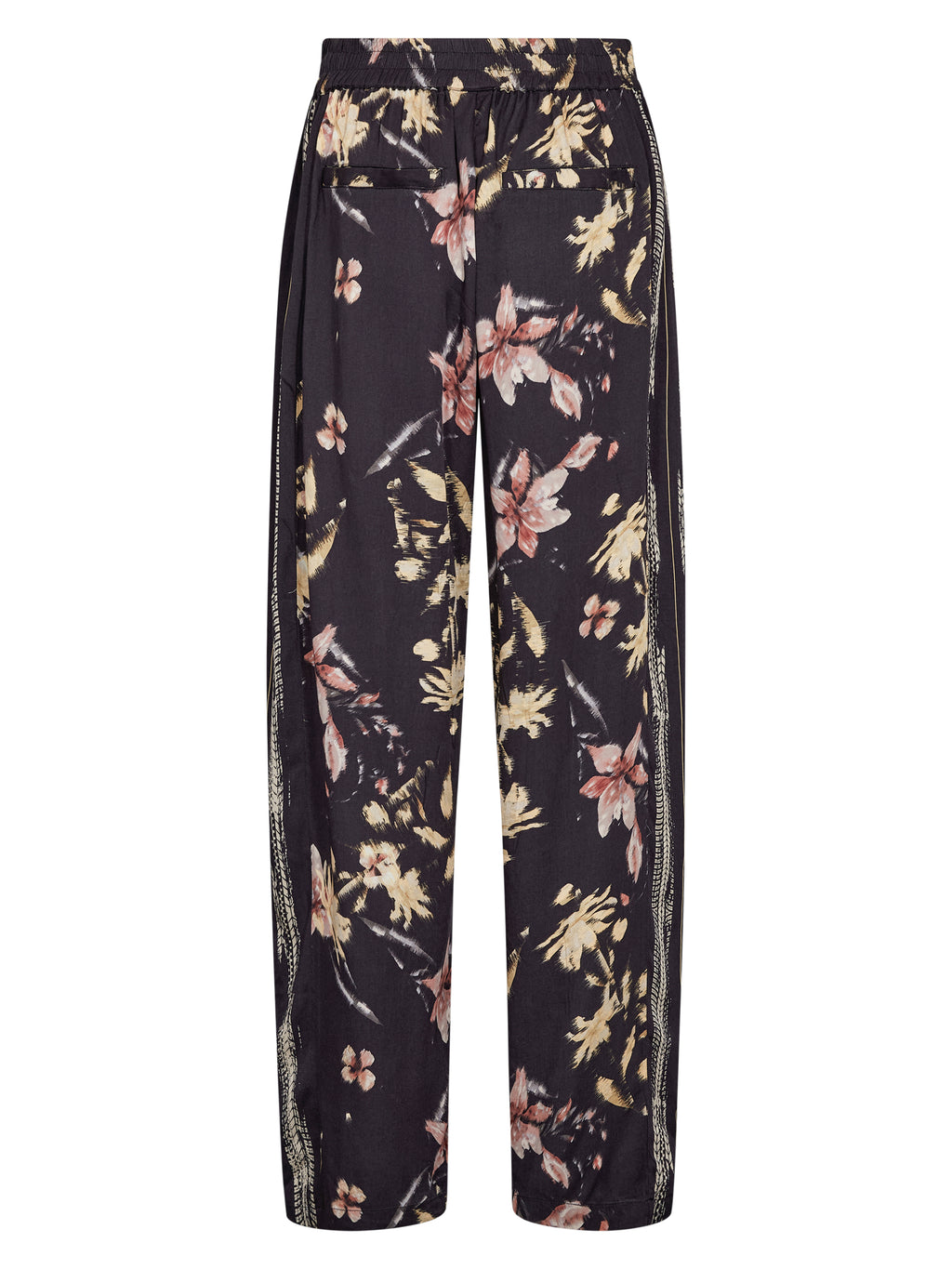 Disse buksene har en løs passform med rette ben som faller pent. Printet gir et elegant utseende, mens dekorative detaljer langs sidene tilfører litt kant. Livet sitter komfortabelt, og buksene er enkle å style enten med en enkel topp eller sammen med den matchende overdelen.