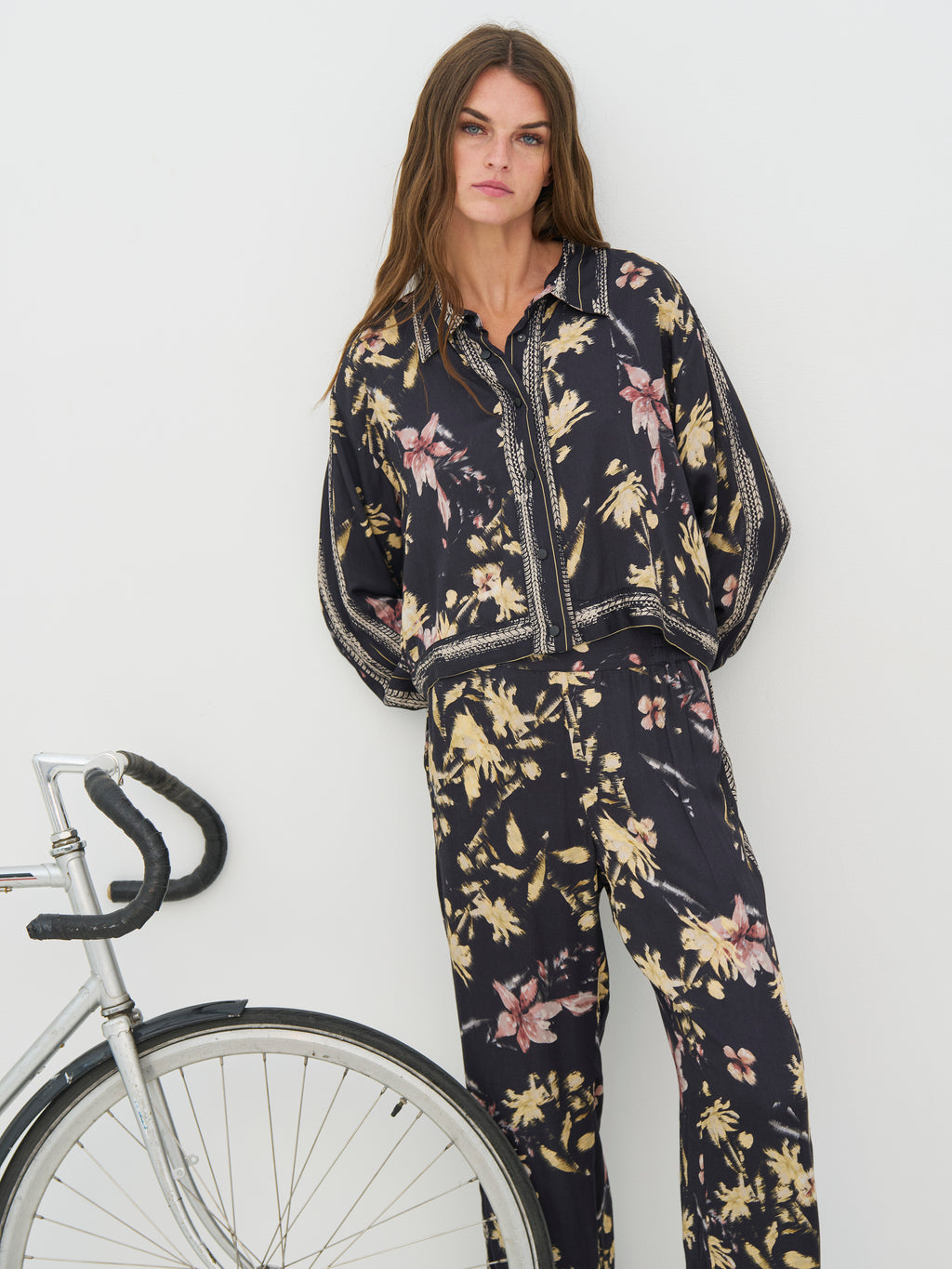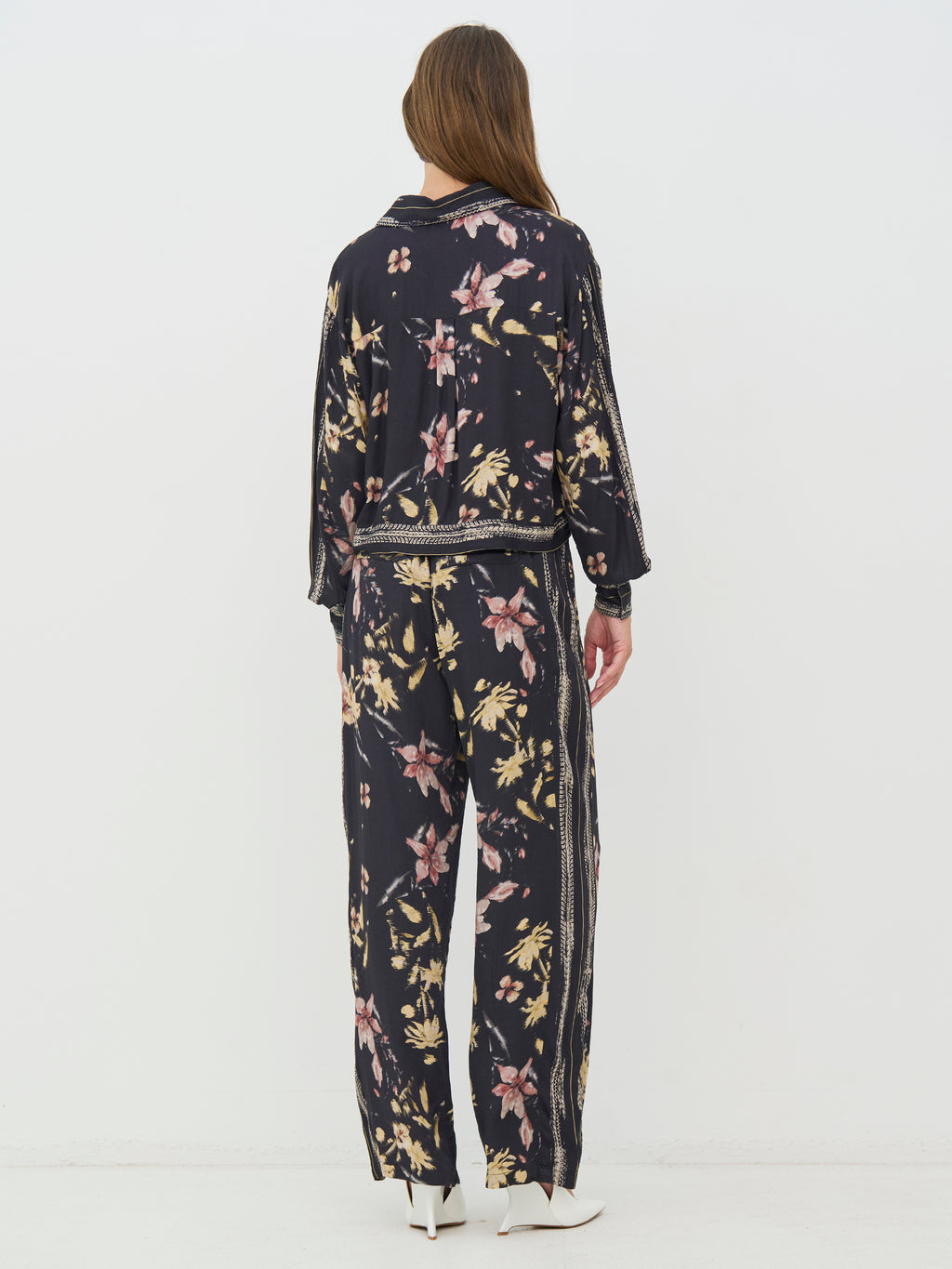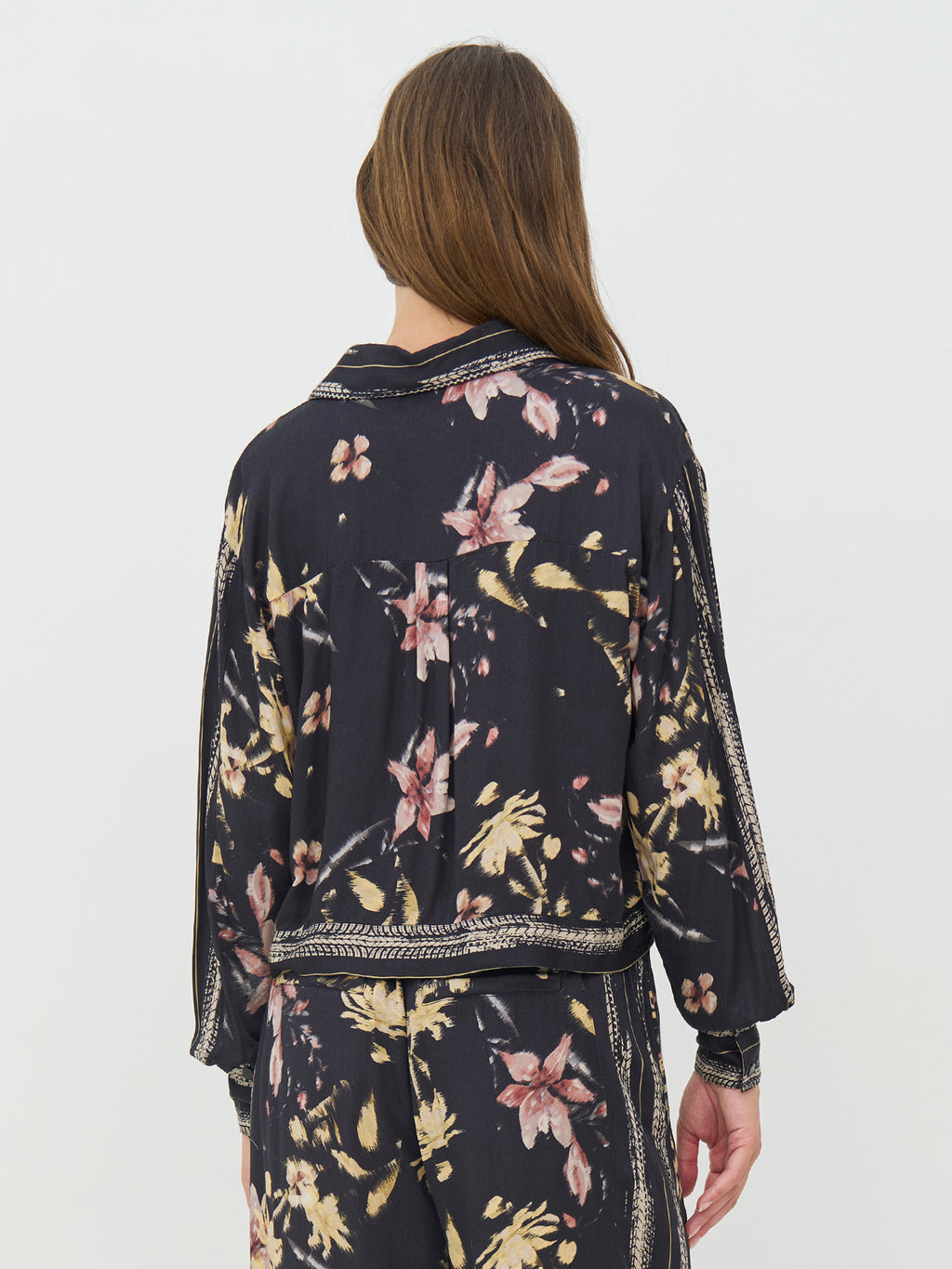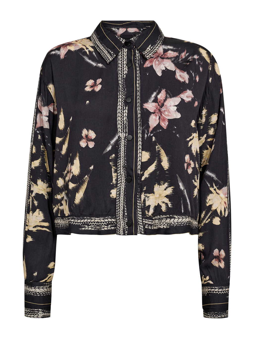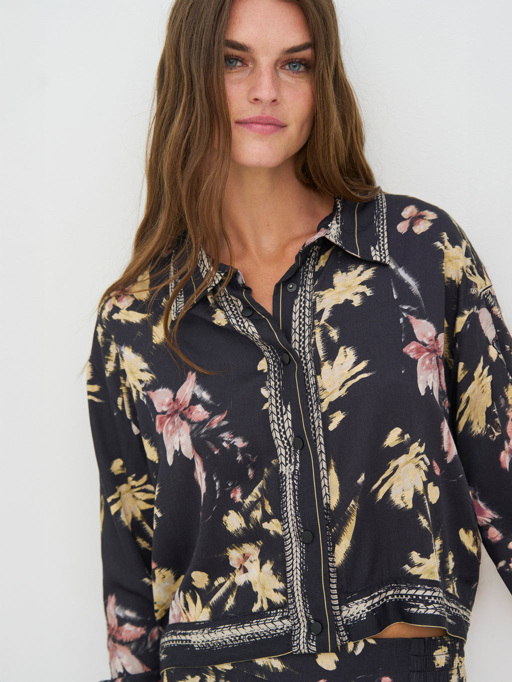 Denne skjorta har et avslappet og gjennomført uttrykk med gjennomgående knapper og klassisk krage. Printet gir karakter, mens dekorative bånd langs kragen, front og mansjetter tilfører en fin detalj. Passformen er lett og behagelig med god vidde i ermene. Bruk den alene, lukket eller åpen, eller style den sammen med de matchende buksene for et helhetlig utseende.