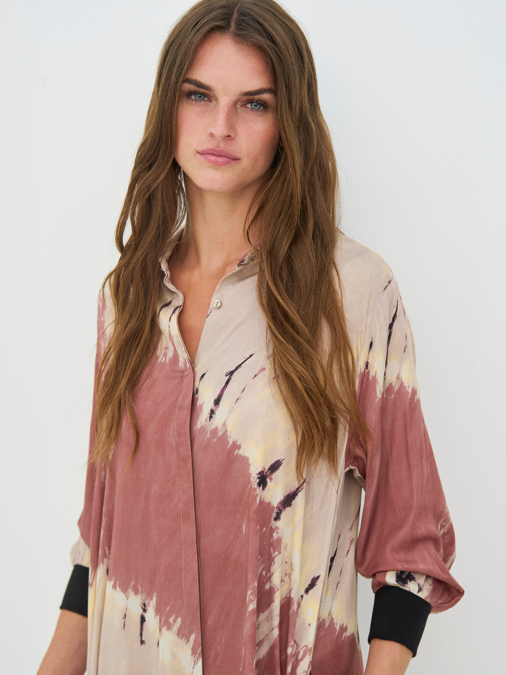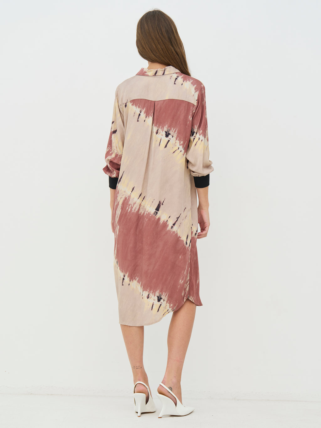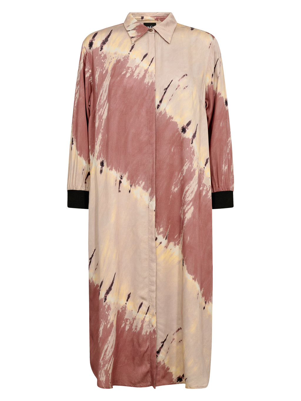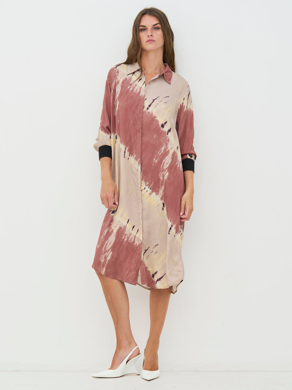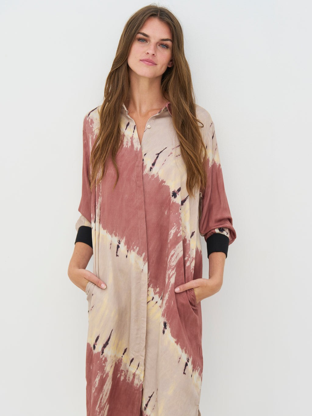 Denne kjolen har en enkel og avslappet passform med knappestolpe hele veien foran og en rett fasong som faller pent langs kroppen. De lange ermene avsluttes med mansjetter som gir kjolen litt struktur, mens ryggen er holdt enkel med god bevegelse. Lengden gjør den enkel å bruke både alene og åpen over bukser som et lett lag. En kjole som er enkel å style og fungerer til både hverdags og mer gjennomtenkte antrekk.