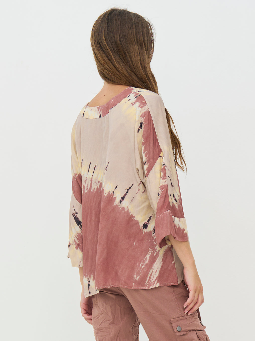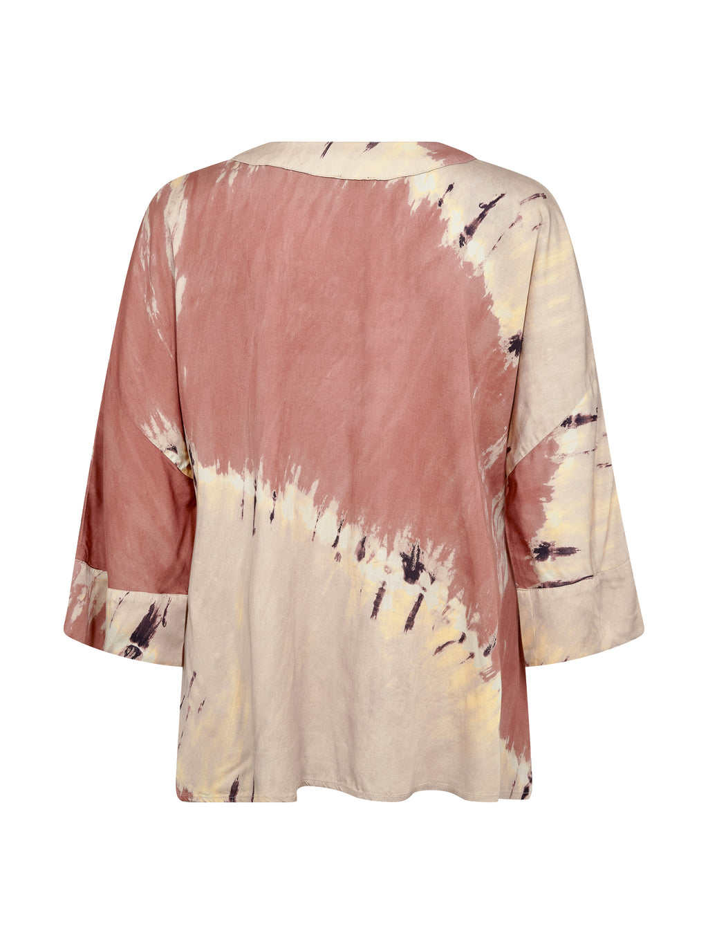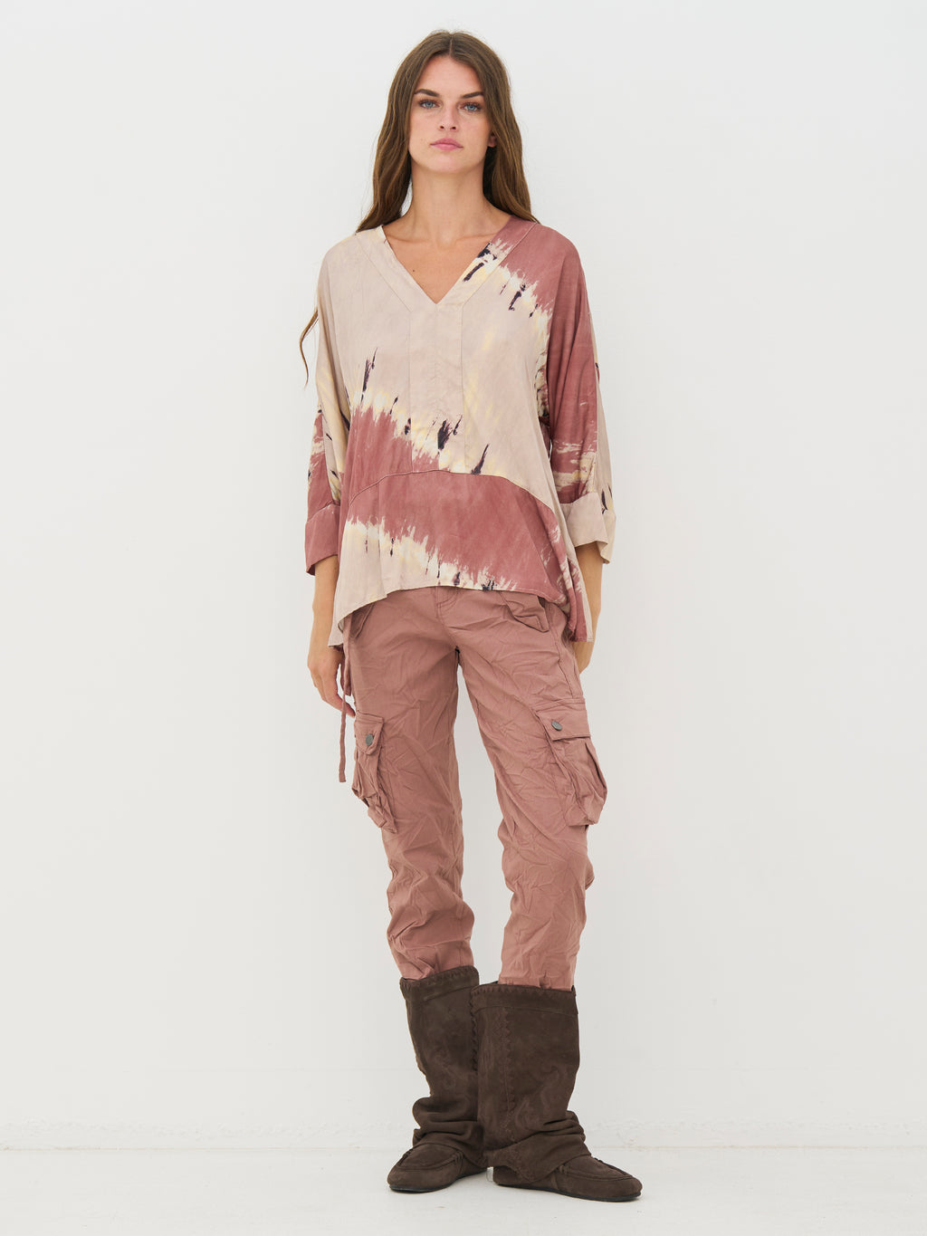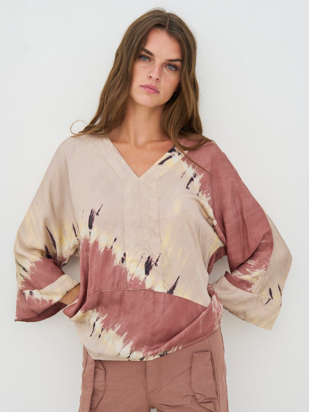 Denne blusen har et lett og avslappet uttrykk med en løstsittende passform som faller mykt rundt kroppen. V-halsen gir en åpen og feminin look, mens de 3/4-lange ermene legger til en rolig balanse. Blusen kan styles alene eller sammen med de matchende buksene for et gjennomført og sammenhengende utseende.