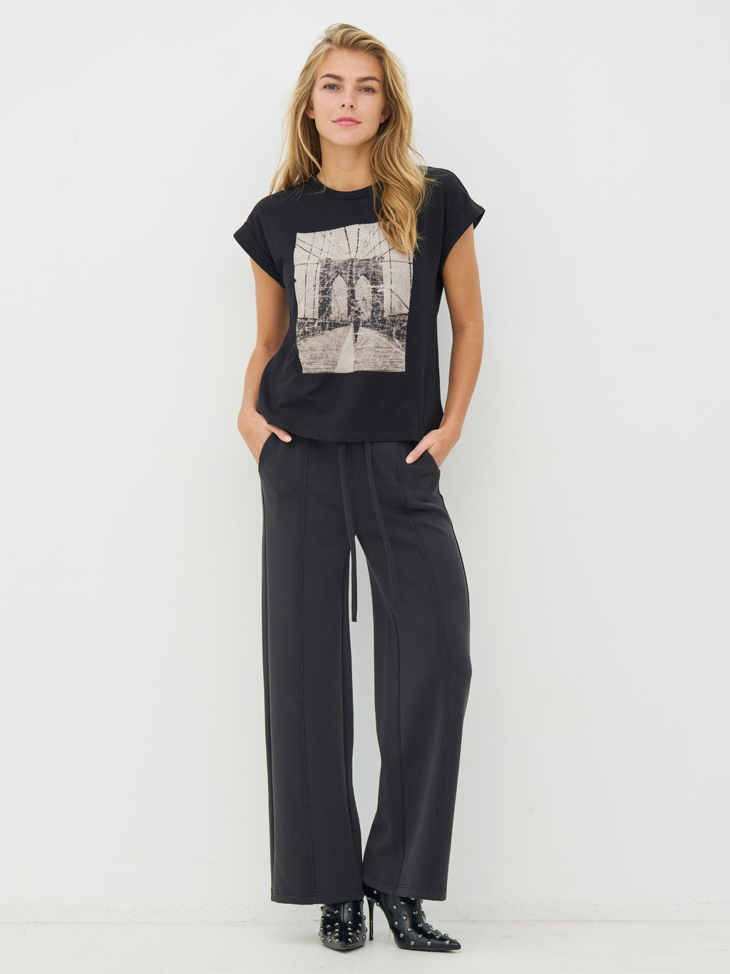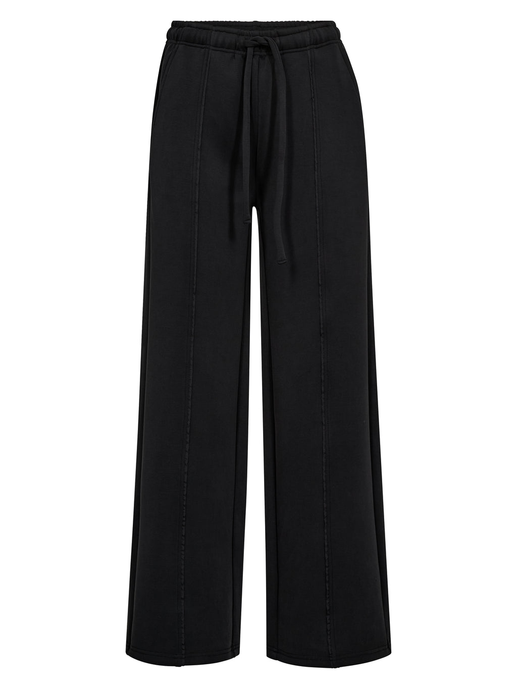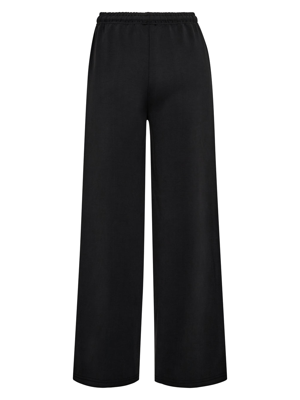 Disse buksene har en avslappet passform med rette, vide ben og en elastisk linning med snøring, som gjør dem enkle å justere. Langs bena går et diskret bånd med en lett 3D-effekt, som gir dybde og en fin detalj til det ellers rolige uttrykket. Forsiden er enkel med vertikale sømmer, mens baksiden er helt ensfarget. Buksene er veldig stretchy og myke, noe som gjør dem behagelige å bruke hele dagen. Styl dem med den matchende jakken for et gjennomført sett, eller med en bluse eller skjorte for en avslappet hverdagslook.