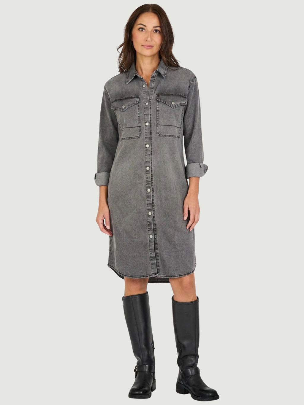 Vår langermede cowboykjole er et allsidig valg som enkelt kan tilpasses ulike anledninger. Ønsker du et enkelt og avbalansert uttrykk, kan du style kjolen med flate sko og en skulderveske. Til festlige begivenheter kan du gi kjolen et løft ved å kombinere den med hæler og en elegant clutch og oppnå et raffinert, men likevel uformelt uttrykk.