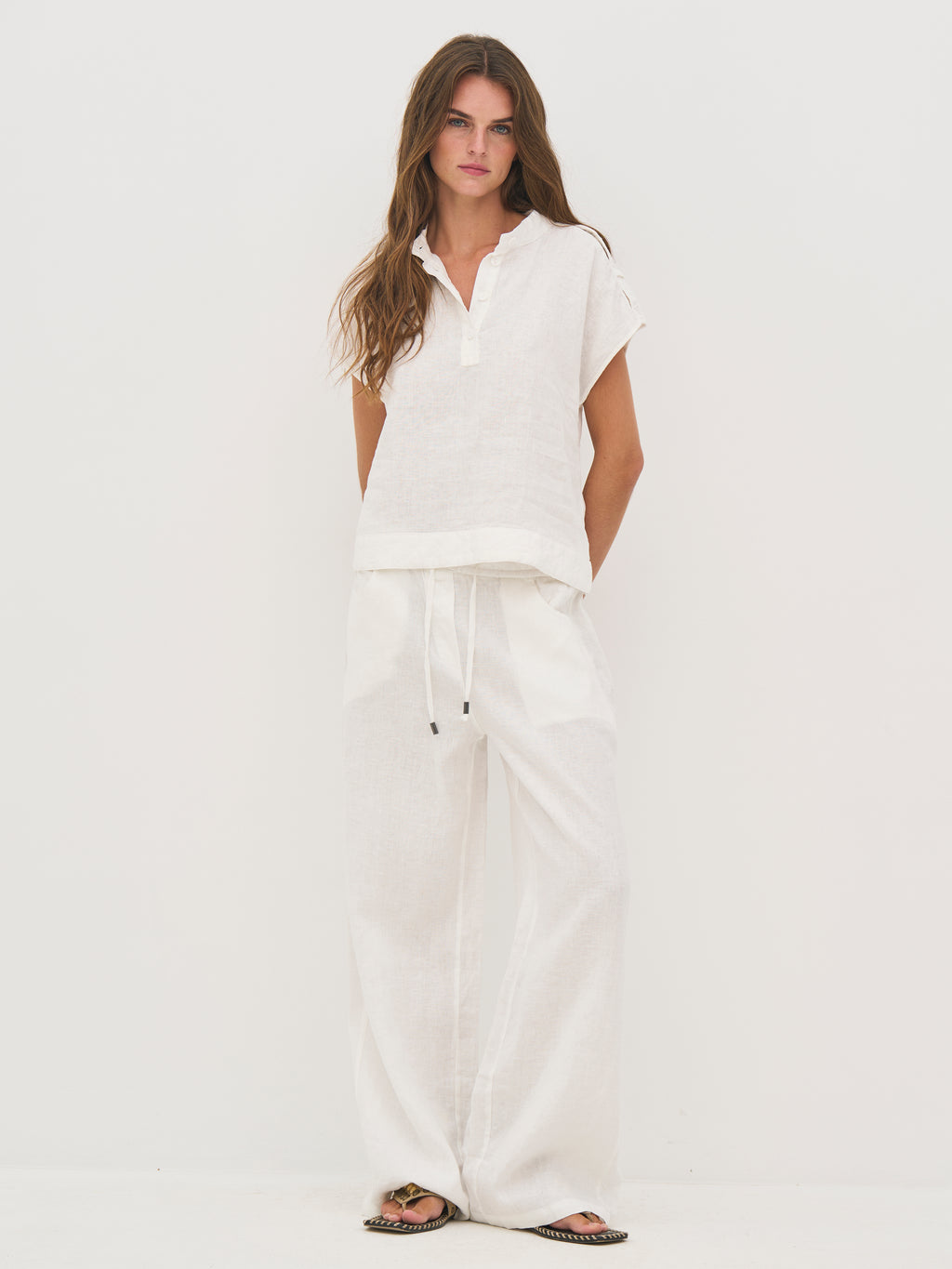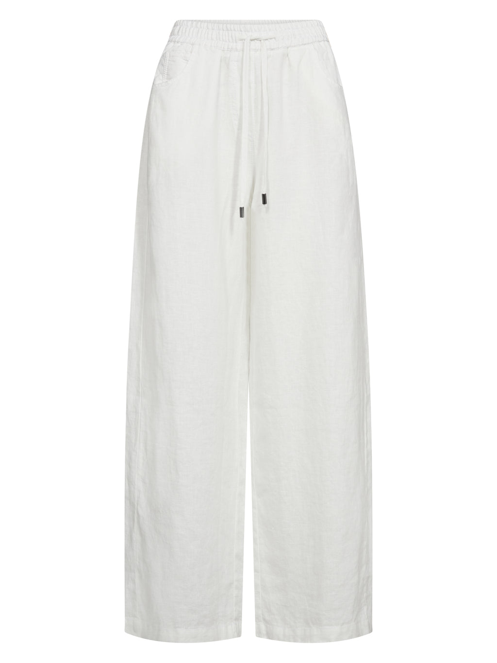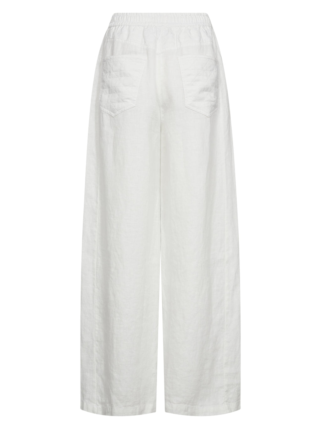 Disse buksene er laget i lin, noe som gjør dem lette og pustende - ideelle for varme dager. De har en avslappet passform med vide ben som faller løst og gir god bevegelsesfrihet. Livet er elastisk med snøring, slik at passformen enkelt kan justeres. De subtile søm-detaljene legger til et rolig spill på overflaten, mens designet på baksiden forblir enkelt.
