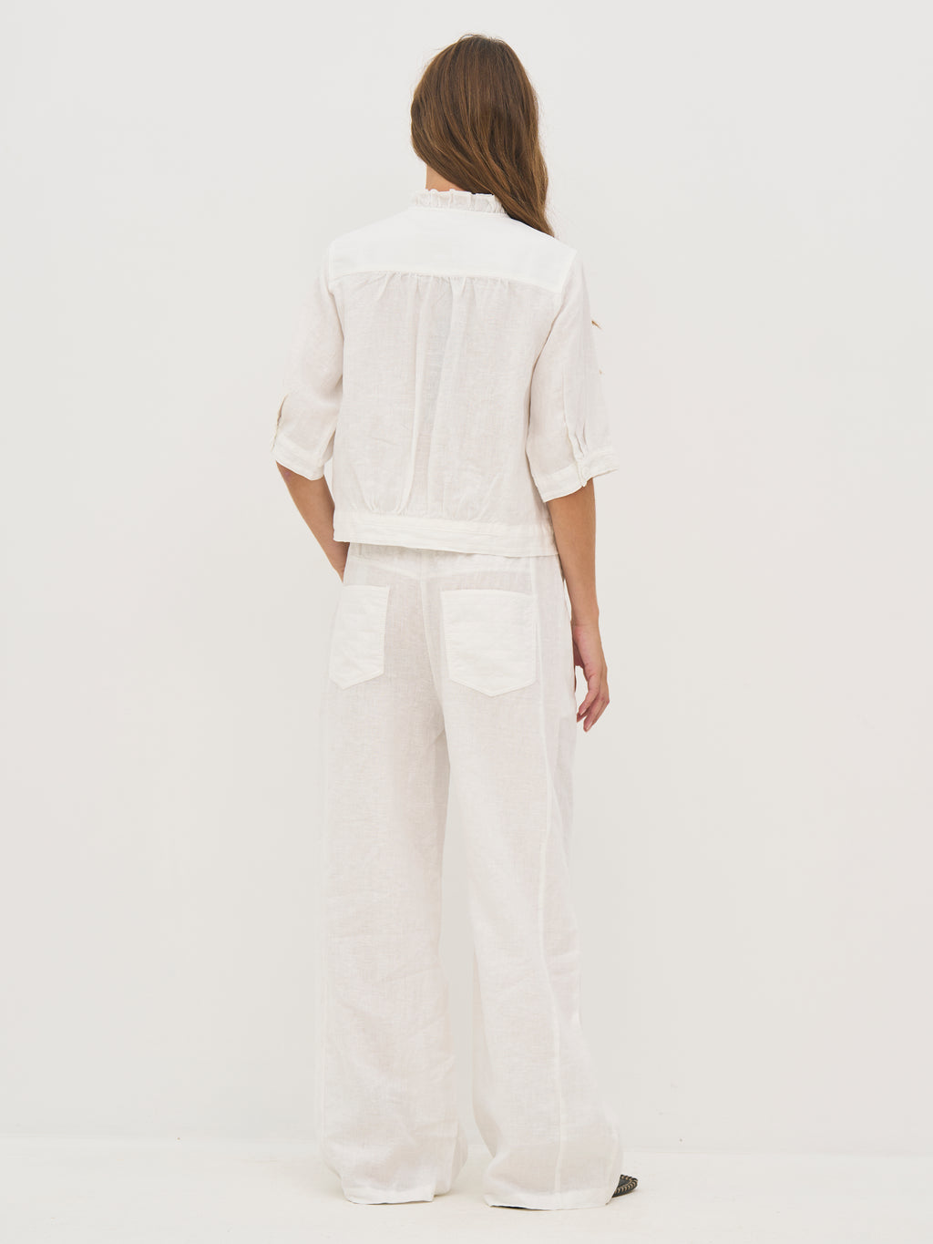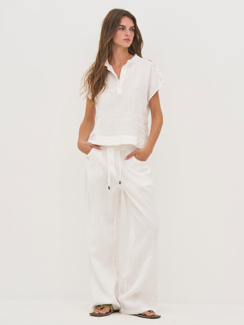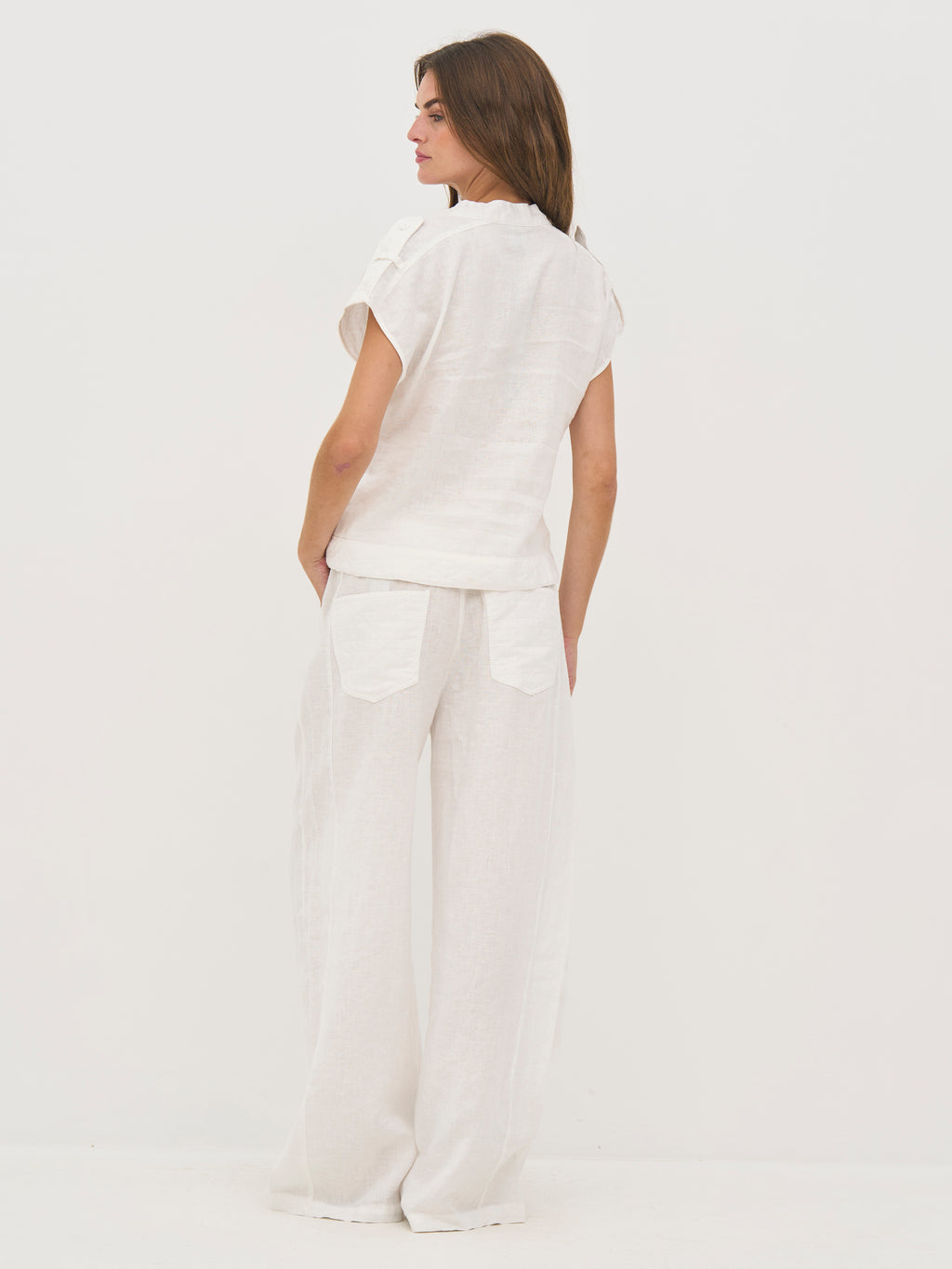 Disse buksene er laget i lin, noe som gjør dem lette og pustende - ideelle for varme dager. De har en avslappet passform med vide ben som faller løst og gir god bevegelsesfrihet. Livet er elastisk med snøring, slik at passformen enkelt kan justeres. De subtile søm-detaljene legger til et rolig spill på overflaten, mens designet på baksiden forblir enkelt.