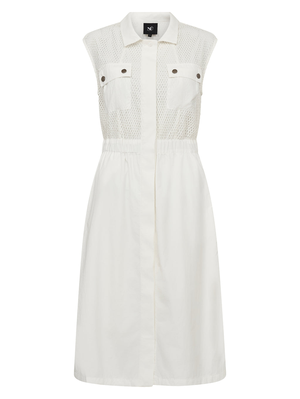 Denne kjolen har et lett og luftig uttrykk, som gjør den ideell for varme dager. Overdelen er designet i en strukturert, åpen strikk med innvendig foring, som gir et dekket og komfortabelt utseende. De to brystlommene med trykknapp legger til et moderne og funksjonelt element, mens elastikken i midjen skaper en lett markert silhuett. Bak fortsetter det enkle designet med en avslappet fall.