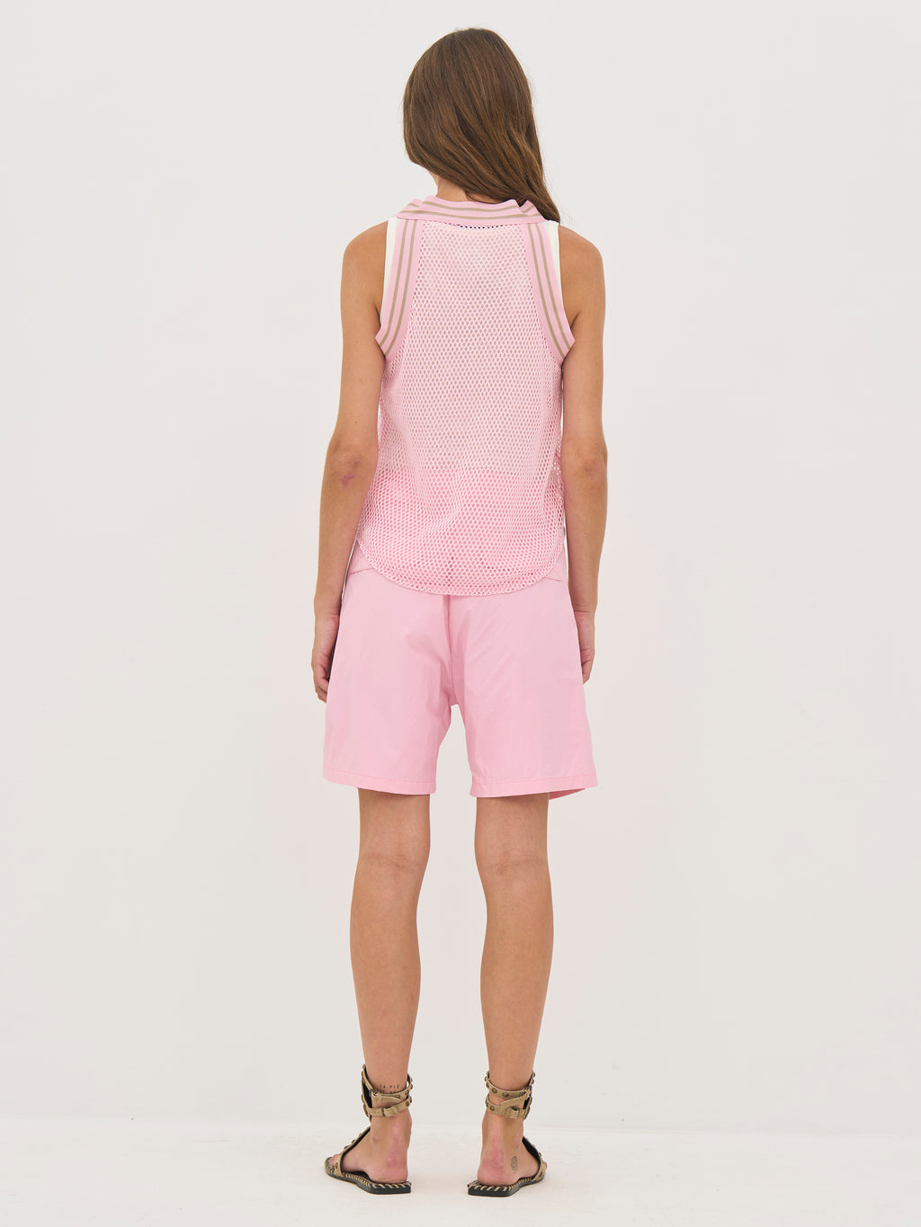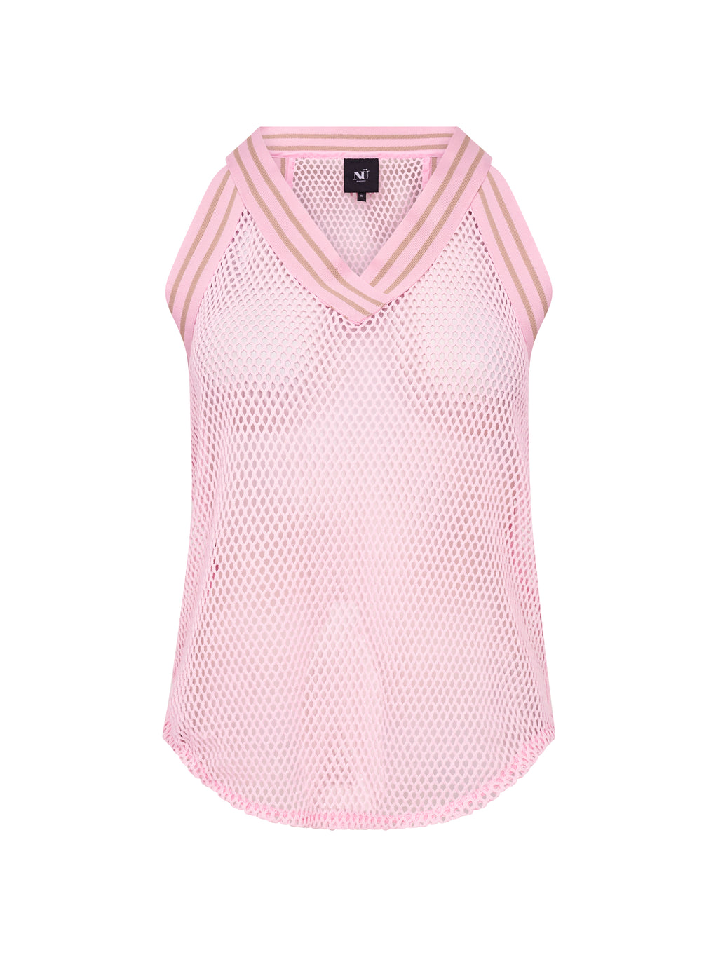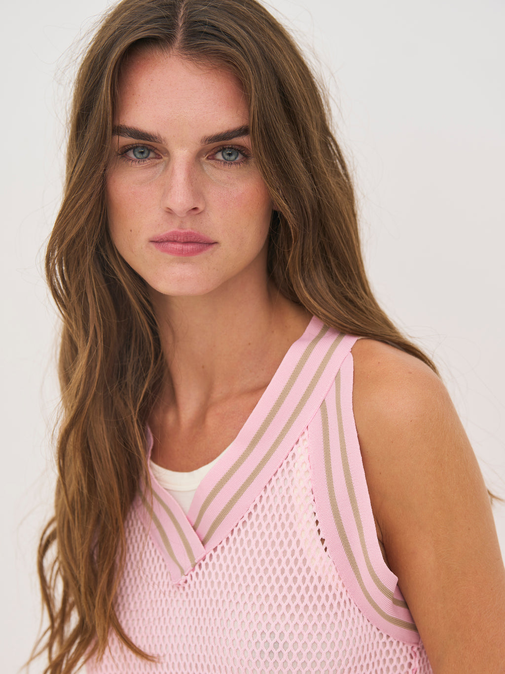 Denne toppen har et lett og luftig utseende med en strukturert kvalitet som gjør den ideell for lag-på-lag. Den er designet med en sporty V-utringning med en elastisk kant som tilfører et moderne preg. Den ermeløse silhuetten gir et avslappet utseende, mens den avrundede kanten nederst skaper et mykt fall.