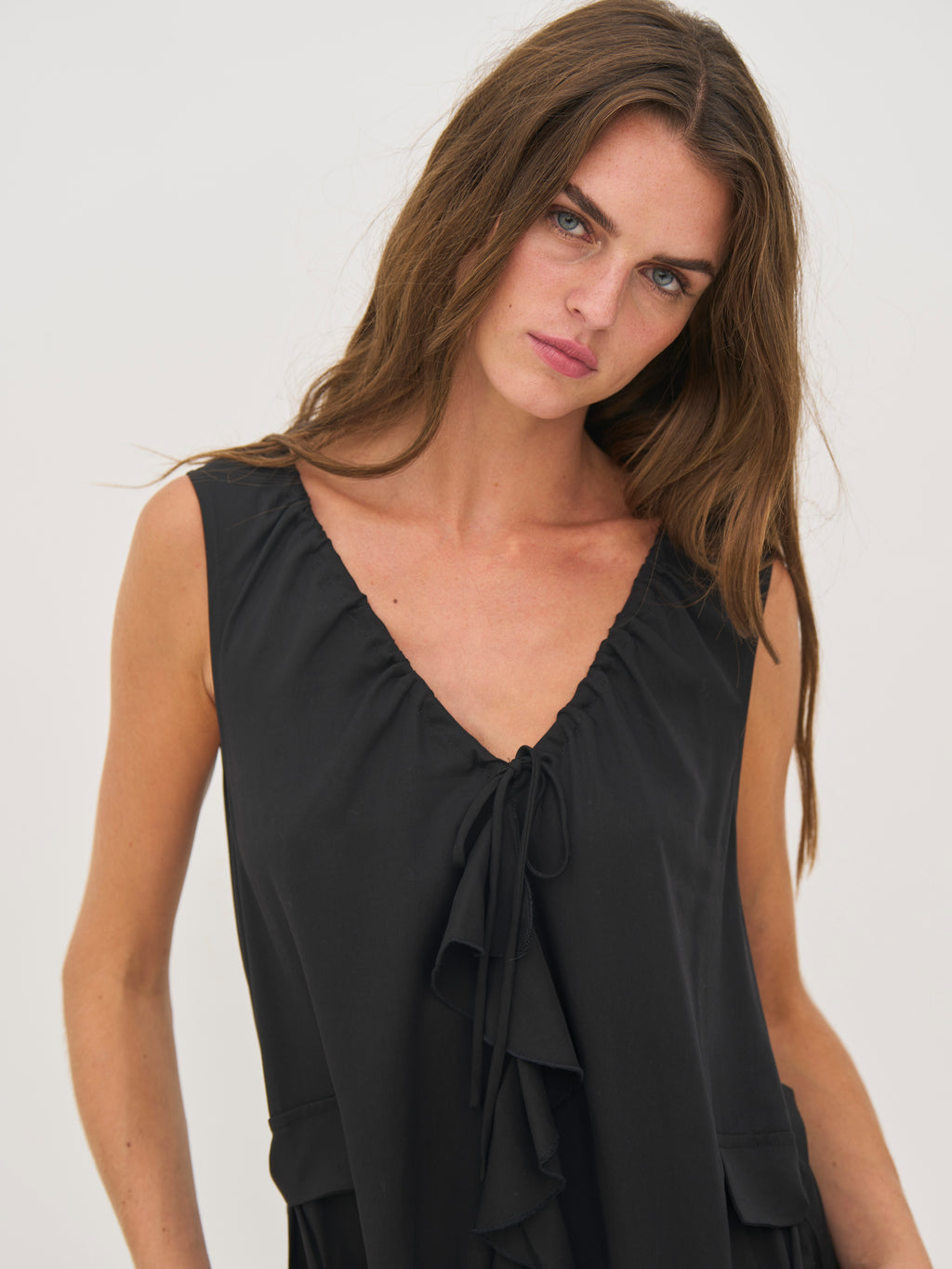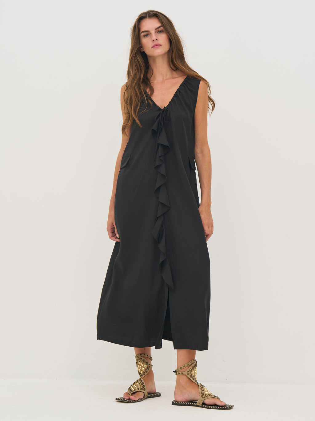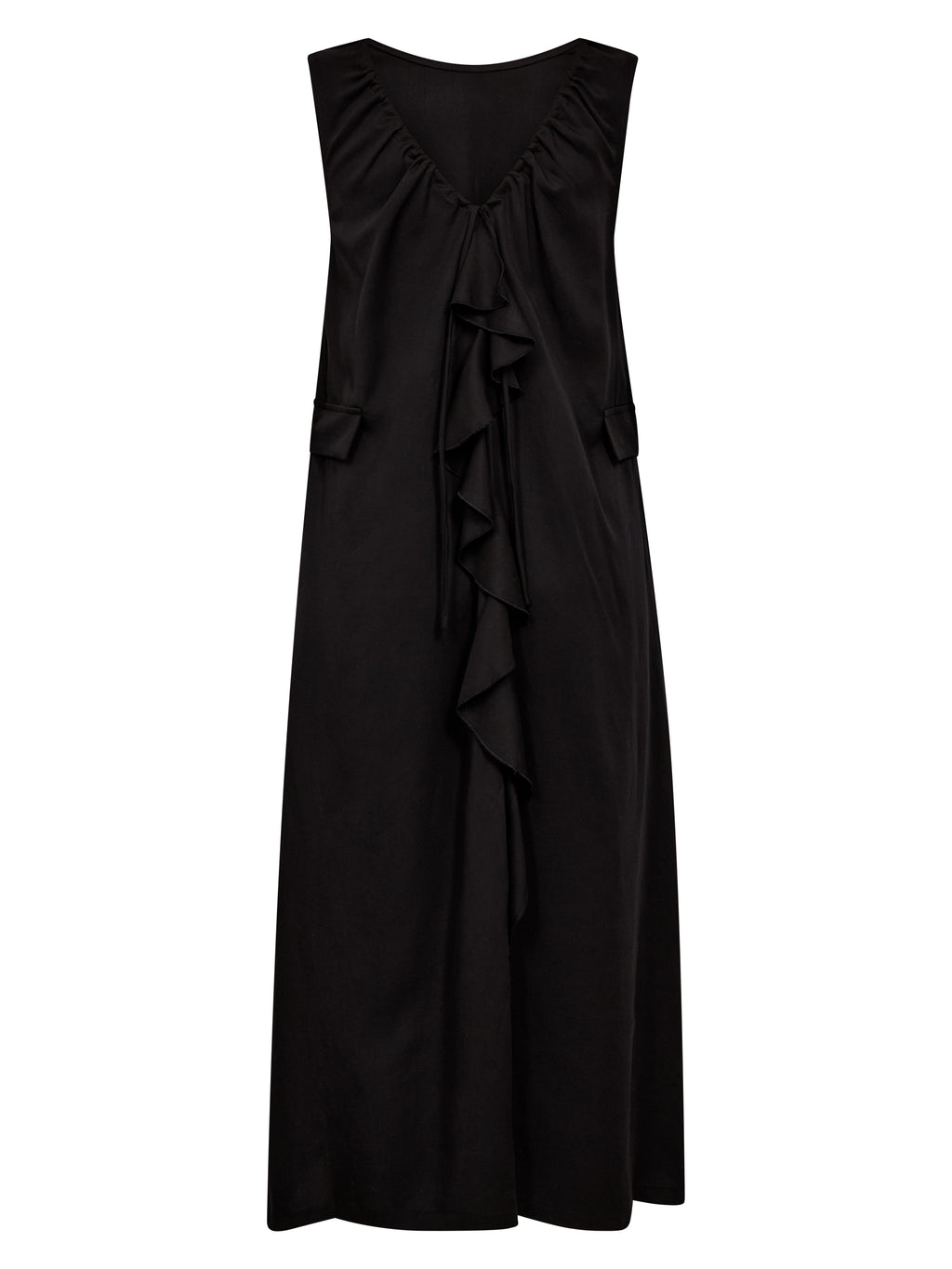 Kjolen faller lett og elegant med sitt myke, pustende materiale som føles behagelig mot huden. Den ermeløse silhuetten og den avslappede A-linjen gir et ubesværet utseende, mens rysjedetaljen foran legger til bevegelse og et feminint preg. Praktiske sidelommer fullfører designet med en diskret funksjonalitet. Stil den med sandaler for varme dager eller legg til lag for et mer personlig uttrykk.