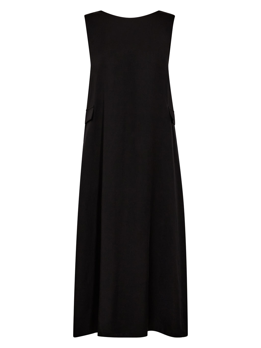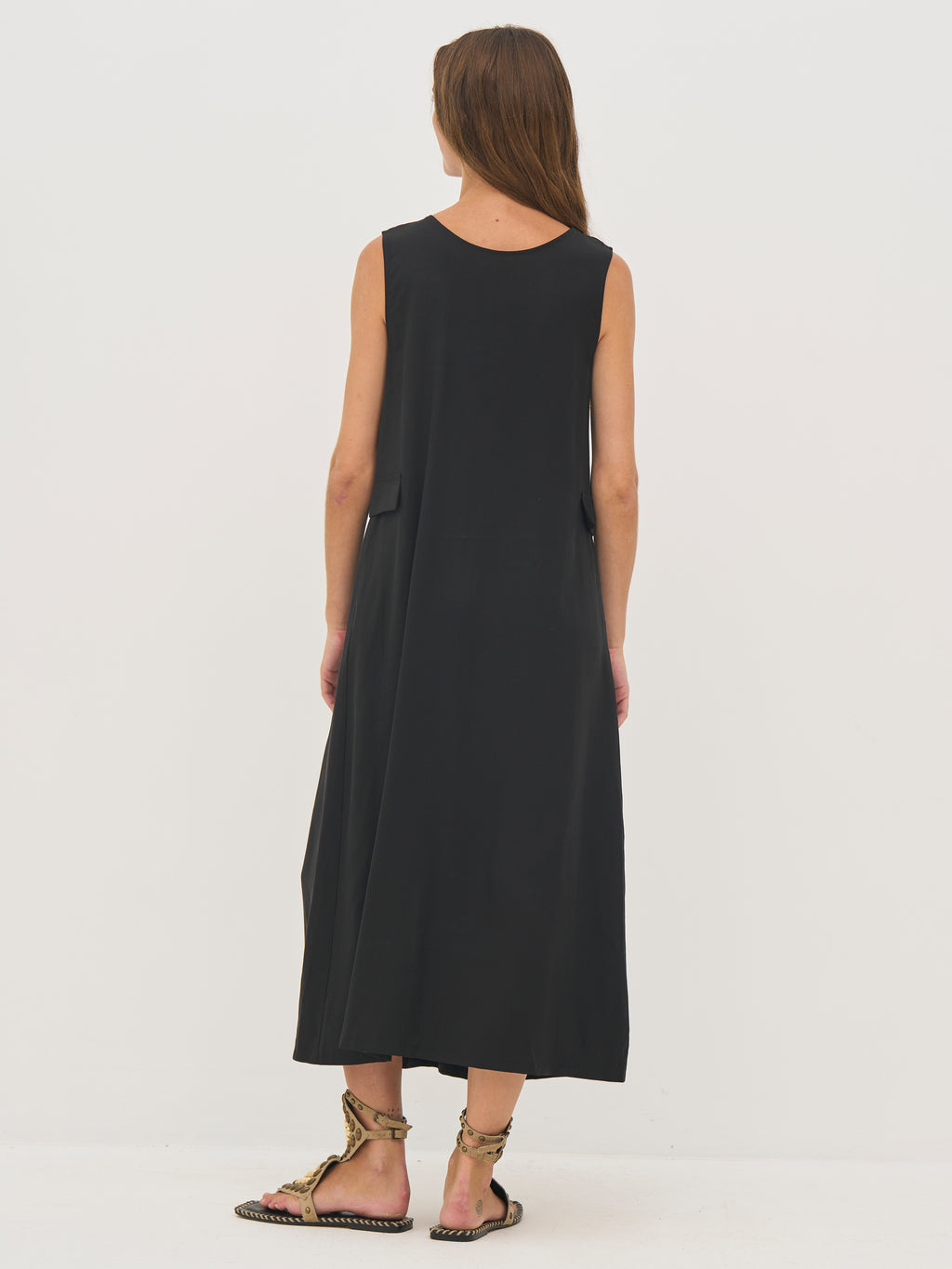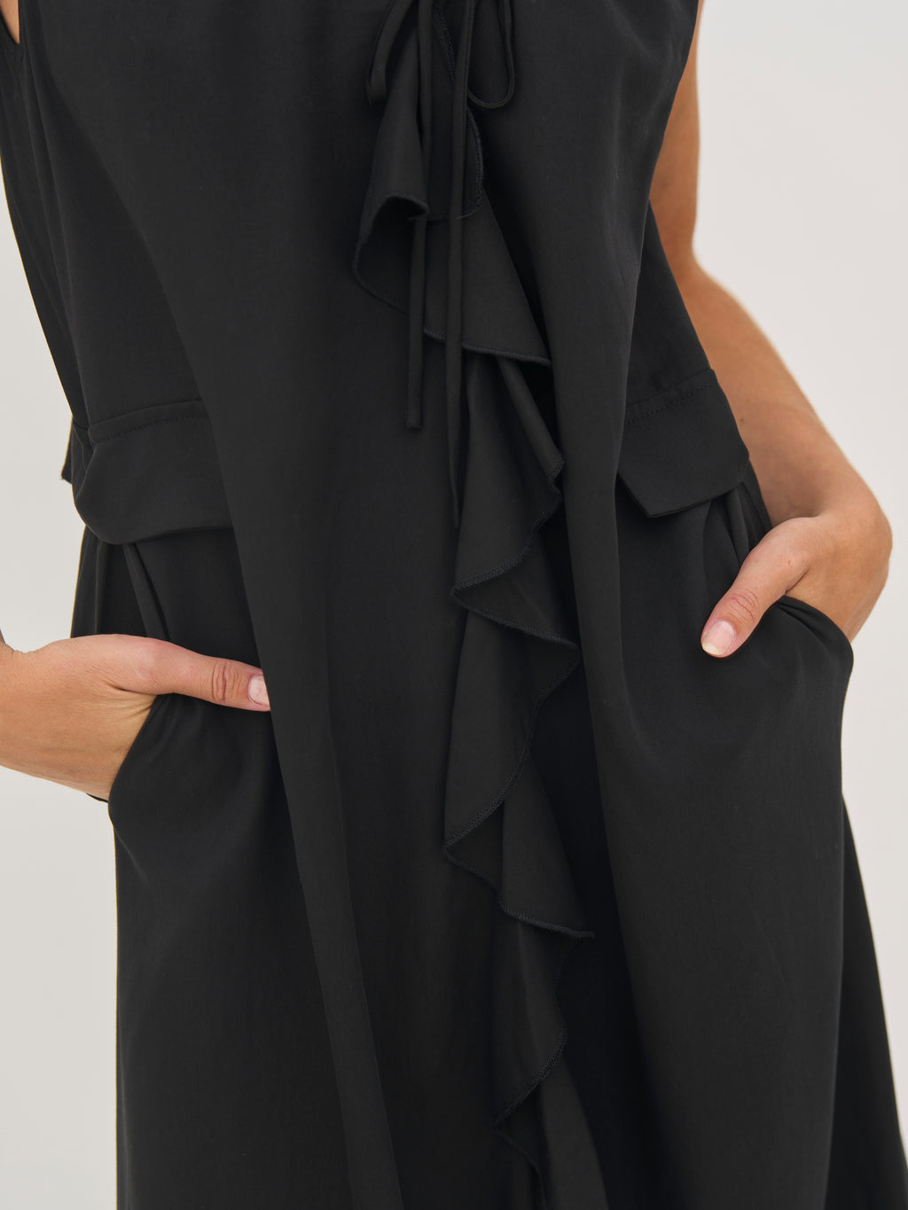 Kjolen faller lett og elegant med sitt myke, pustende materiale som føles behagelig mot huden. Den ermeløse silhuetten og den avslappede A-linjen gir et ubesværet utseende, mens rysjedetaljen foran legger til bevegelse og et feminint preg. Praktiske sidelommer fullfører designet med en diskret funksjonalitet. Stil den med sandaler for varme dager eller legg til lag for et mer personlig uttrykk.