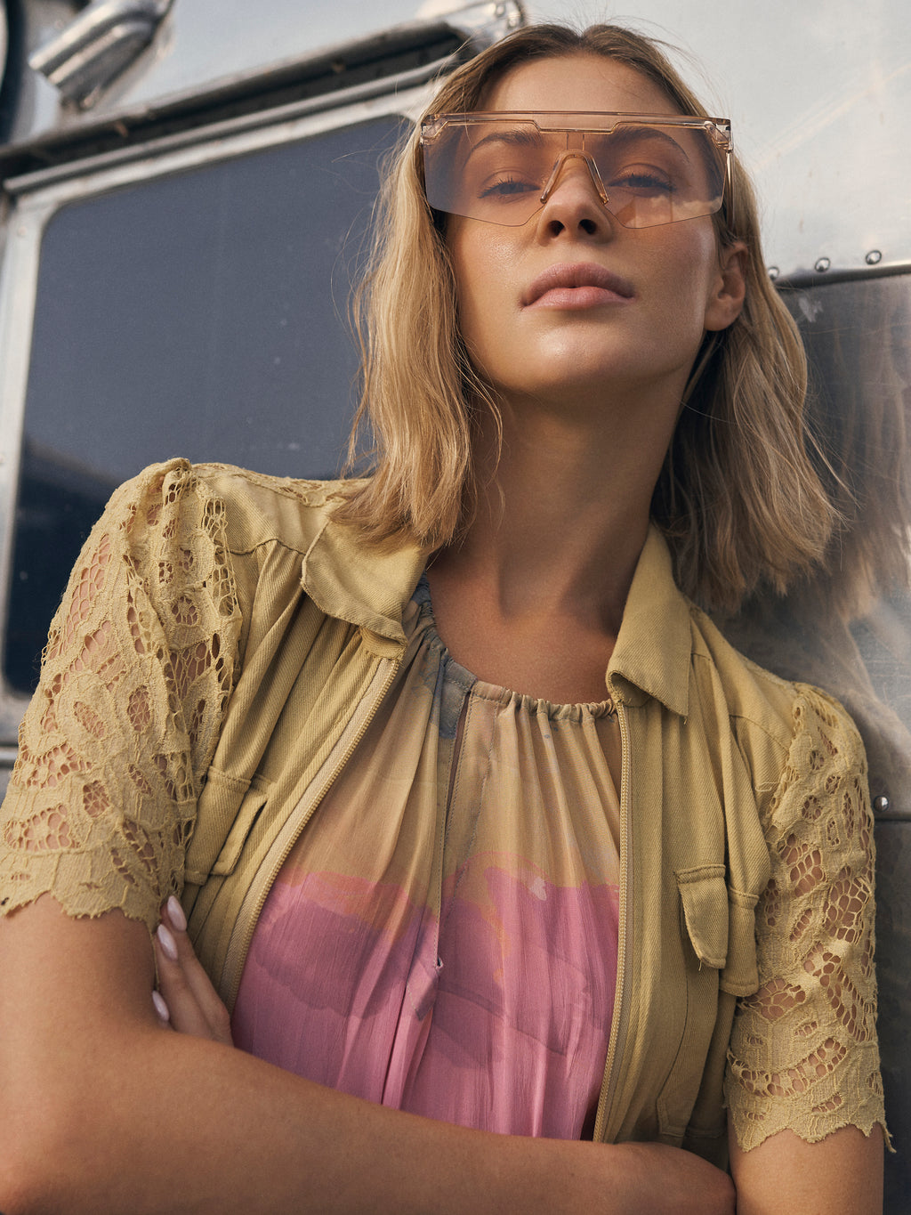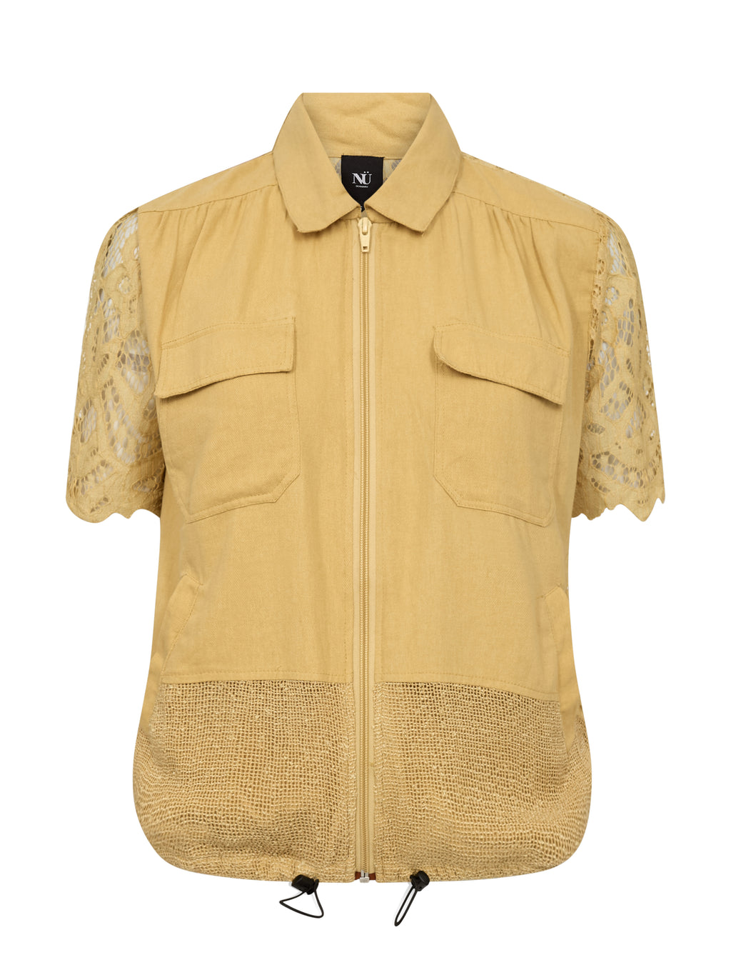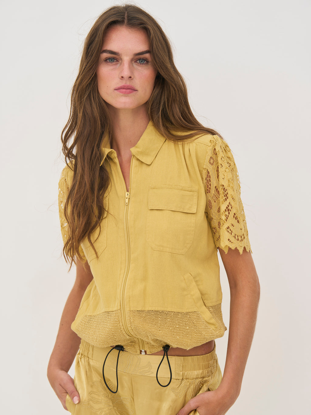 Denne korte jakken er laget av en bomull- og viskoseblanding og kombinerer ulike teksturer, noe som gir et spennende og moderne utseende. Forsiden har et mer strukturert utseende med glidelås og brystlommer, som gir et funksjonelt preg, mens de lett transparente blonde detaljene på ermene og ryggen skaper en feminin kontrast.