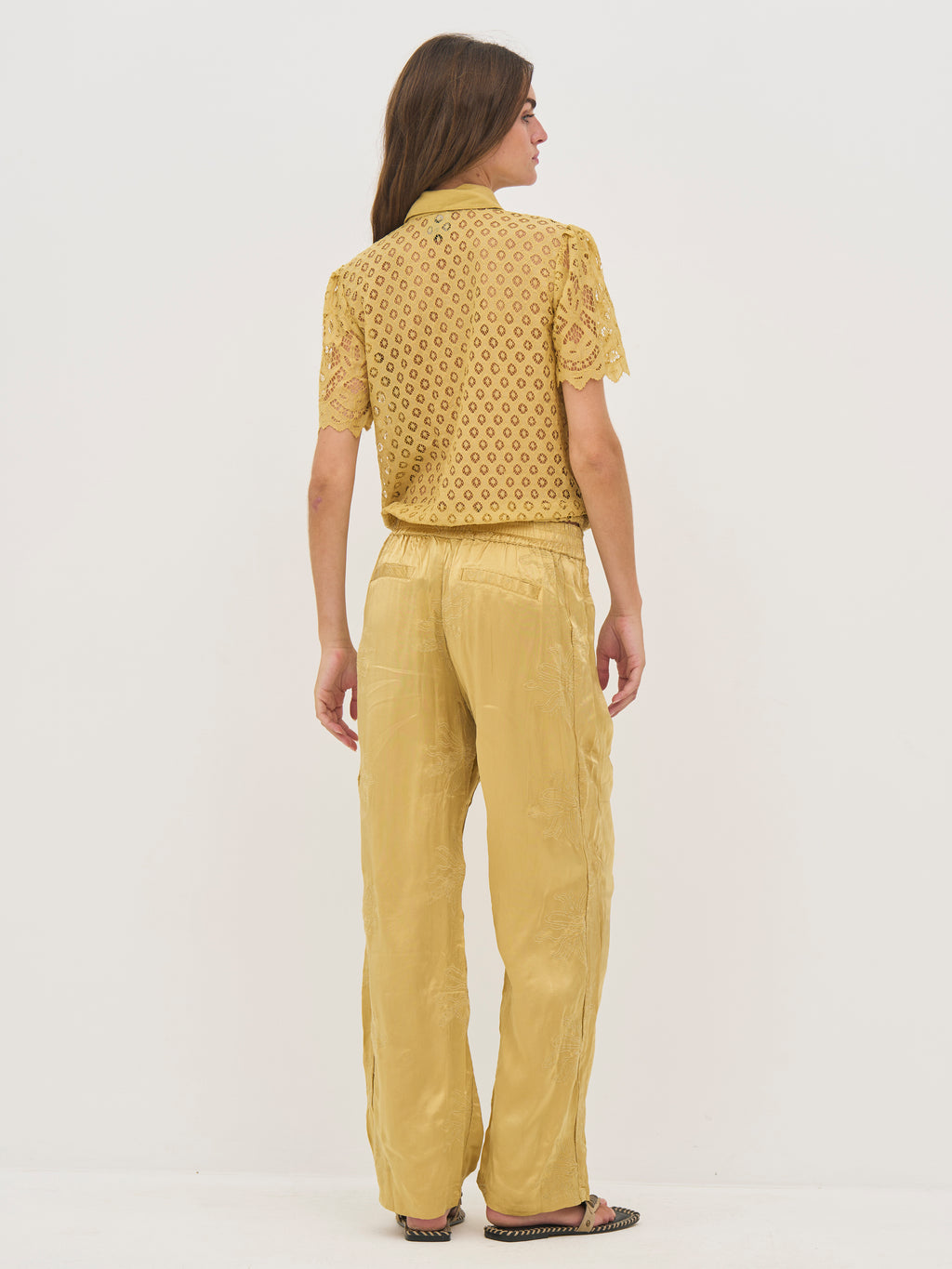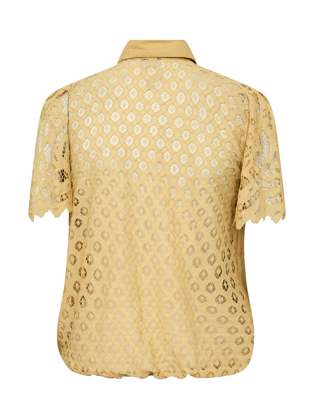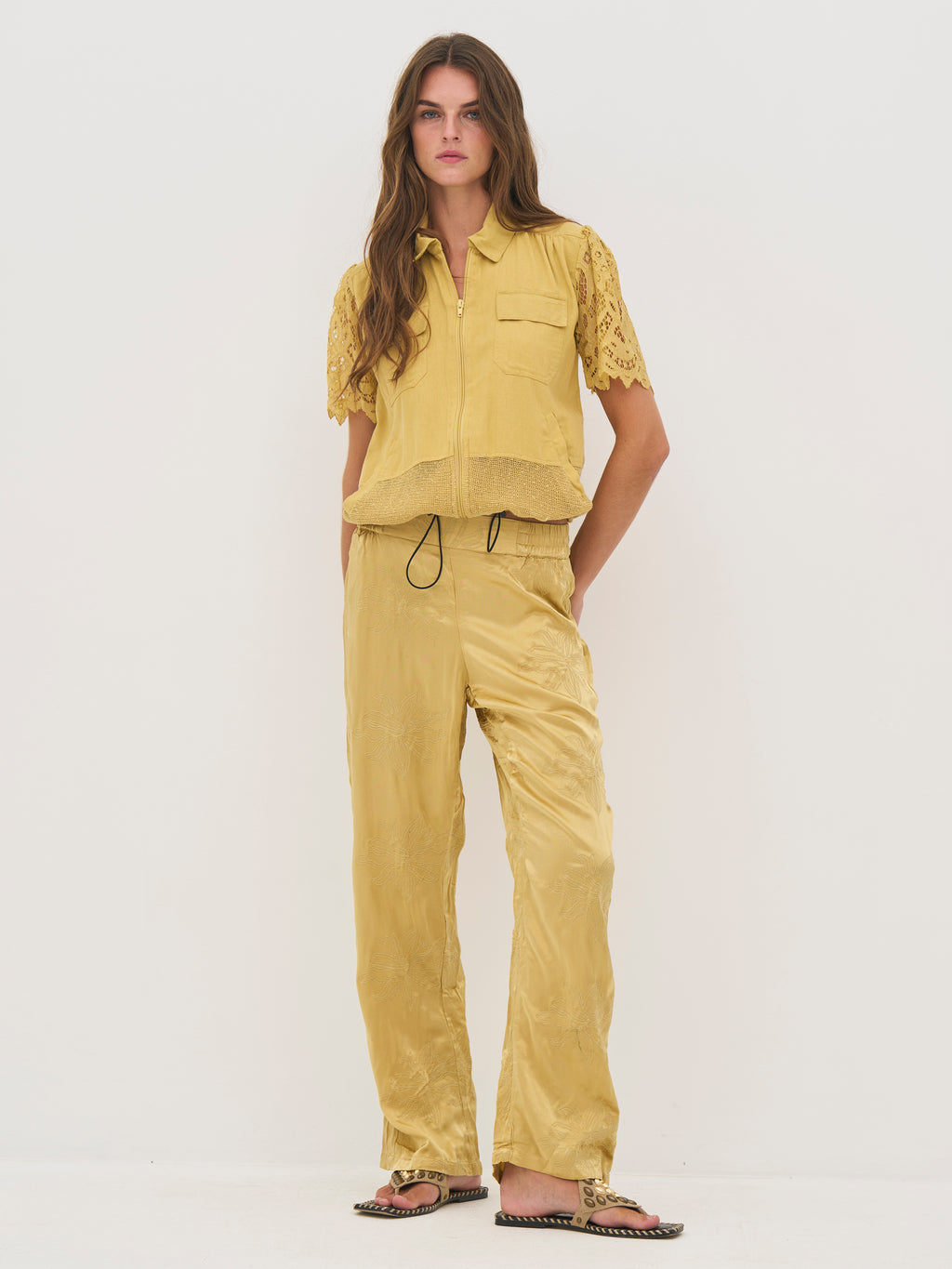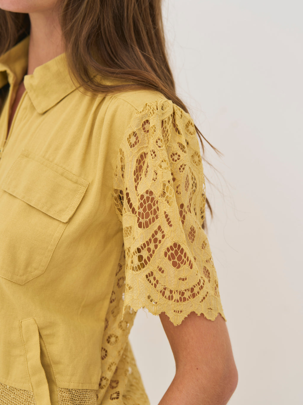 Denne korte jakken er laget av en bomull- og viskoseblanding og kombinerer ulike teksturer, noe som gir et spennende og moderne utseende. Forsiden har et mer strukturert utseende med glidelås og brystlommer, som gir et funksjonelt preg, mens de lett transparente blonde detaljene på ermene og ryggen skaper en feminin kontrast.