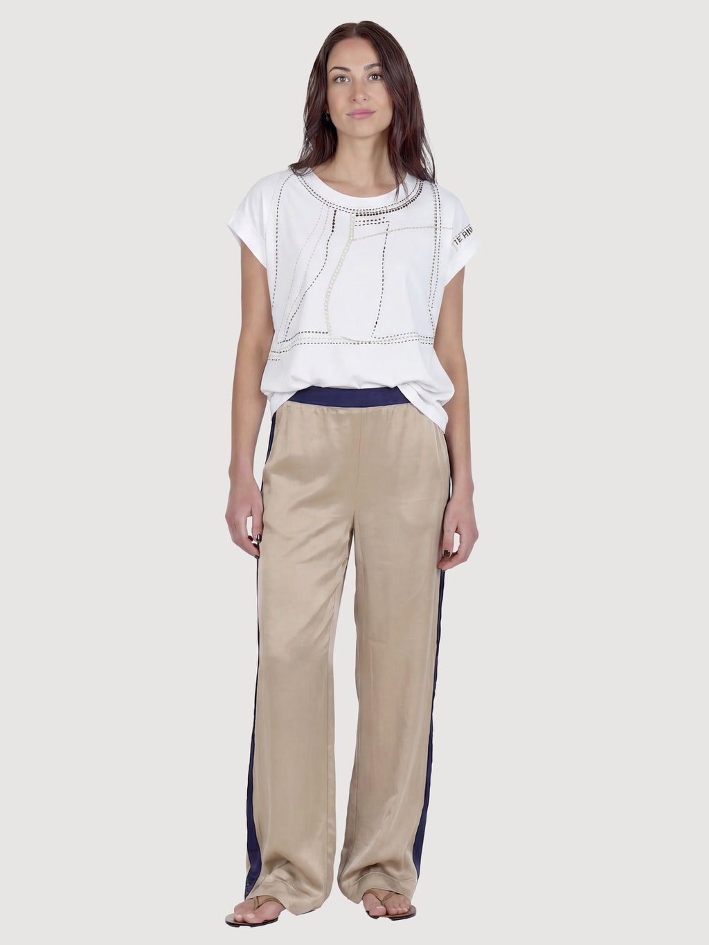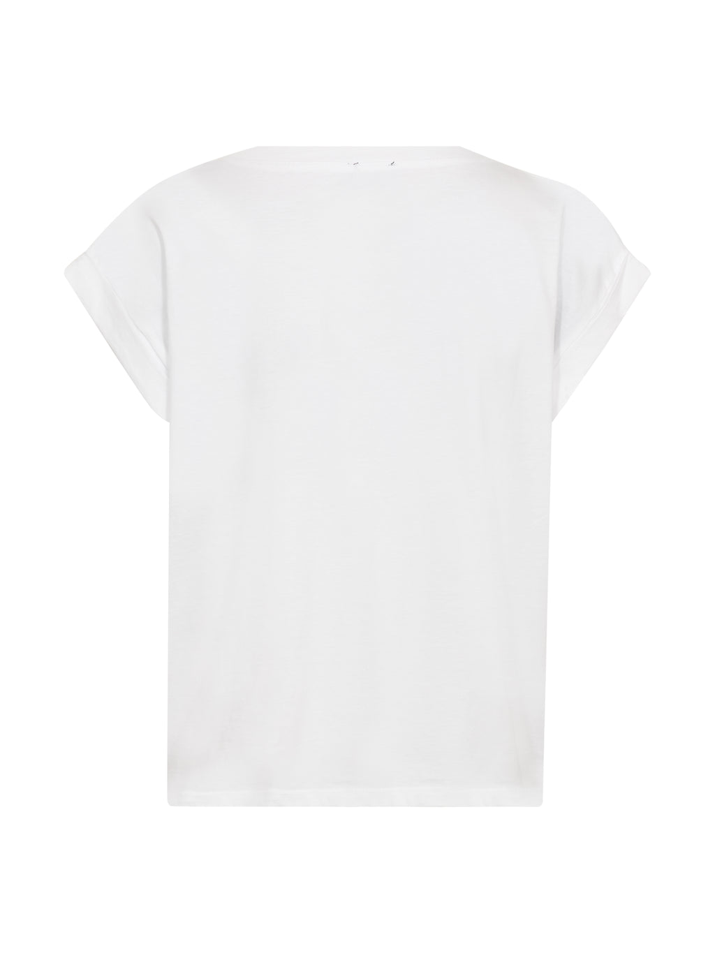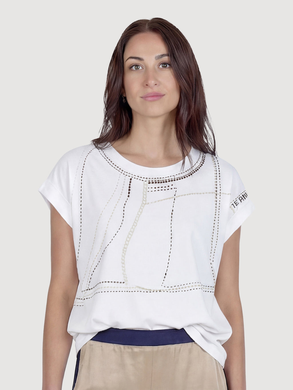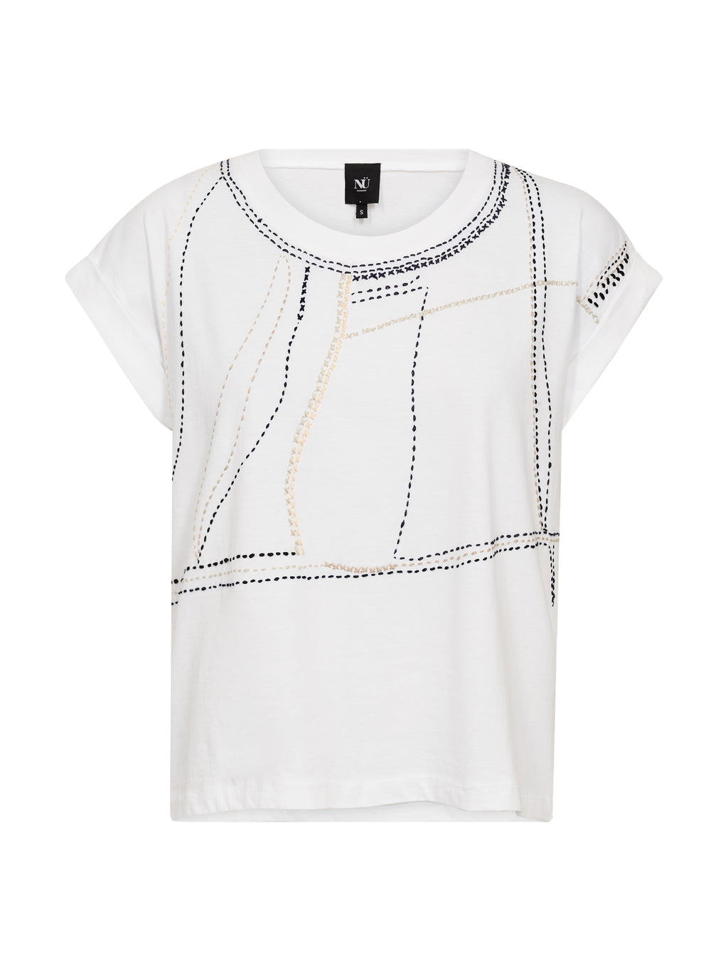 Denne T-skjorten er laget av en myk bomullskvalitet som gjør den behagelig og pustende for daglig bruk. Den har en enkel og tidløs uttrykk med rund halsutringning og en rett passform som faller rolig langs kroppen. De opprullede korte ermene gir et avslappet preg, mens broderiet foran tilfører et unikt og grafisk element. Bakdesignet er holdt enkelt. Styl T-skjorten med jeans eller en skjørt for en ubesværet hverdagslook, eller bruk den under en jakke for et lag-på-lag uttrykk.
