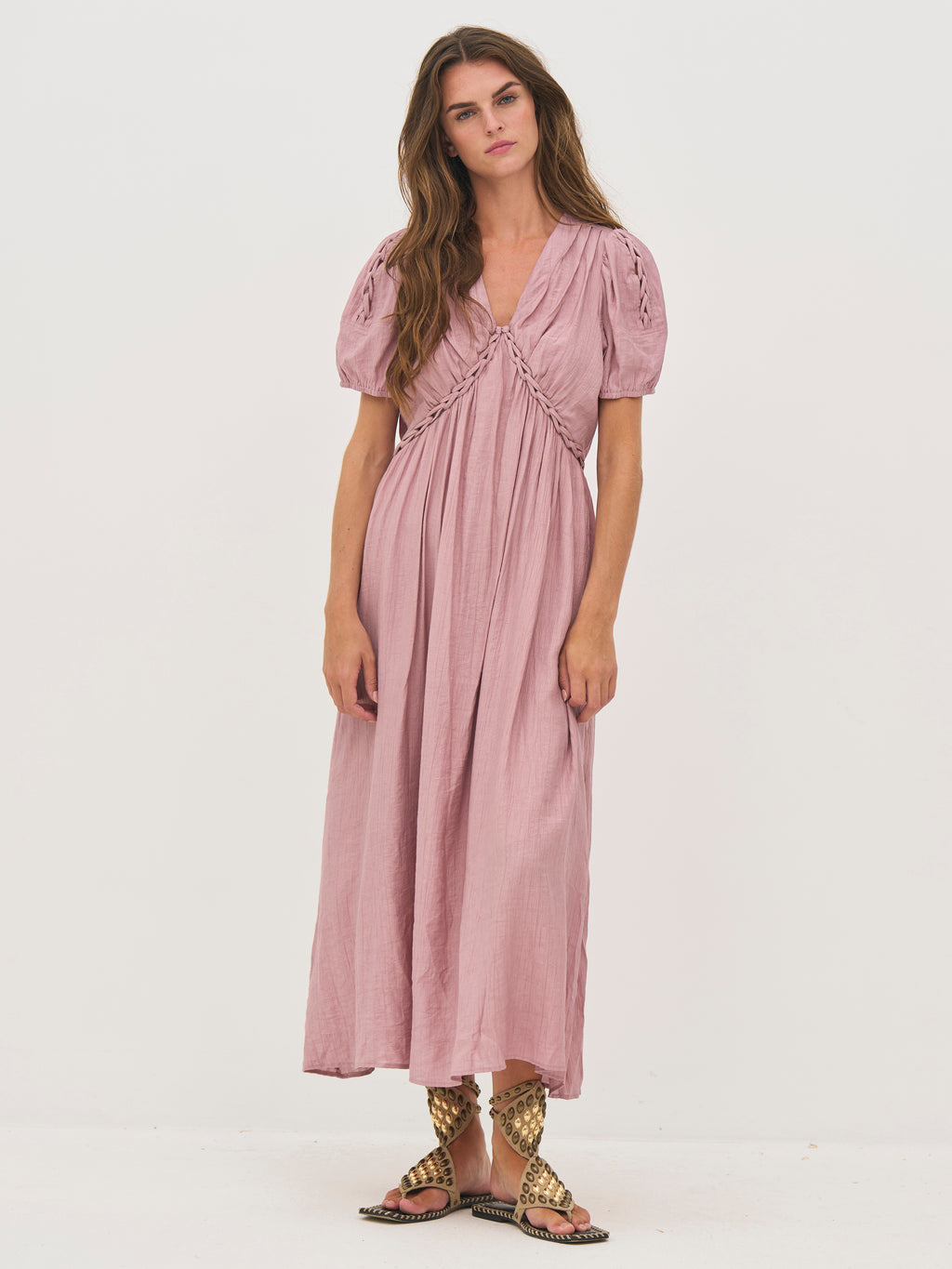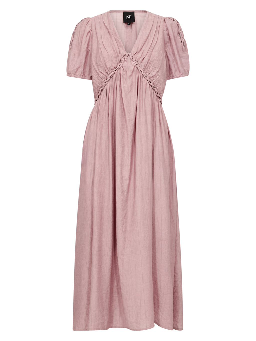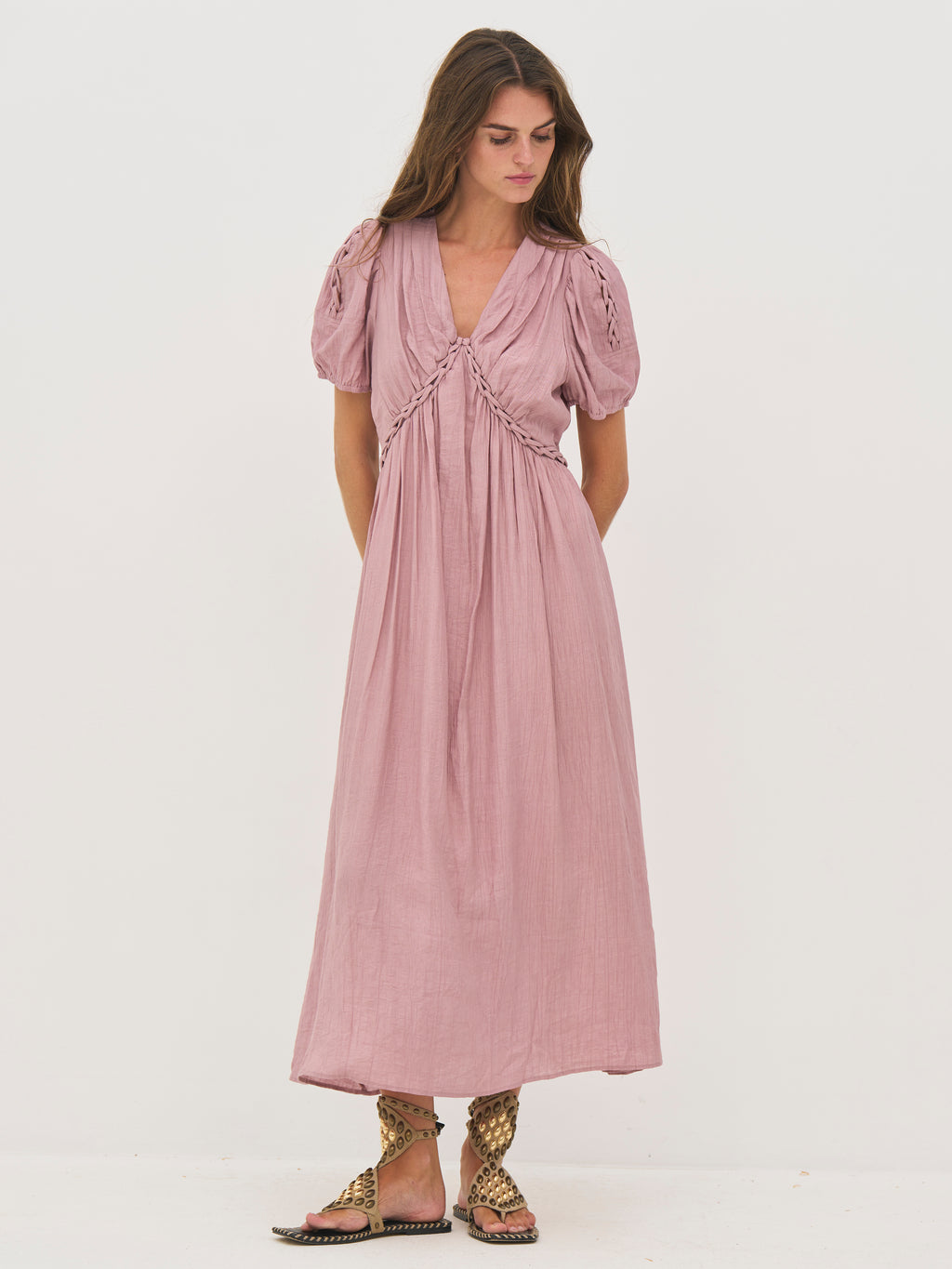 Denne kjolen er laget av en lett viskoseblanding med crepe, som gir en myk og luftig fall. Den har en V-utringning med flettet detalj foran, som gir struktur og et feminint uttrykk. De korte puffermene med fine detaljer fremhever det lette og elegante utseende.