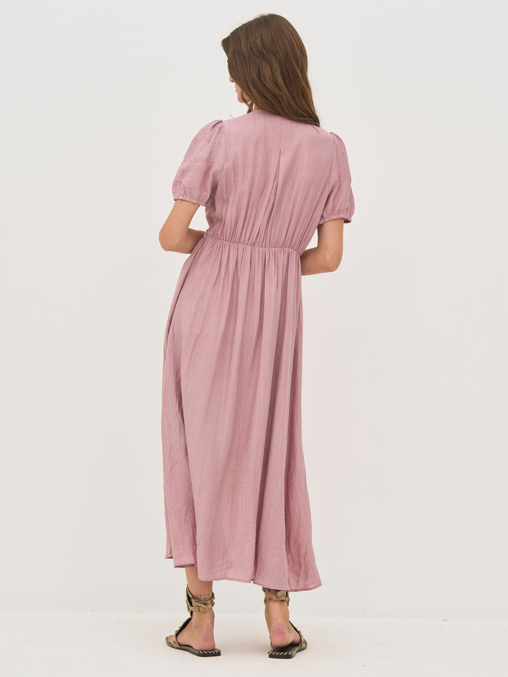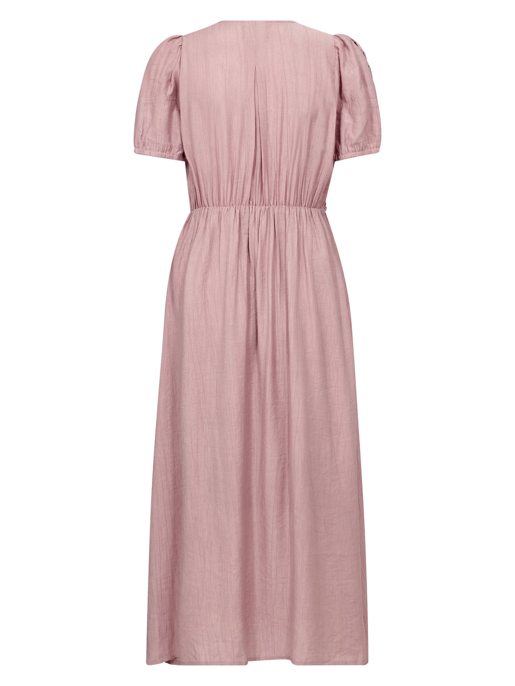 Elastikk bak i midjen sikrer en behagelig passform og gir kjolen en fin form, mens lengden skaper en rolig og flytende silhuett.