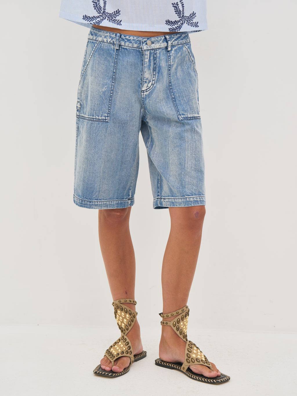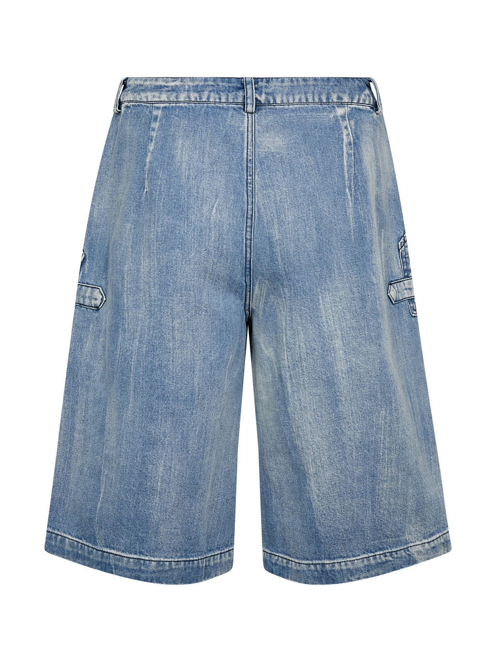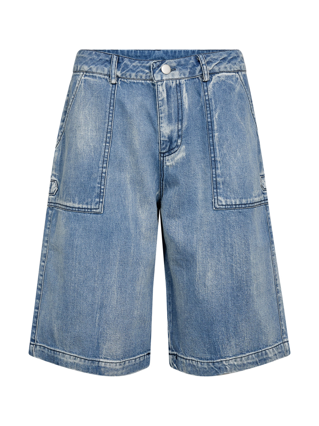 Disse shortsen er laget av myk bomullsdenim med stretch, som gir en behagelig og fleksibel passform. De har en avslappet, knelang silhuett med en lett løs look. De store påsatte lommene foran og bak legger til en funksjonell og moderne touch, mens den lett vaskede finishen understreker det avslappede utseendet. Det enkle designet fortsetter bak.