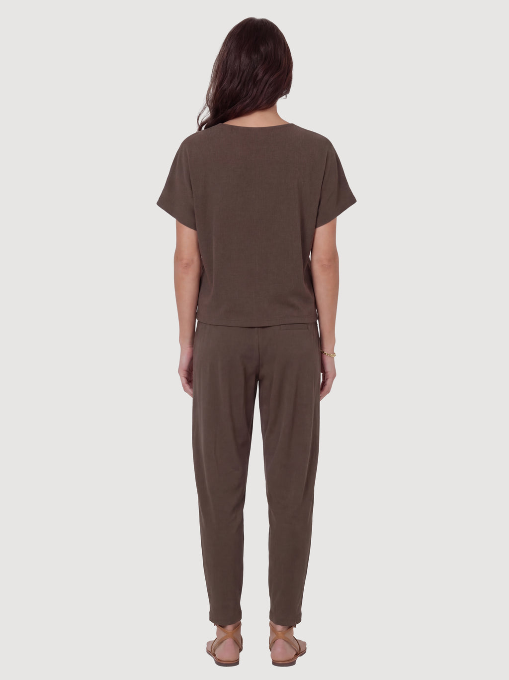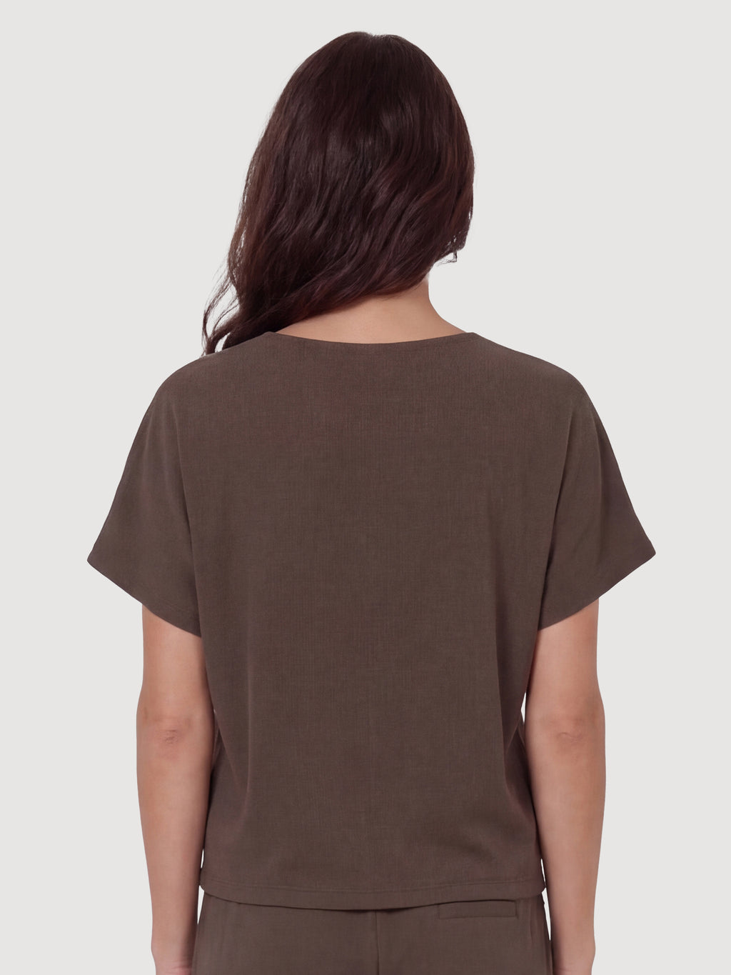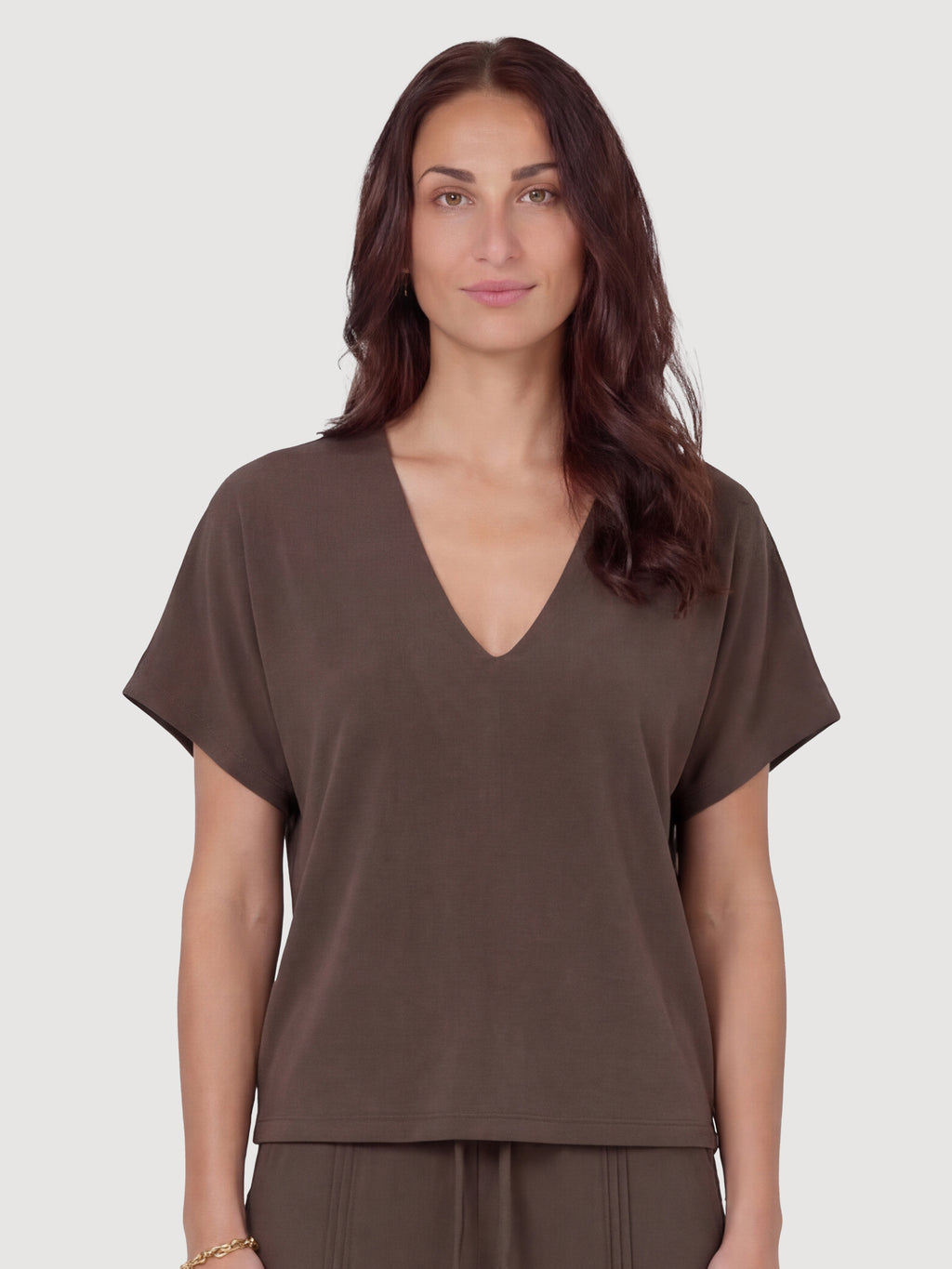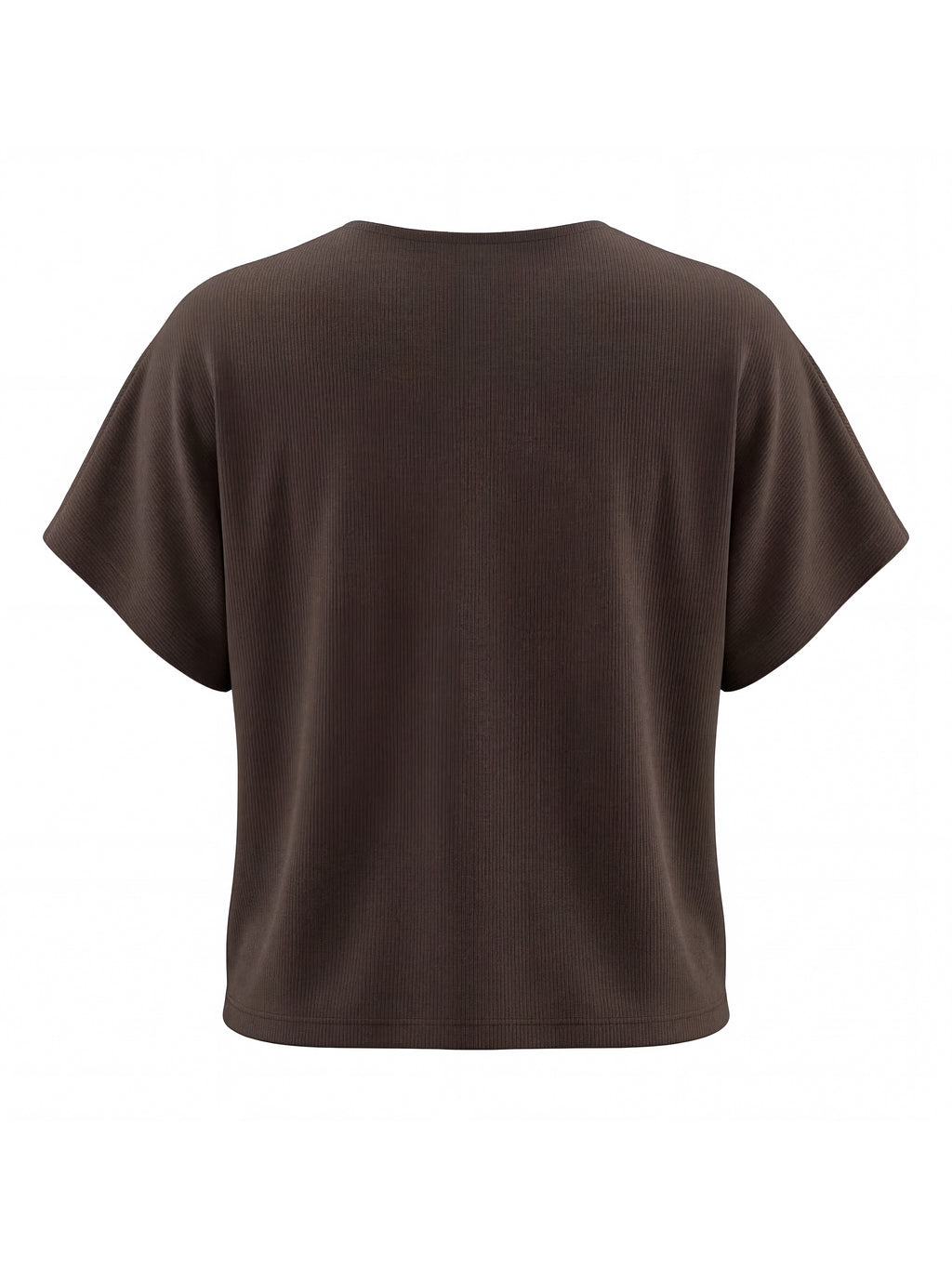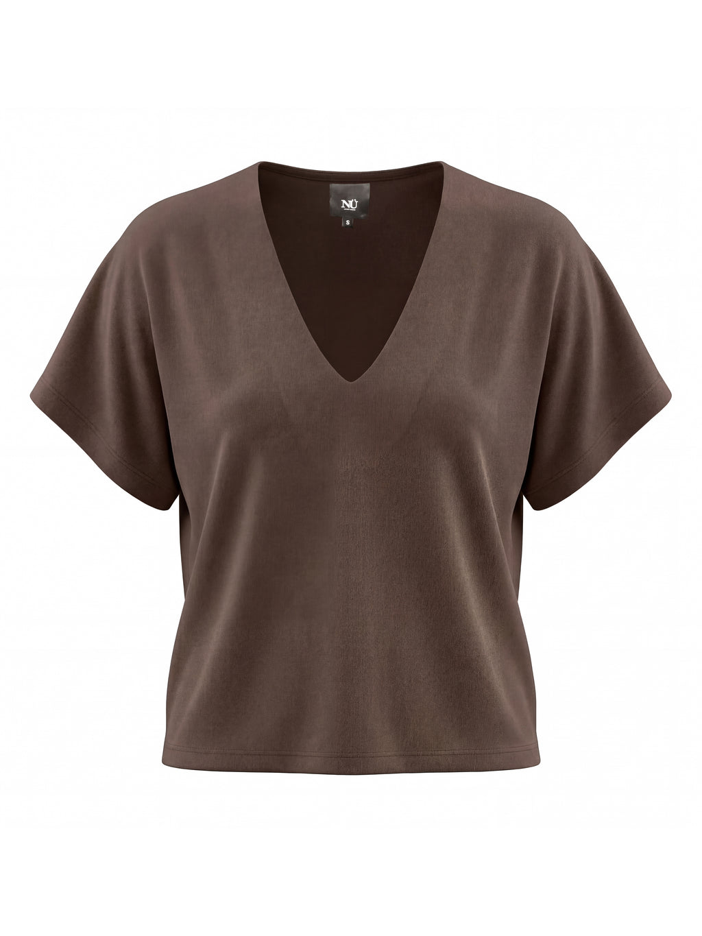 Denne T-skjorten har et enkelt og avslappet utseende med løs passform og korte ermer. Den dype V-halsen foran gir et feminint preg, mens det glatte materialet legger seg mykt langs kroppen. Fra baksiden fortsetter det rene designet med en lett og komfortabel silhuett, noe som gjør den behagelig å ha på hele dagen.