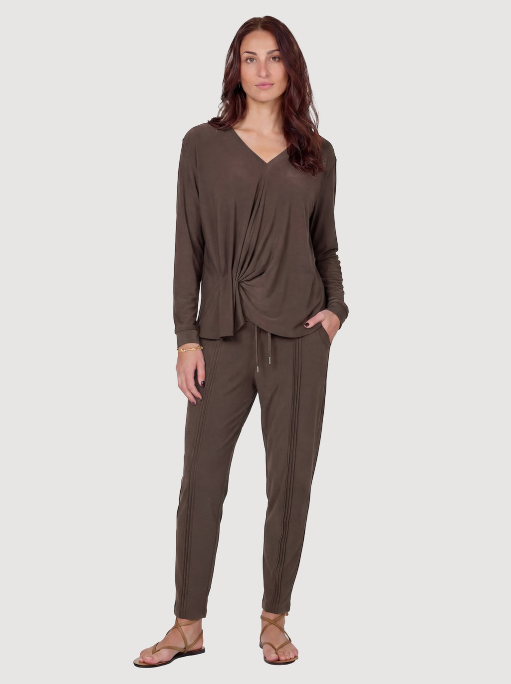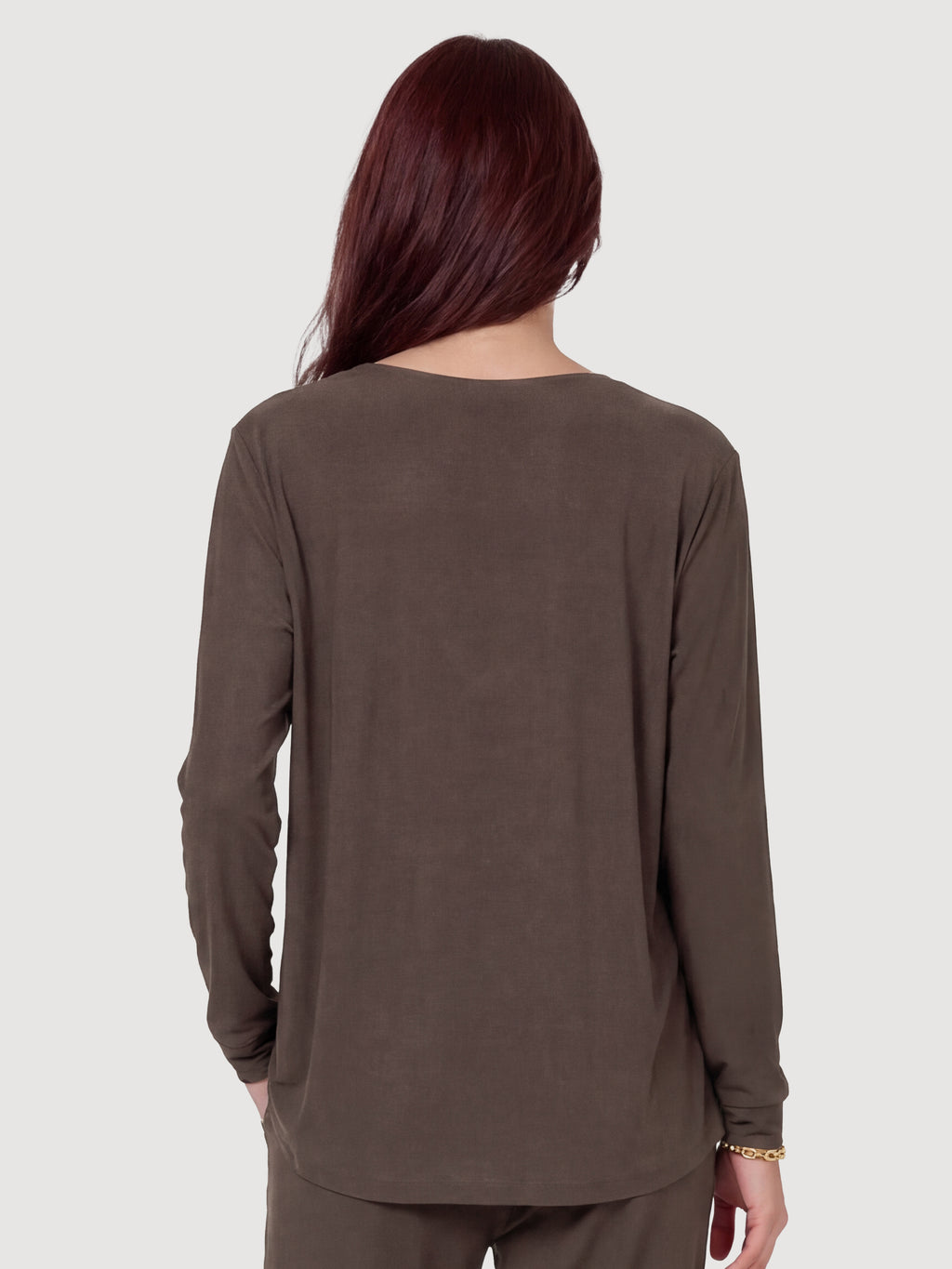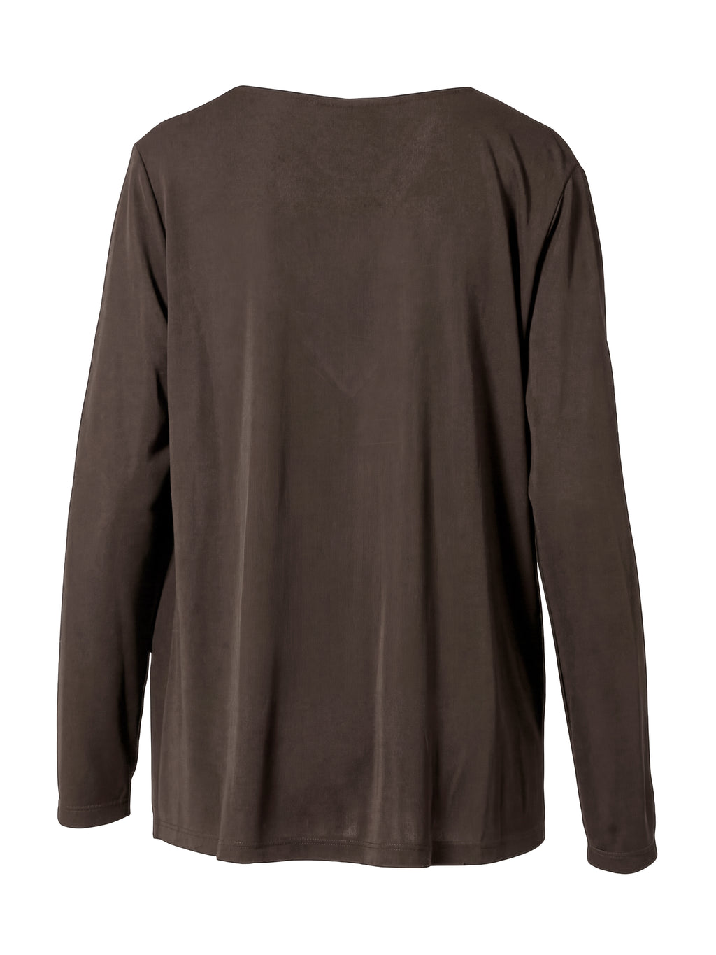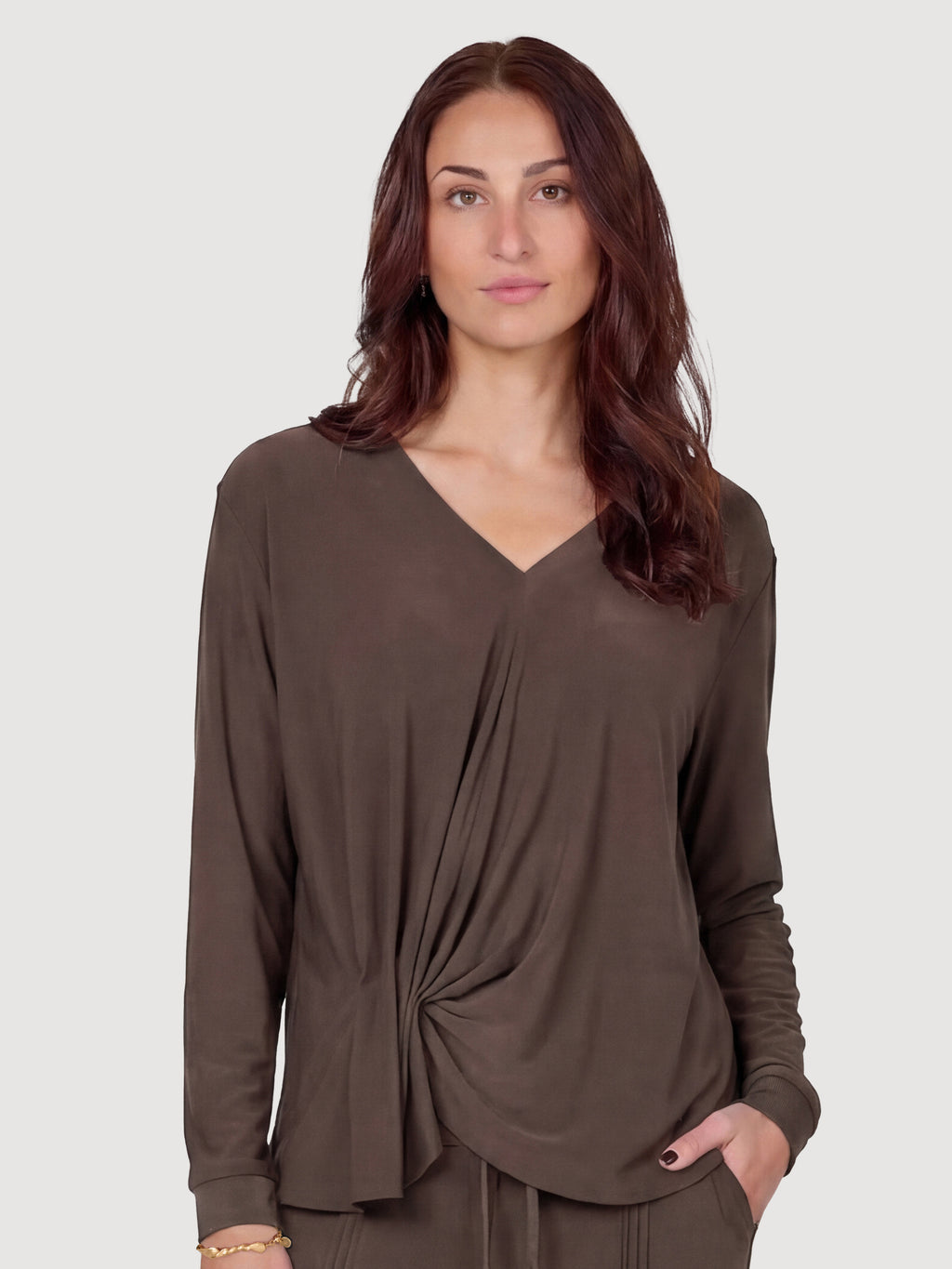 Denne blusen har et elegant og avslappet utseende med en løs passform og en myk drapering. På forsiden blir designet framhevet av en smigrende V-hals og et drapert detalj som skaper en naturlig bevegelse i stoffet. Designet faller forsiktig langs kroppen, mens baksiden er holdt enkelt for et harmonisk og stilig uttrykk.